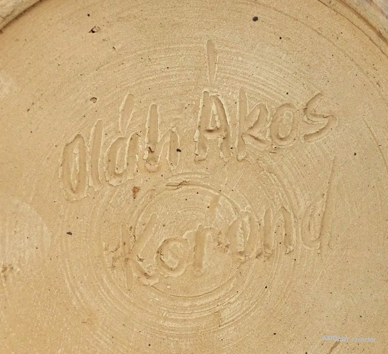 [1O877/X103] Régi, hibátlan állapotú, jelzett kerámia falitányér, fali dísz tányér. Akasztási lehetőséggel rendelkezik. Alján jelzés: OLÁH ÁKOS KOROND Szélesség: 24 cm Súly: 0.59 kg