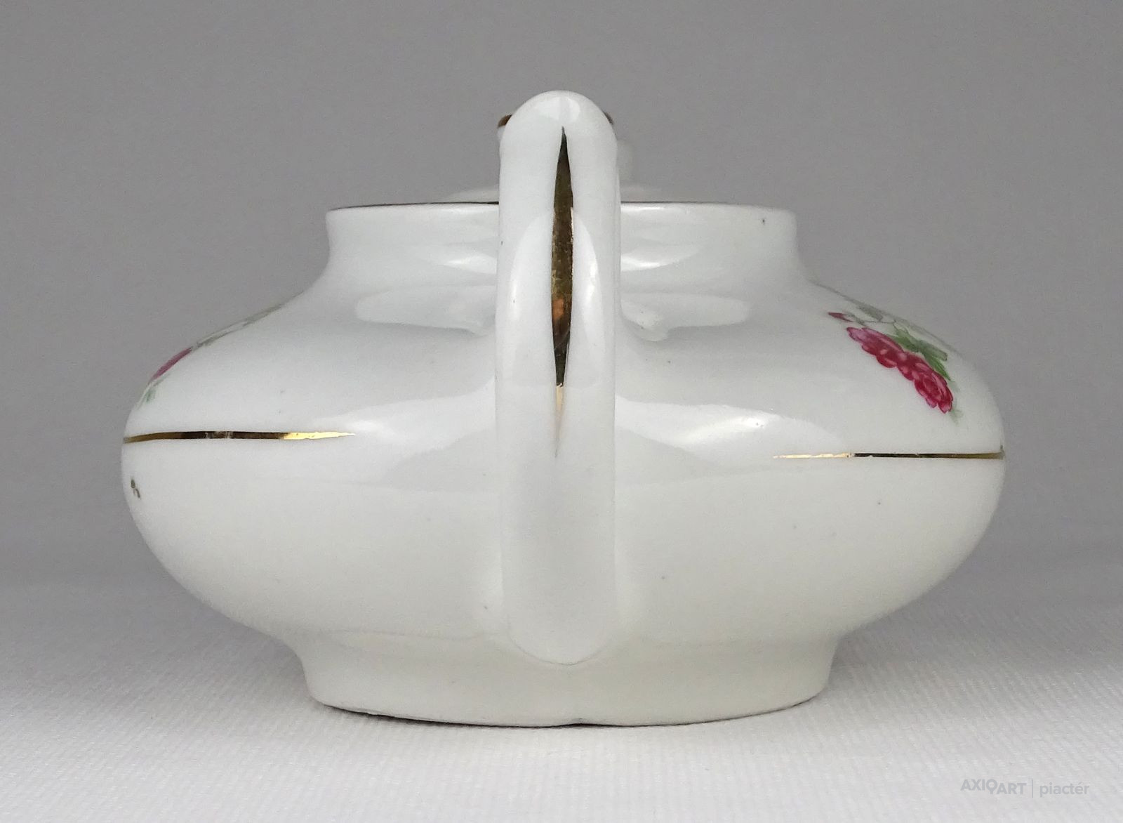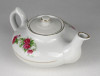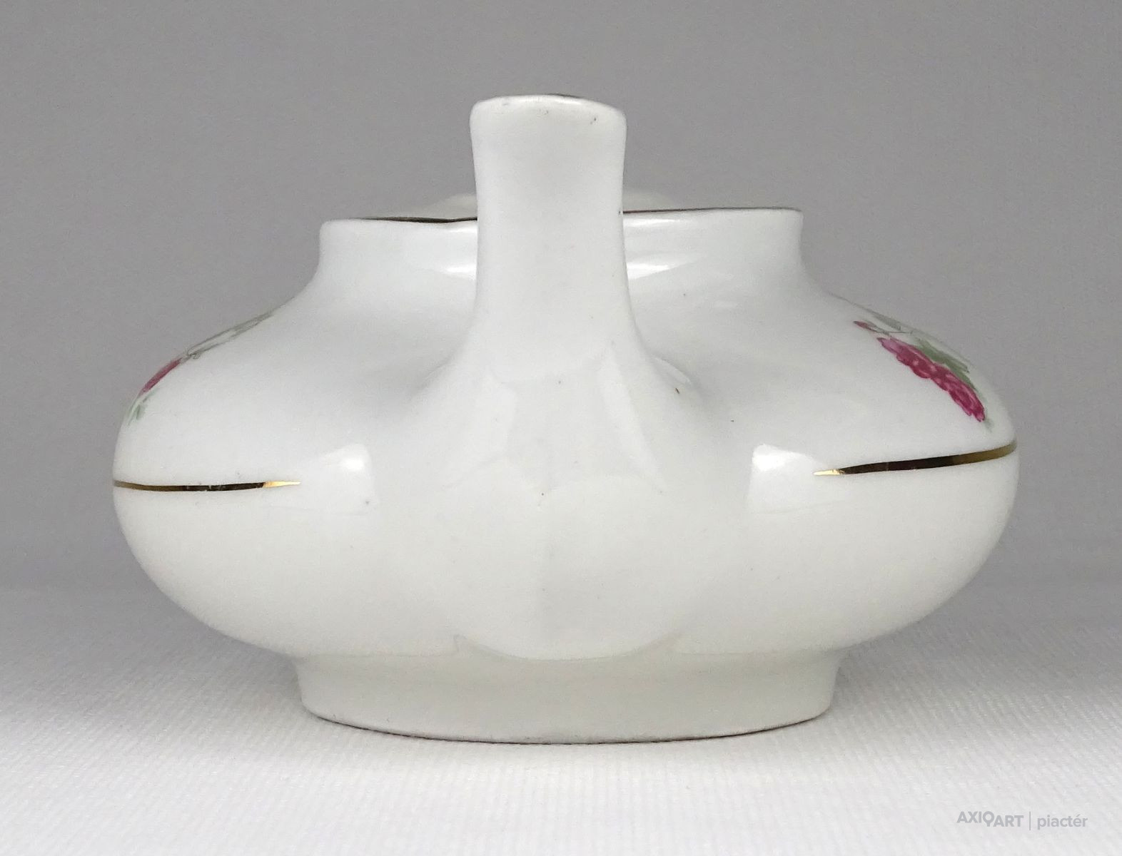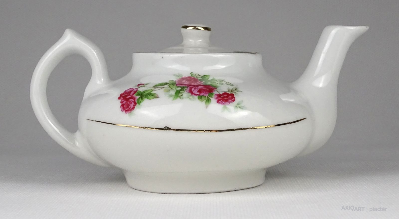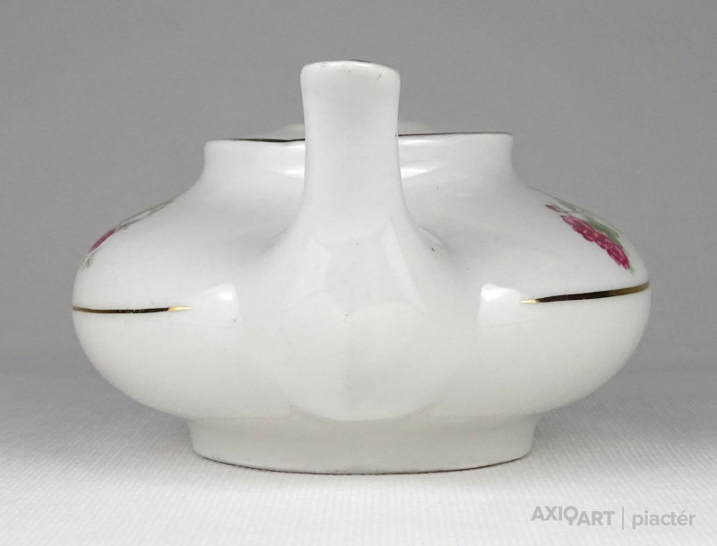 [1M504/X225] Hibátlan állapotú, jelzett, kis méretű japán teáskancsó, teáskanna. Aranyozással és virágokkal díszített. Alján jelzés: OYAMATSU JAPAN Magasság: 7.5 cm Szélesség: 11.5 cm Hosszúság: 16 cm Súly: 0.27 kg