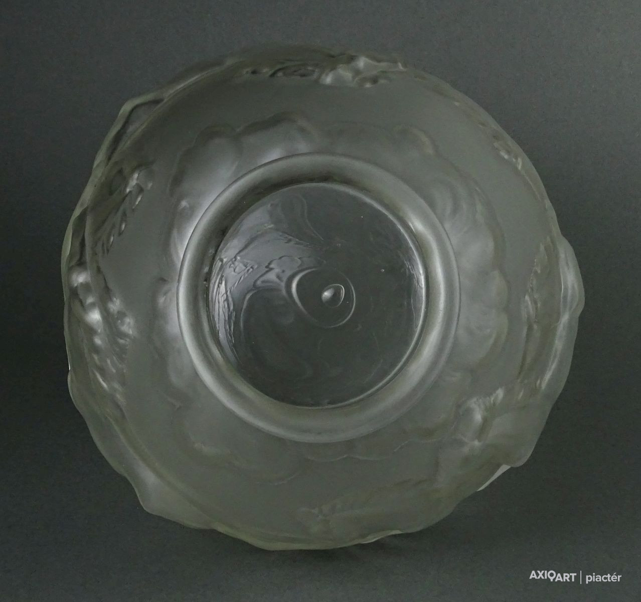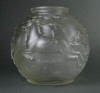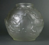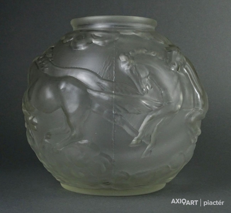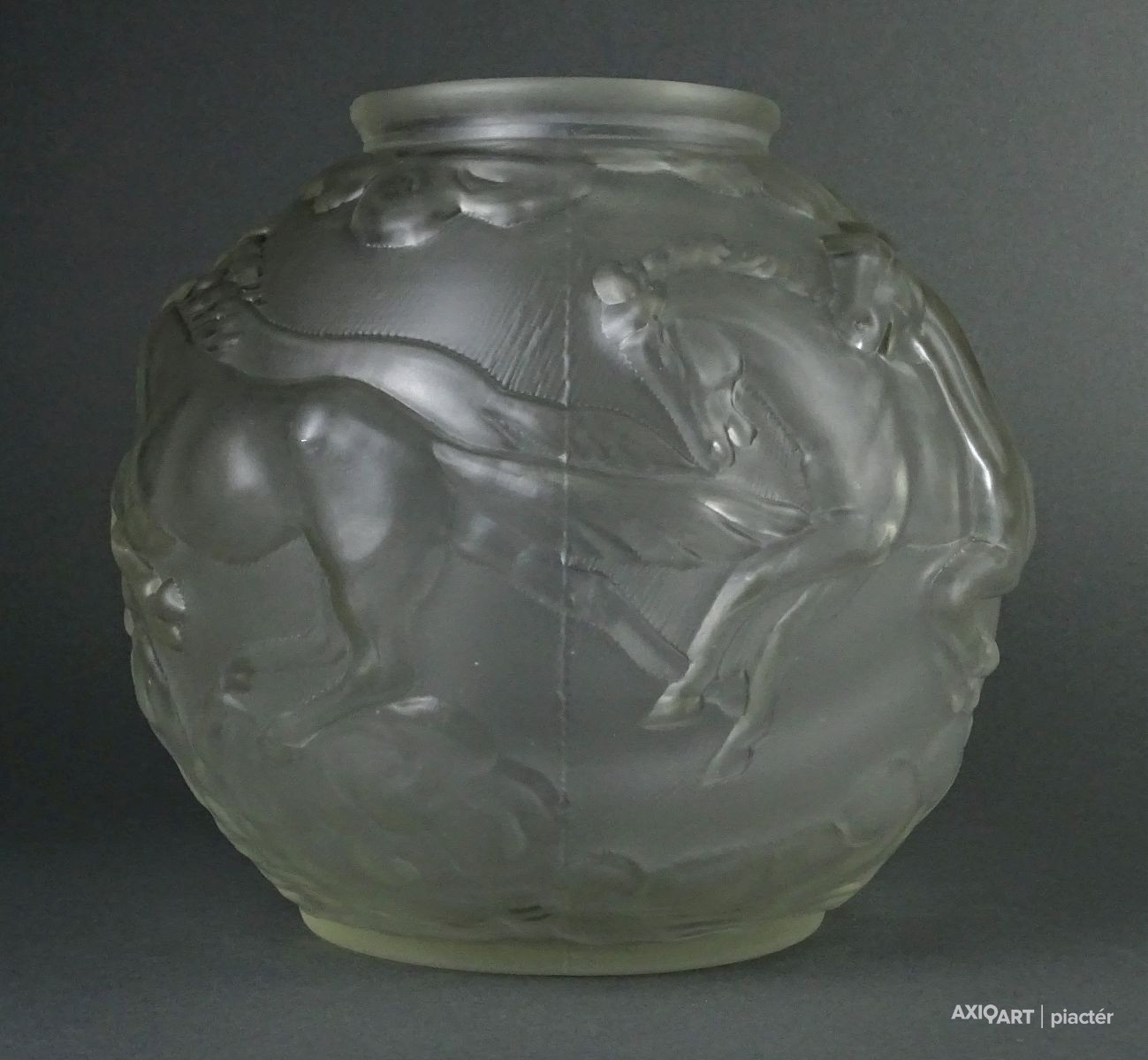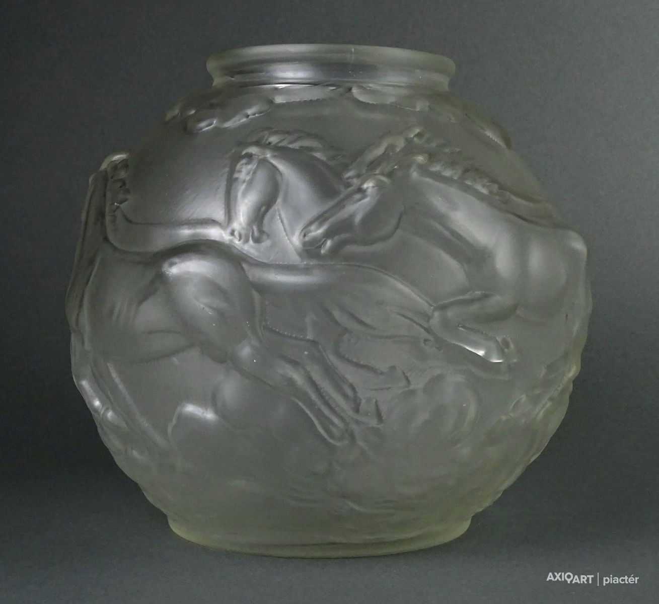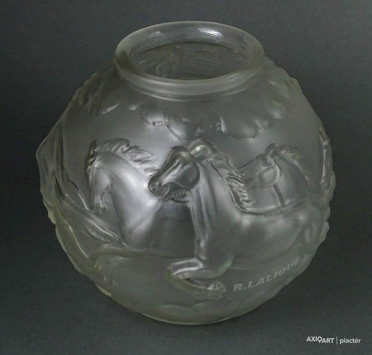 [1O248/Z046] Nagy méretű fúvott üveg váza, gömbváza. Oldalán plasztikus vágtázó lovak, kilenc ló díszítés látható. A váza felülete matt. Oldalán csiszolt, gravírozott jelzés: R. LALIQUE Magasság: 17 cm Szélesség: 18.5 cm Súly: 1.035 kg