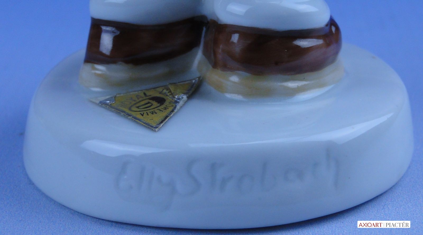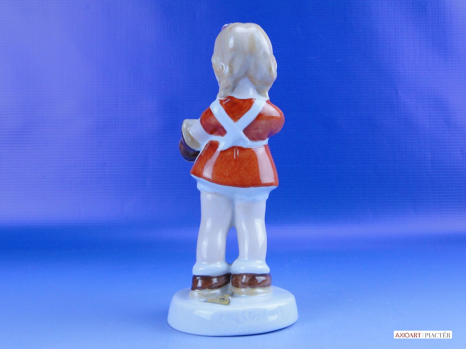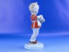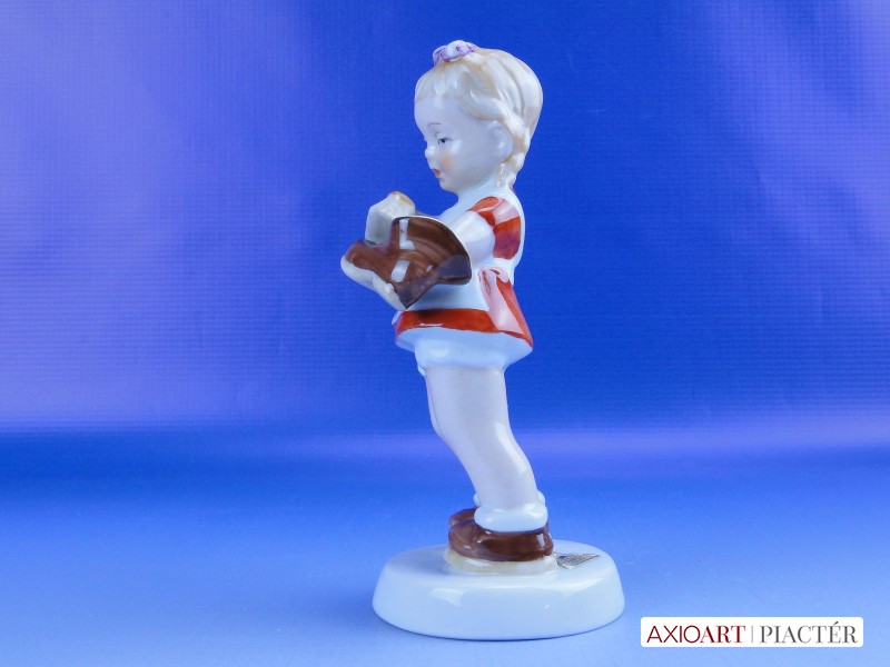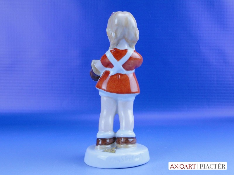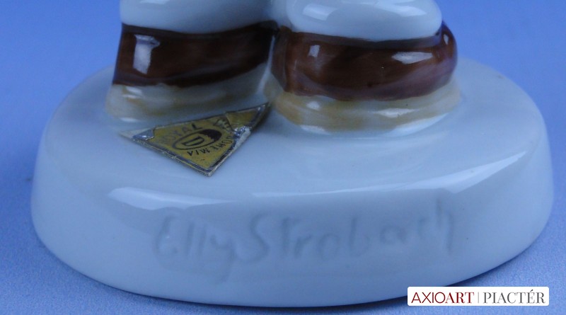 [0D834/X011] Hibátlan állapotú jelzett német porcelán cipőpucoló kislány figura talapzaton, kezében cipő és cipőkefe. Talapzatán eredeti papírvignetta: ROYAL DUX BOHEMIA Formaszám: 016 Talapzatán formatervező neve: ELLY STROBACH Magasság: 14 cm Szélesség: 6 cm Súly: 0.148 kg