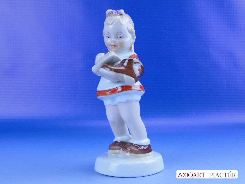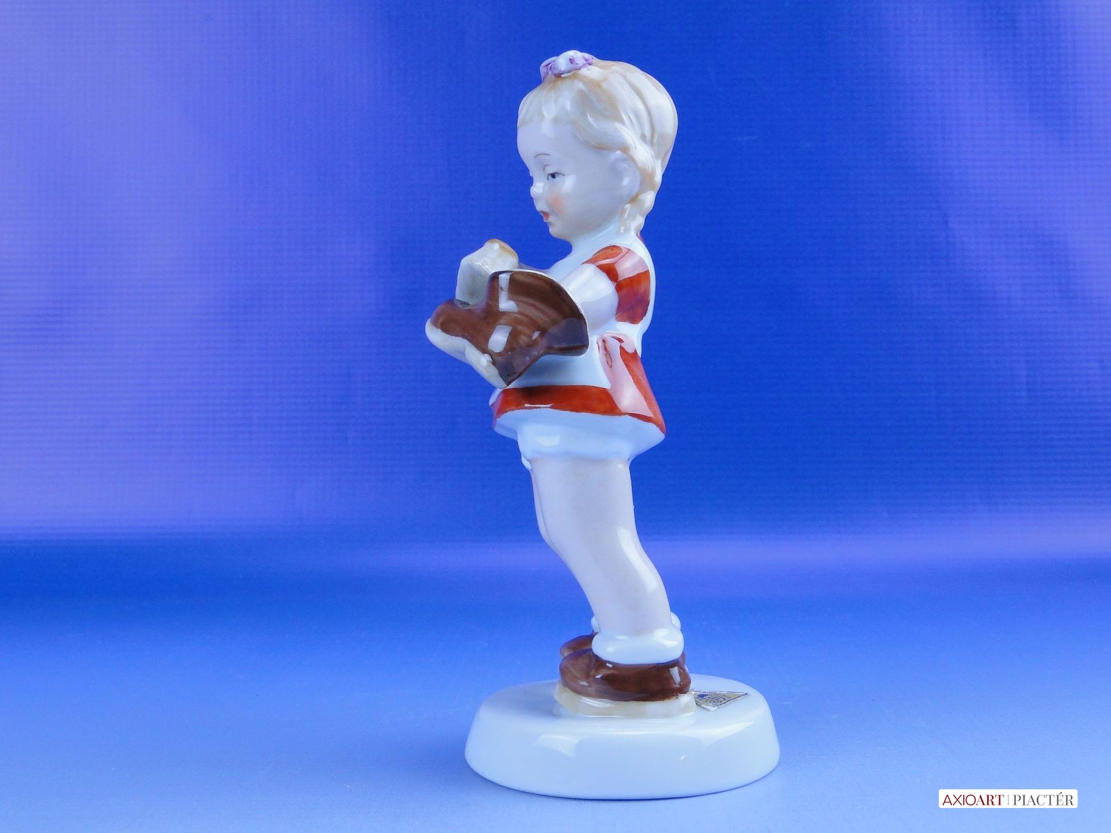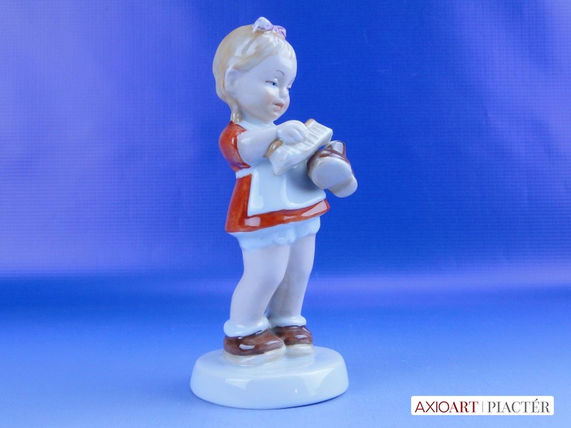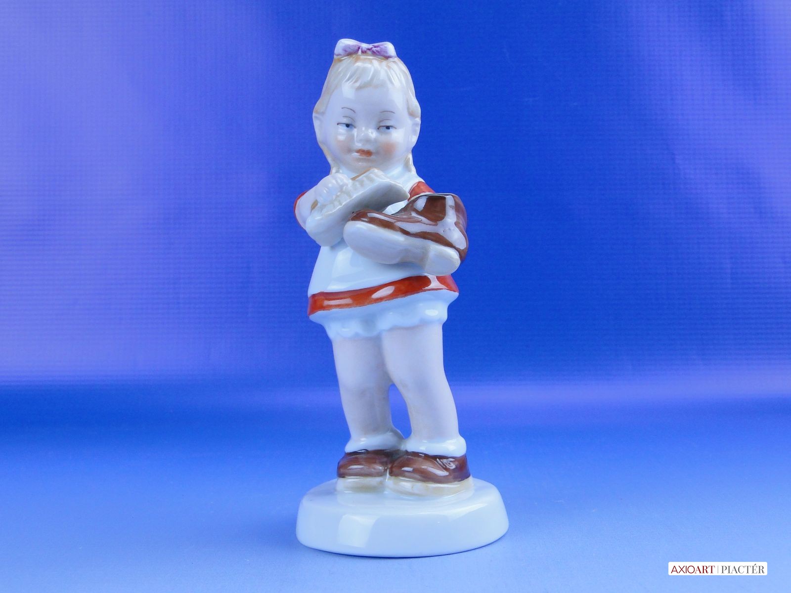 Hibátlan állapotú jelzett német porcelán cipőpucoló kislány figura talapzaton, kezében cipő és cipőkefe.