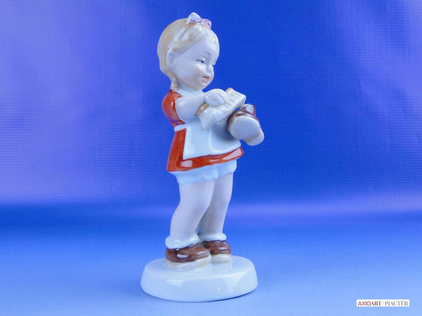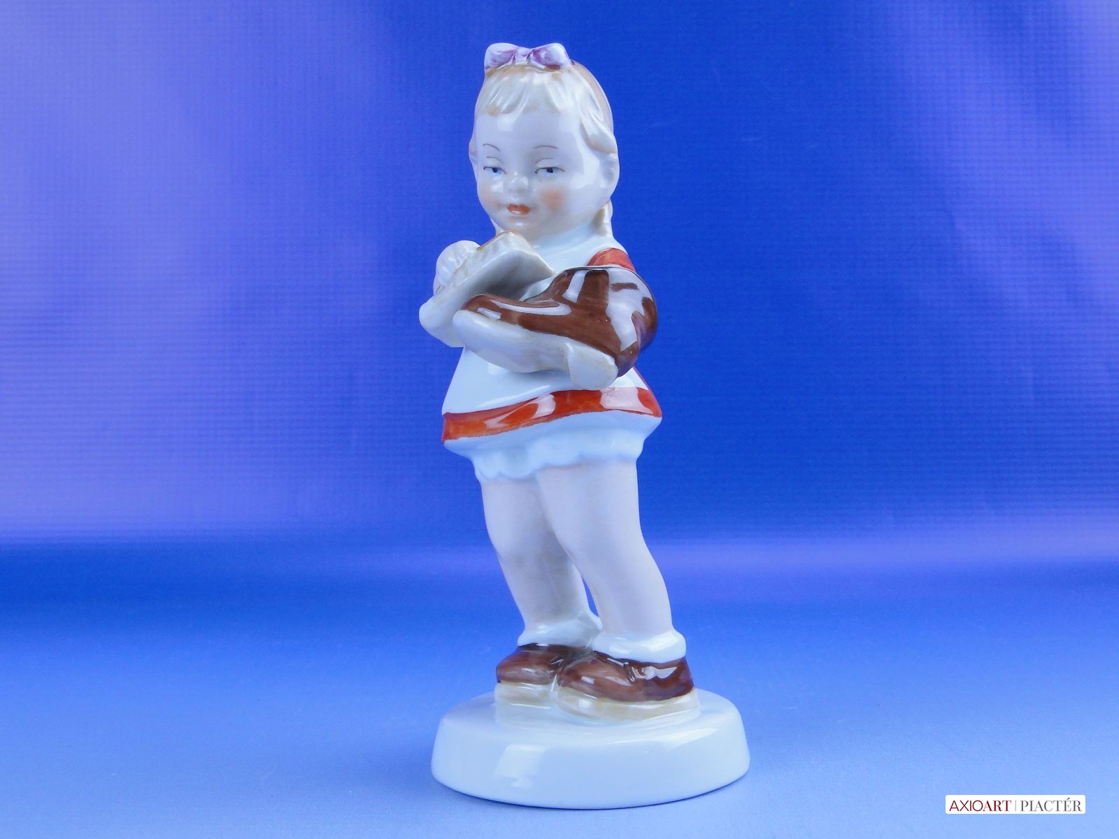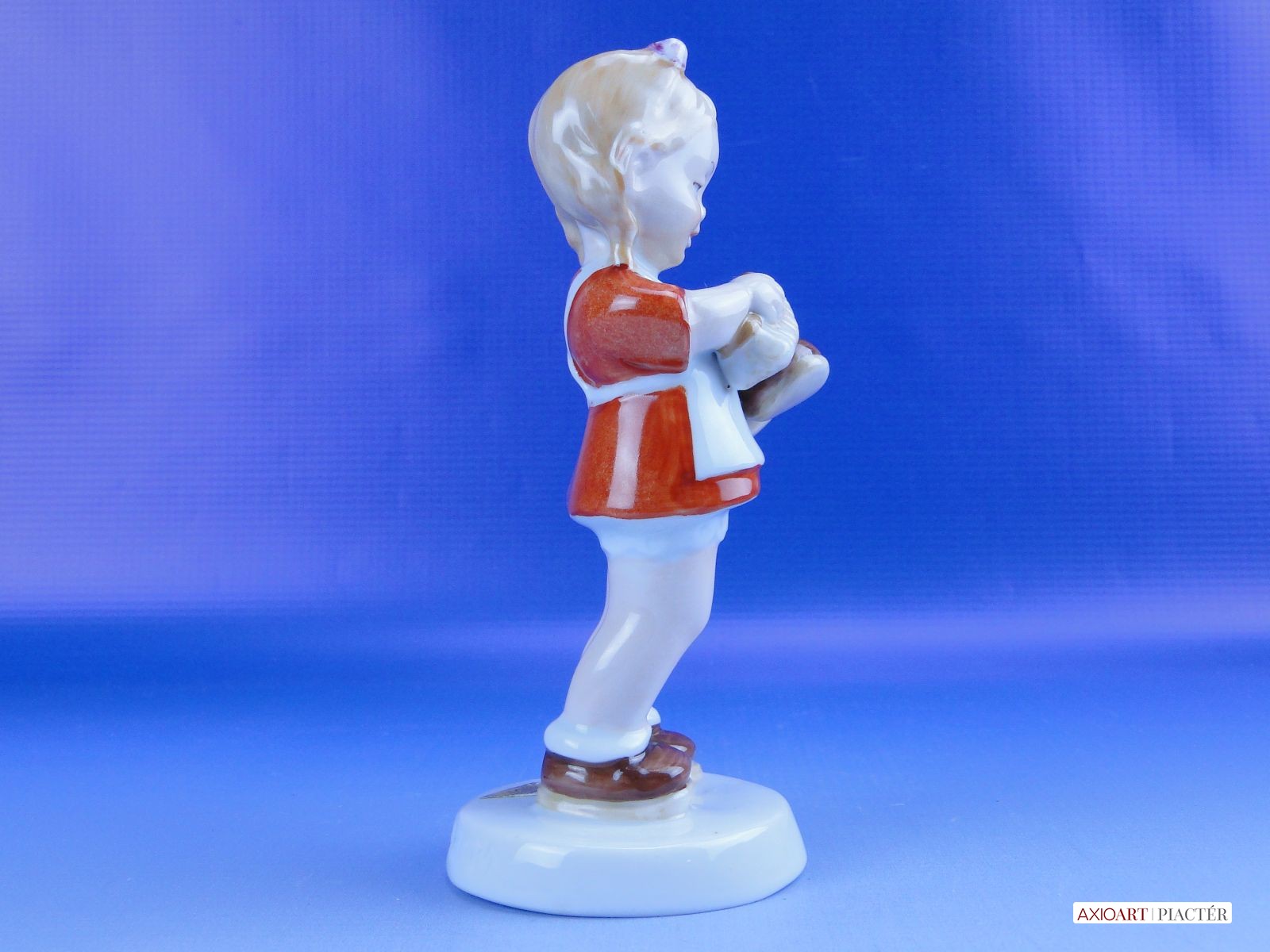 Hibátlan állapotú jelzett német porcelán cipőpucoló kislány figura talapzaton, kezében cipő és cipőkefe.