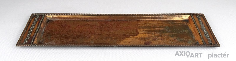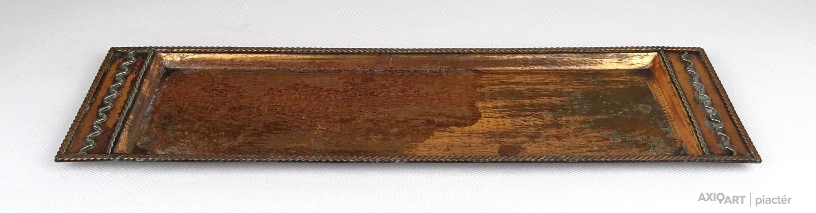 Nagy méretű iparművészeti vörösréz dísztárgy, tálca. Két oldalán hullám díszítésekkel.