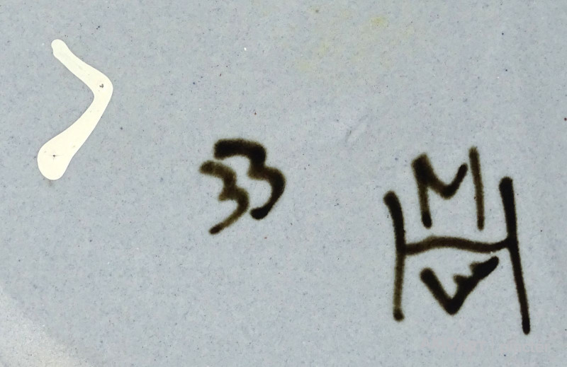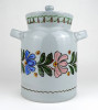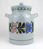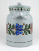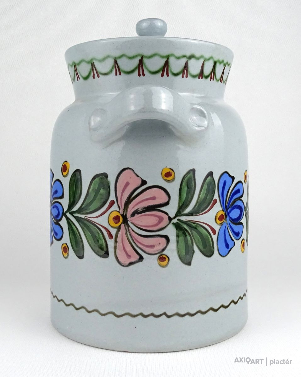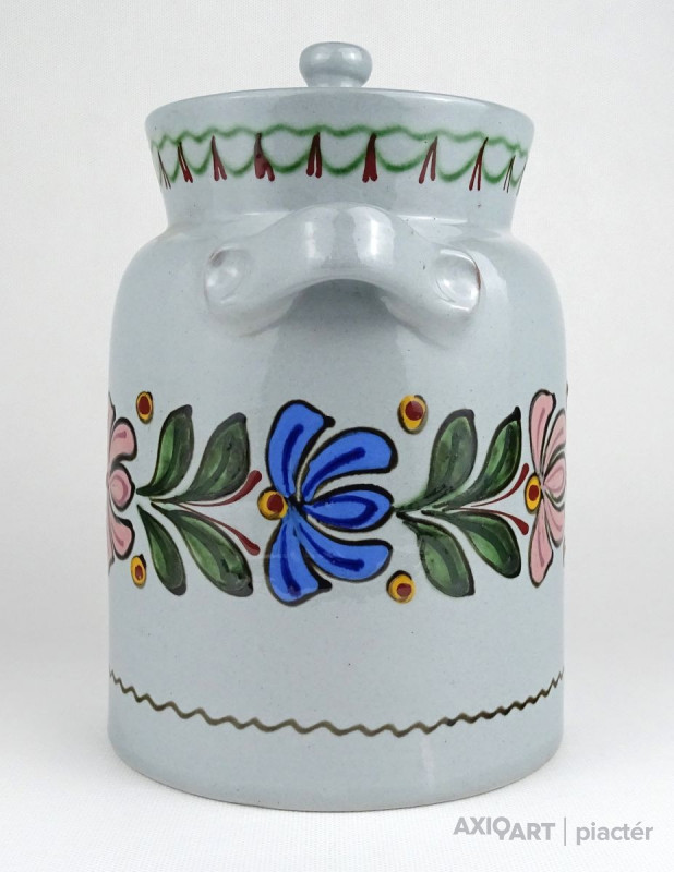 [1S057/X286] Nagy méretű, jelzett, szürkéskék színű, mázas, kézzel festett vásárhelyi fedeles cserép edény, szilke. Alján jelzés: HMV Magasság: 24 cm Szélesség: 15.5 cm Hosszúság: 21 cm Súly: 1.93 kg