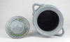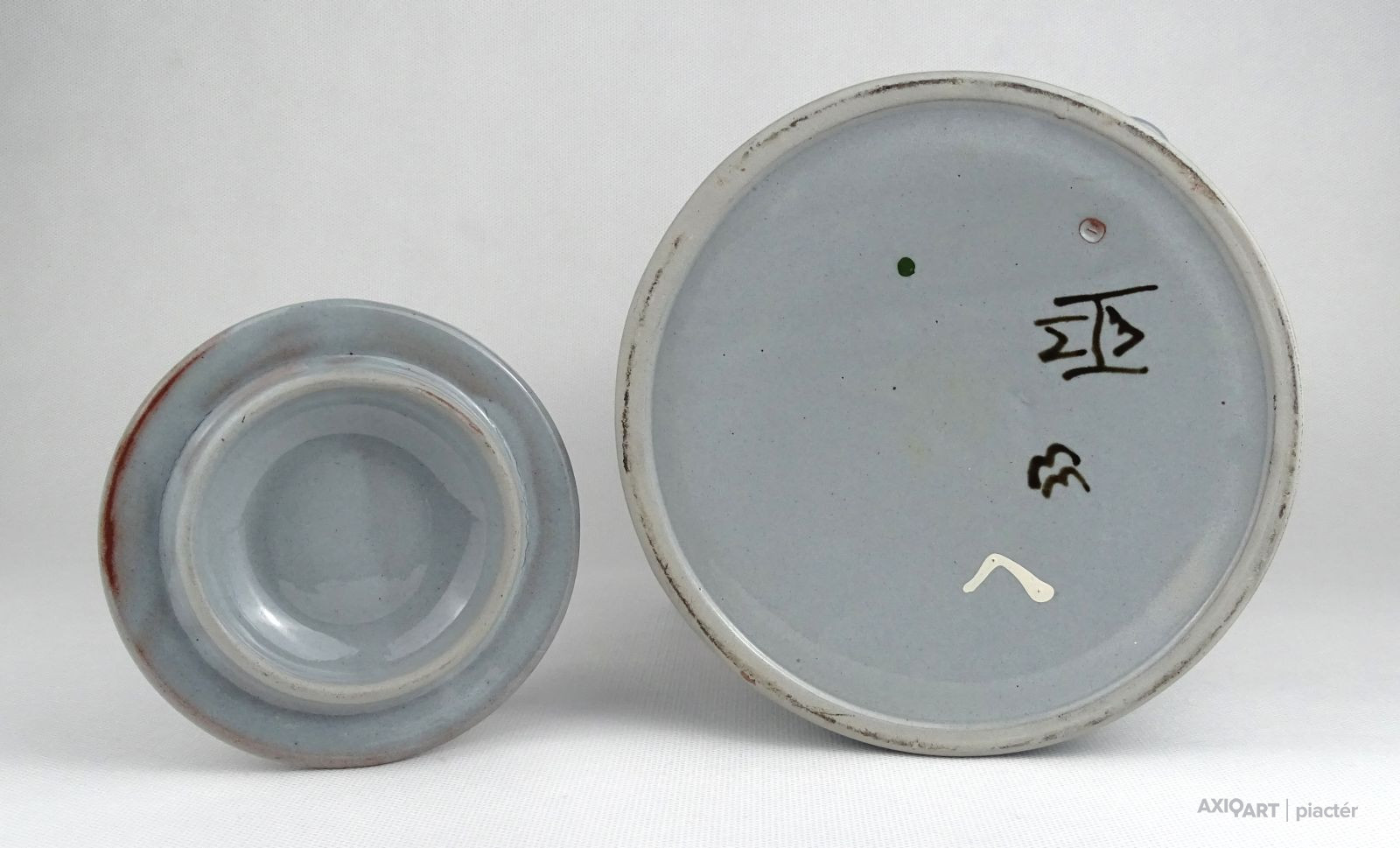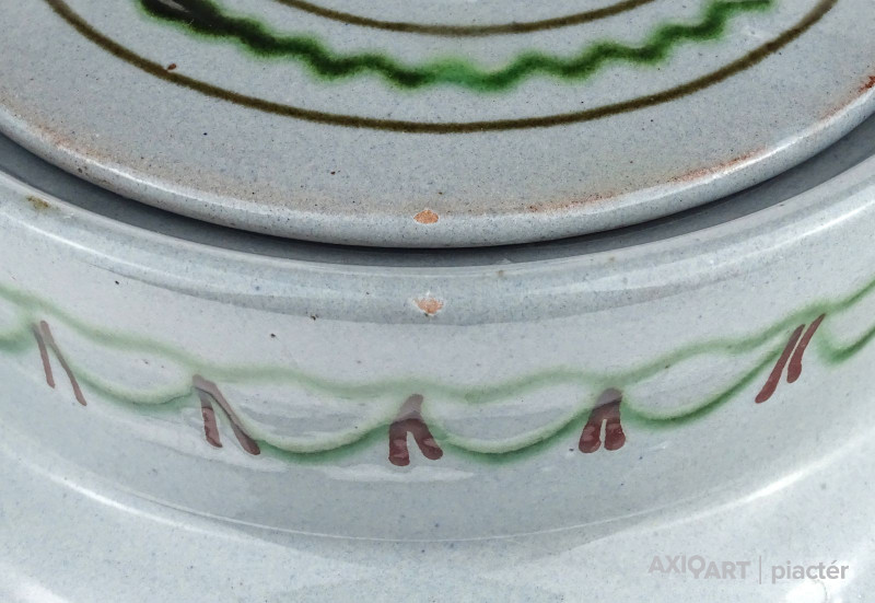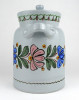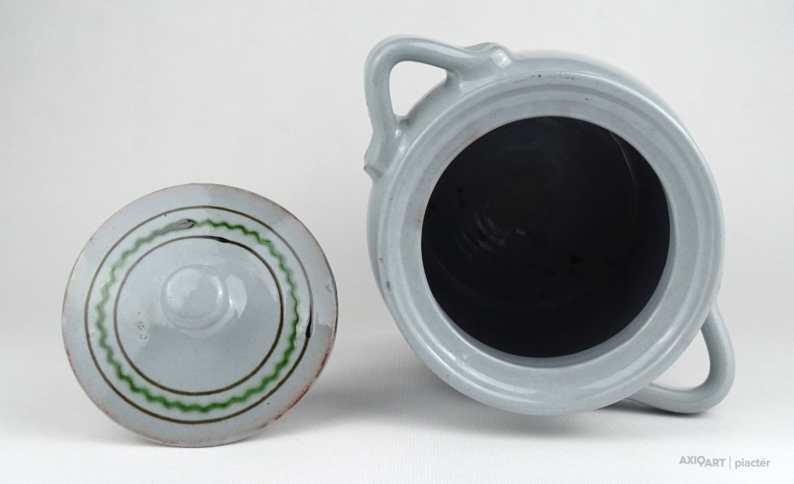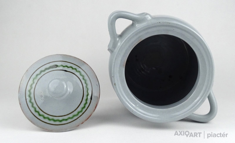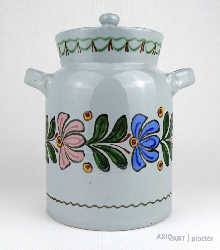 Nagy méretű, jelzett, szürkéskék színű, mázas, kézzel festett vásárhelyi fedeles cserép edény, szilke.