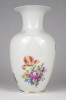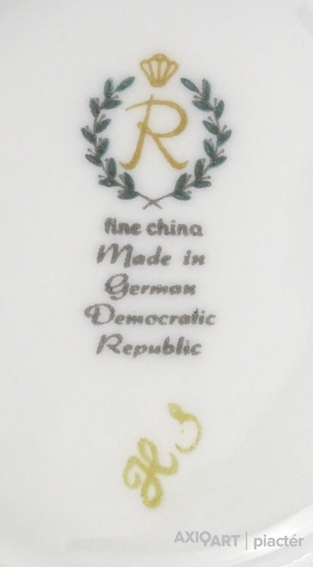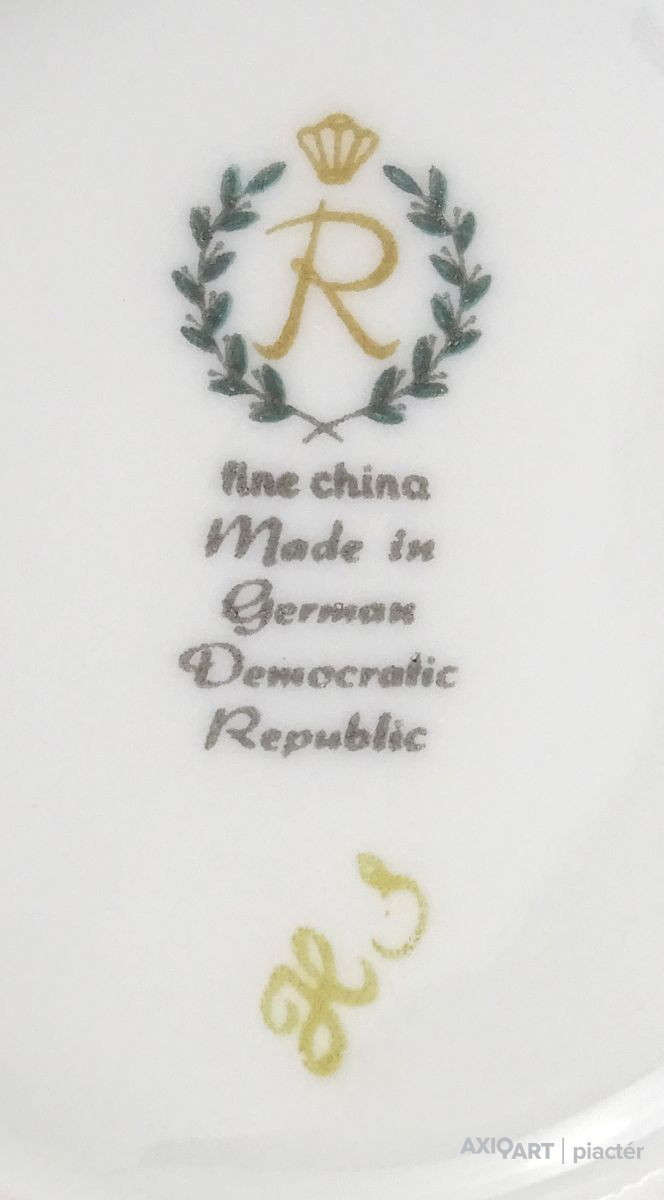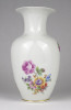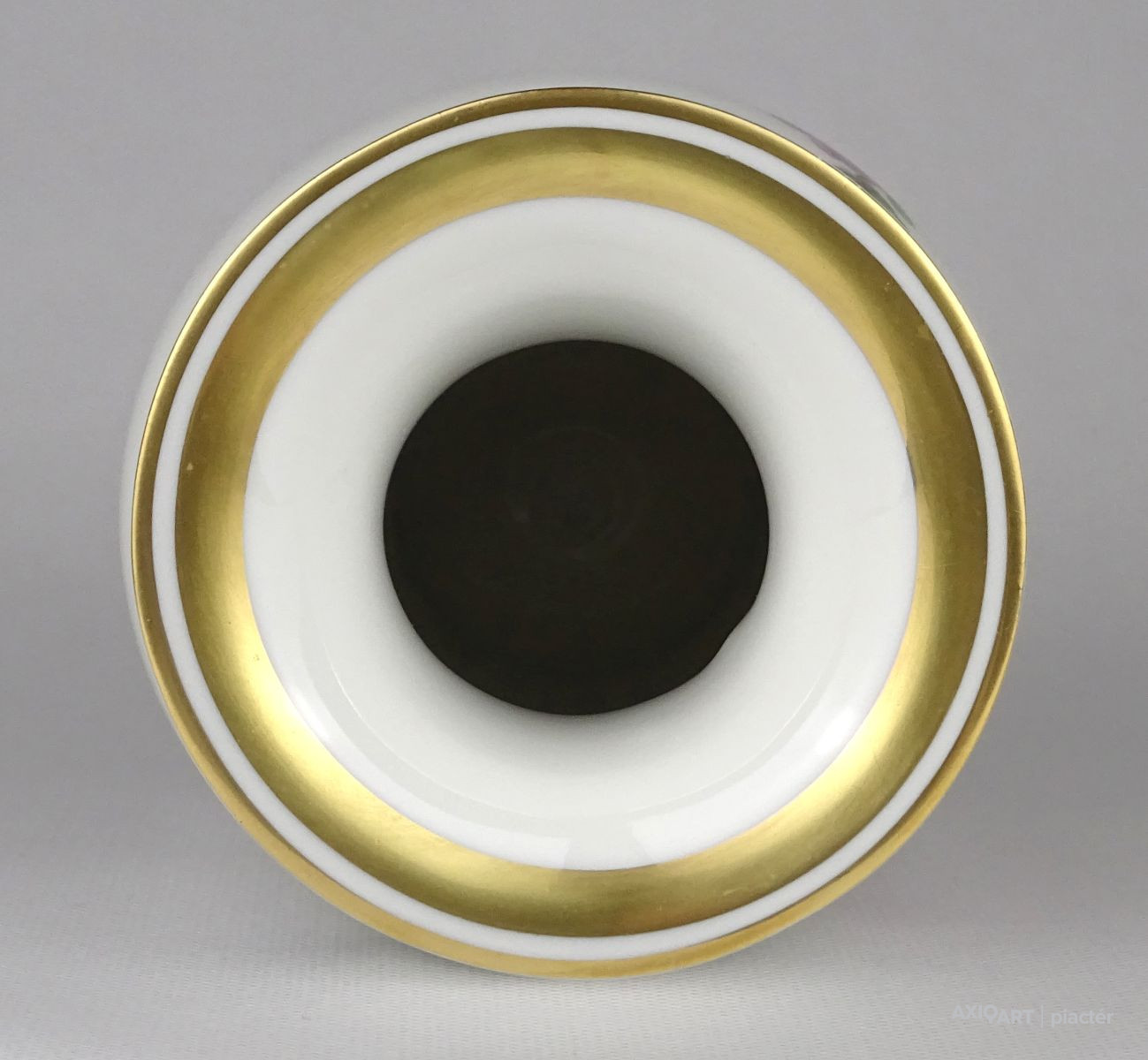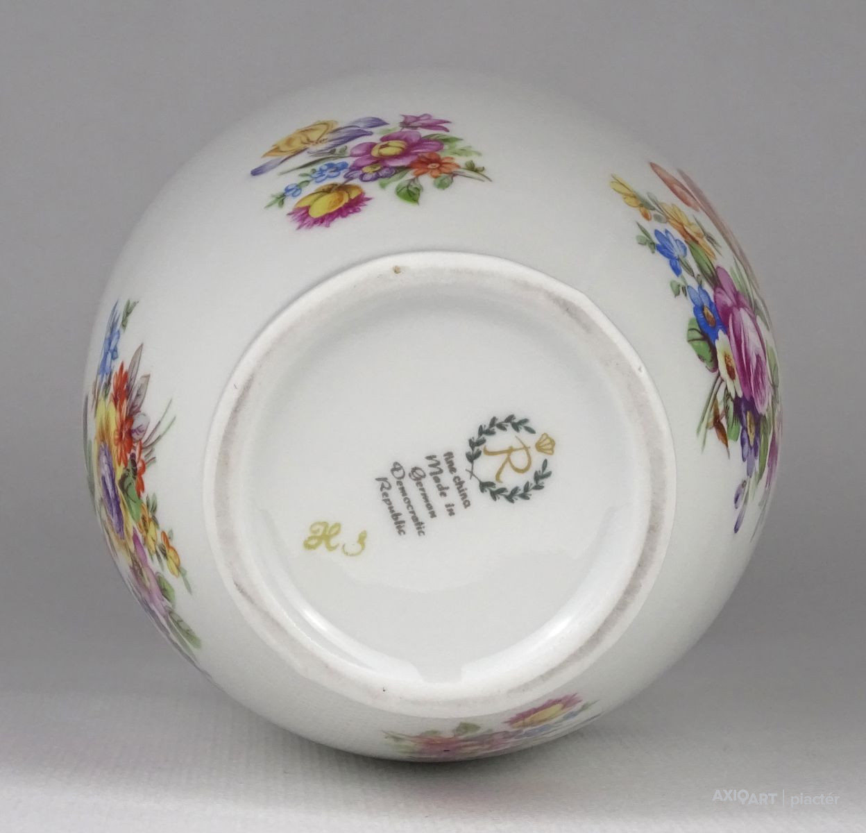 [1M272/X028] Hibátlan állapotú, arany szegélyes porcelán váza, virágváza. Oldalán körben virágokkal díszített. Alján korona alatt jelzés: R FINE CHINA GERMAN DEMOCRATIC REPUBLIC Magasság: 18.5 cm Szélesség: 10 cm Súly: 0.38 kg