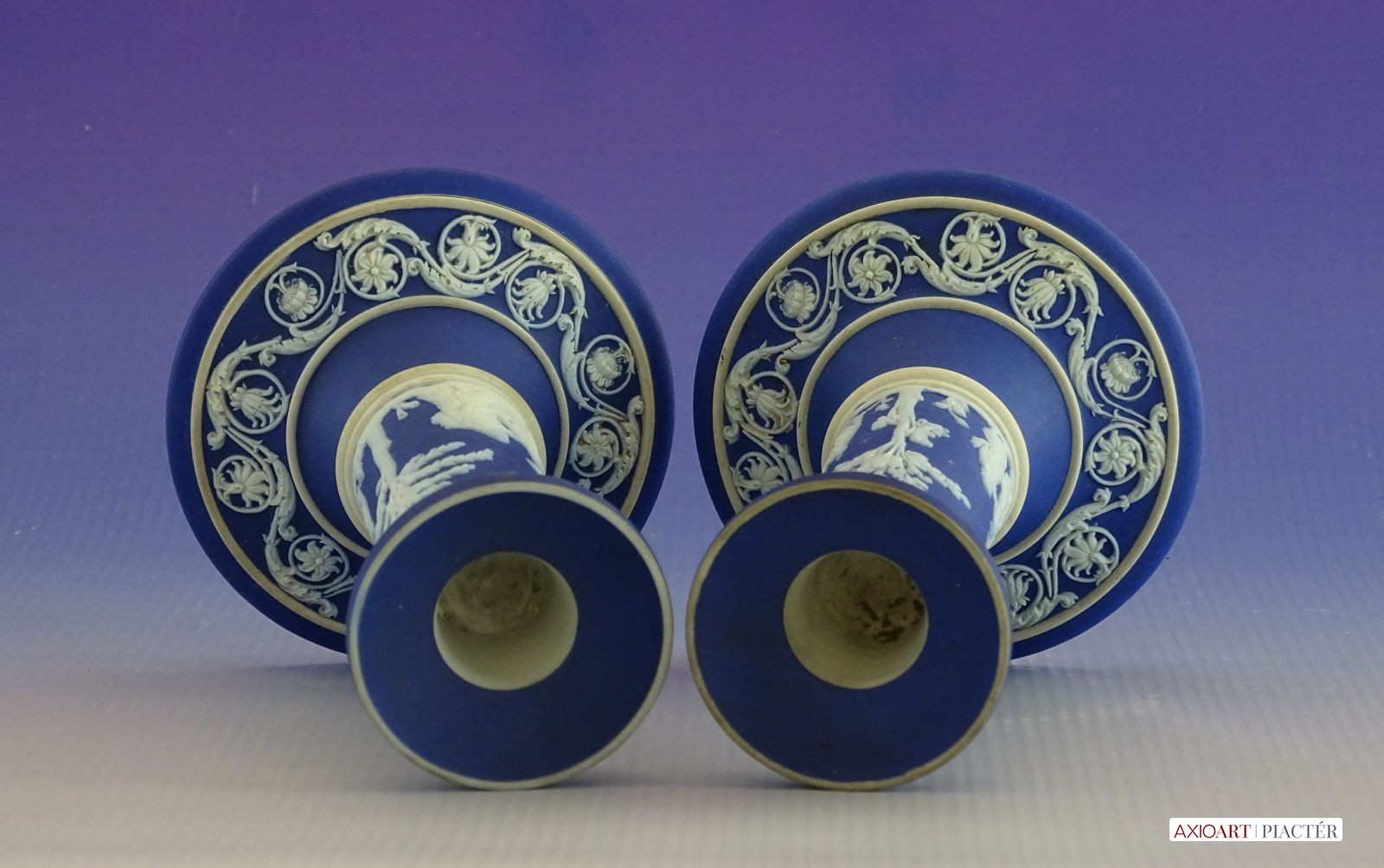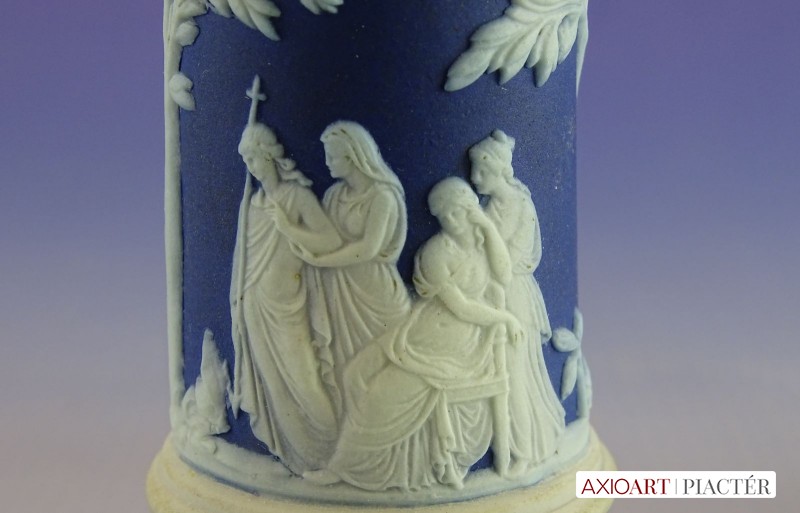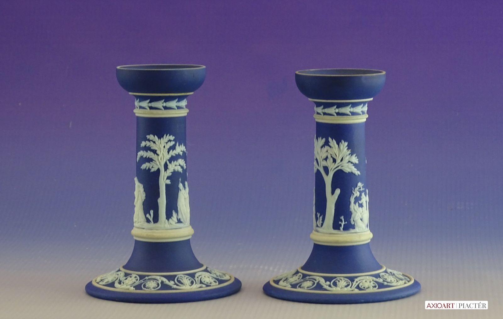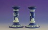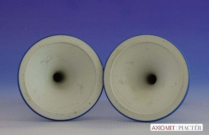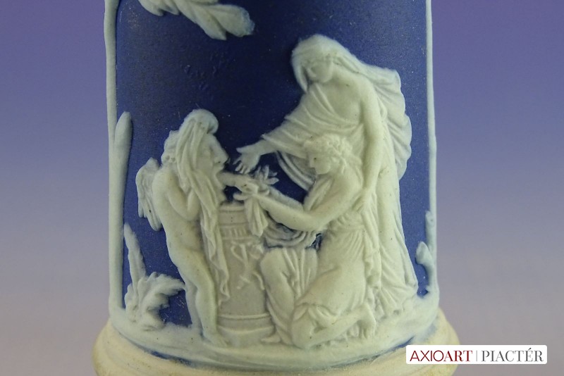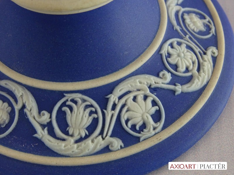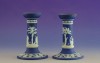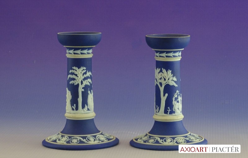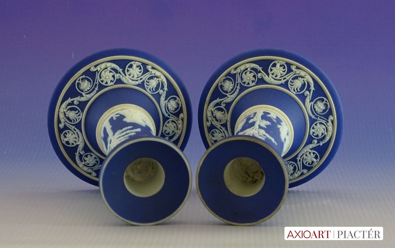 [0I415/UZ-K] Hibátlan állapotú, jelzett, gyönyörű kék alapmázon plasztikus fehér mitológiai díszítésű porcelán gyertyatartó párban Alján mélynyomott márkajelzés: WEDGWOOD Magasság: 12.5 cm Szélesség: 9 cm Súly: 0.47 kg