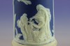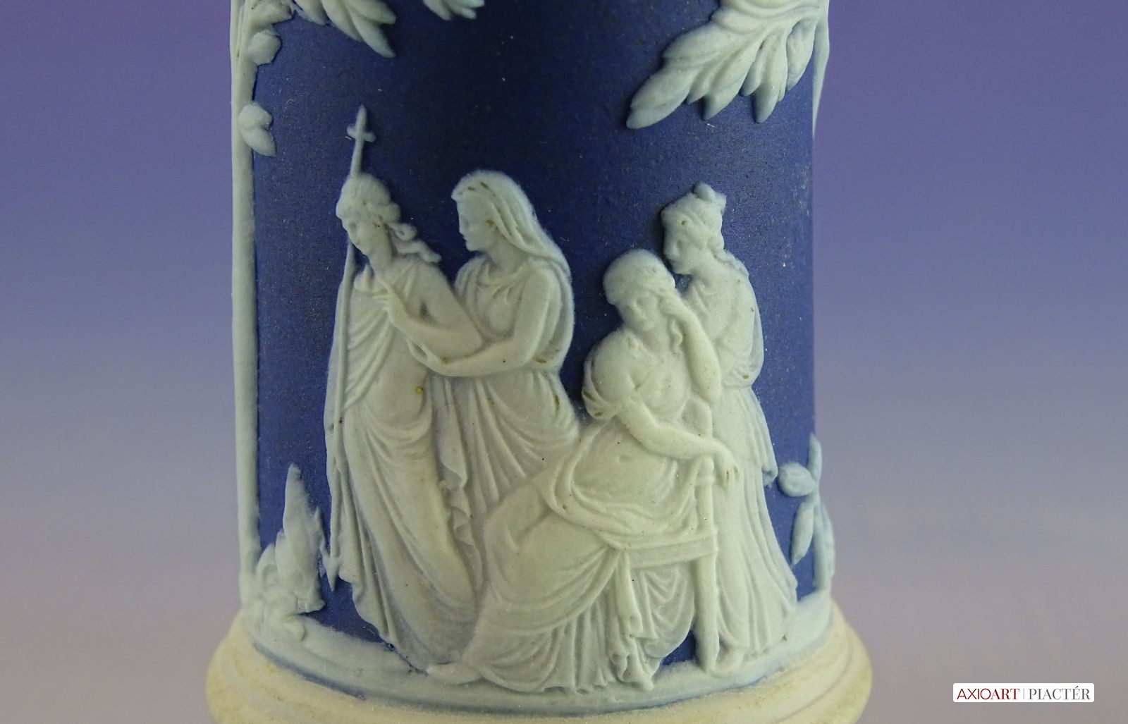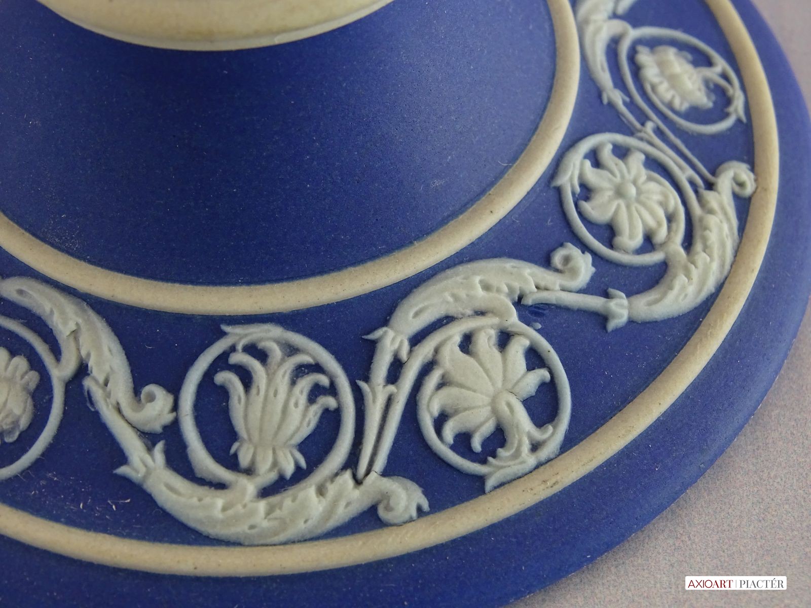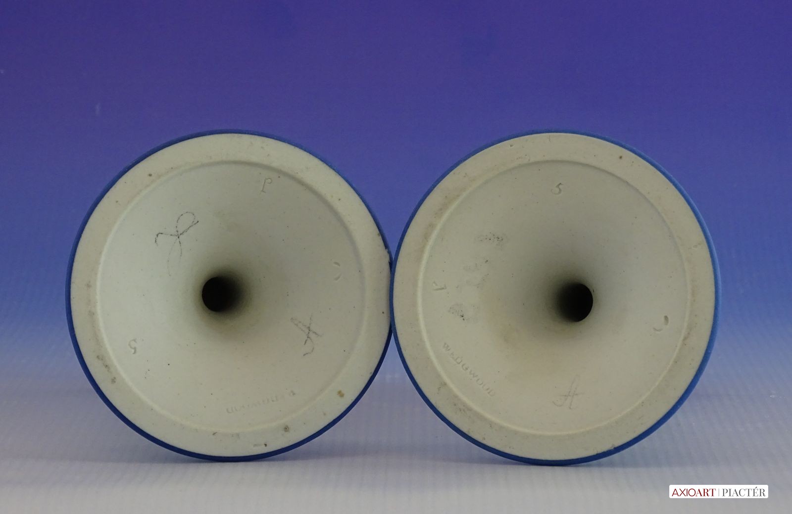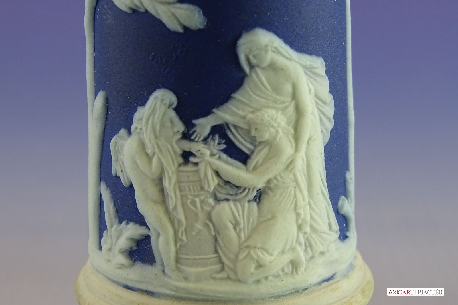 [0I415/UZ-K] Hibátlan állapotú, jelzett, gyönyörű kék alapmázon plasztikus fehér mitológiai díszítésű porcelán gyertyatartó párban Alján mélynyomott márkajelzés: WEDGWOOD Magasság: 12.5 cm Szélesség: 9 cm Súly: 0.47 kg