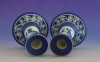 Hibátlan állapotú, jelzett, gyönyörű kék alapmázon plasztikus fehér mitológiai díszítésű porcelán gyertyatartó párban