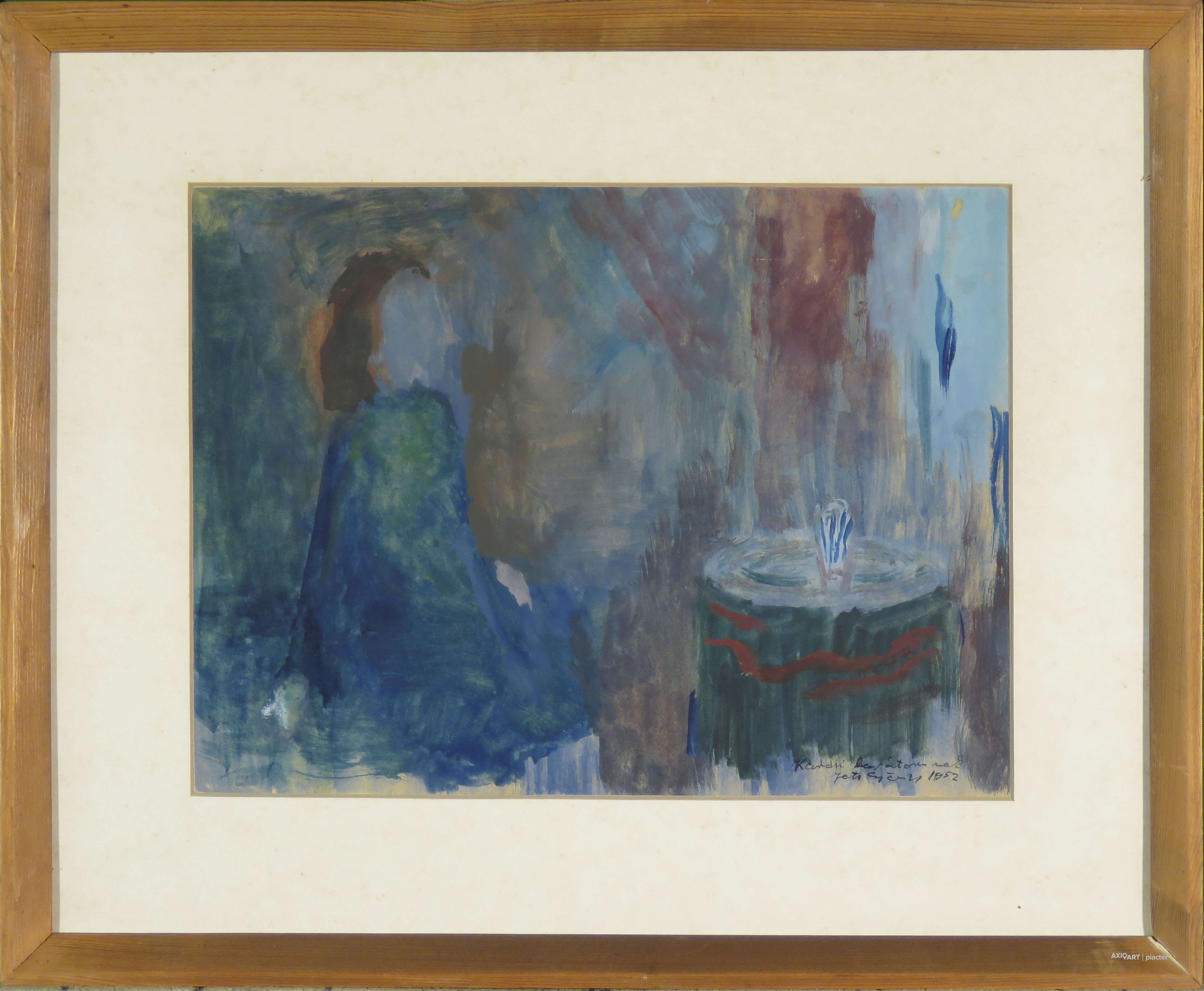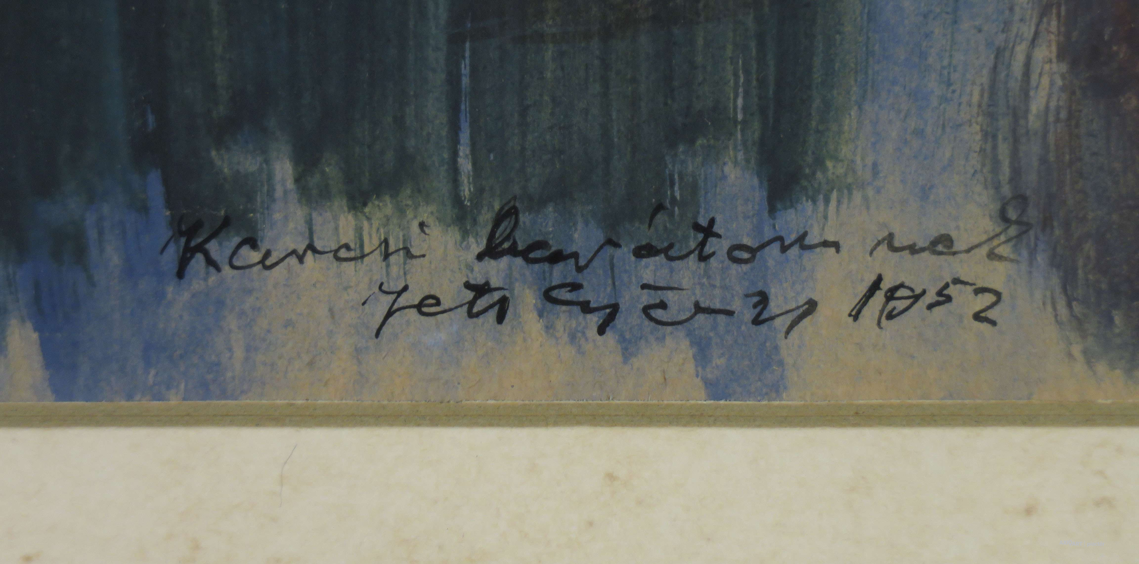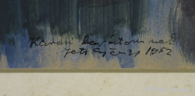 [FKC978/Bp61/43] A kép mérete: 24 x 32 cm keret nélkül. Készült: Tempera, Papír A kép Jets György (Ada, 1925, Budapest, 1996) alkotása. Jelezve jobbra lent "Karcsi barátomnak Jets György 1952" A festmény jó állapotban van. Keret: Ép Kortárs magyar művészeti lexikon I-III. 1944-49: MKF, mestere: Szőnyi István. 1949-51 között Szőnyi és Barcsay Jenő demonstrátora. 1951-60 között a MIF alakrajz tanára. 1982-94 között a zebegényi Szőnyi István Képzőművészeti Szabadisk. murális osztályát vezette. A meglehetősen következetes életmű a Szőnyi-tradícióra épül. Az oeuvre törzsét utcarészletek, nagymarosi és zebegényi vízparti tájak adják. Biztos ismerője volt a murális technikáknak, de az életmű javát könnyed és bensőséges akvarelljei adják. Zebegényi tanárkodása idején számos fiatal művész pályakezdését segítette. Ek: 1974: Derkovits T.; 1986: Szőnyi István emlékm., Zebegény; 1987: Börzsöny M., Szob; 1997: Akvarellek, Könyvtár G., Zebegény. Vcsk: 1957: Tavaszi Tárlat, Műcsarnok; 1973: Angyalföldi képző- és iparművészek kiállítása, Műcsarnok; 1974: Tavaszi festménybemutató, Képcsarnok, Győr; 1977: A Szőnyi István Képzőművészeti Szabadiskola művésztanárainak kiállítása, Szőnyi István Emlékm., Zebegény. Mk: Ferenczy M., Szentendre. Km: Gyümölcsoltó Boldogasszony; Szent Család (freskók, Kiskanizsa, Plébániatemplom). (H. F.) Művész életrajzok kortárs magyar képzőművészek 1949-ben fejezte be főiskolai tanulmányait Szőnyi István osztályán, majd ugyanitt demonstrátor, később az Iparművészeti Fősikolán alakrajz-tanár volt. 1952 óta szerpel a nyilvánosság előtt; jelentősebb egyéni bemutatója 1974-ben a Derkovits Teremben volt. – Intim, bensőséges hangulatokra fogékony alkotó, előszeretettel festi a változatos dunamelléki tájat, Visegrád, Nagymaros környékét. Jóképességű akvarellista. Magyar festők és grafikusok életrajzi lexikona I-II. Műgyűjtők és kereskedők kézikönyve Festő. A budapesti Képzőművészeti Főiskolán Szőnyi István tanítványa volt, később ugyanitt tanársegédként működött Barcsay Jenő és Szőnyi István mellett. 1951-1960 k. a bp.-i Iparművészeti Főiskola alakrajztanára volt. 1952 óta kiállító művész. Bensőséges hangulatokra fogékony alkotó, nagy szeretettel festi a változatos Duna melléktájait, Visegrád, Nagymaros környékét. (MÉ) Magyar festők és grafikusok életrajzi lexikona I-II. Festő. 1944-49 között a budapesti Képzőművészeti Főiskolán Szőnyi István növendéke volt, később ugyanott tanársegédként működött Barcsay Jenő és Szőnyi István mellett. 1951-1960 között a zebegényi Szőnyi István Képzőművészeti Szabaiskola murális posztályát vezette és az Iparművészeti Főiskola alakrajztanára volt. 1952 óta kiállító művész. Csoportos (Műcsarnok, Győr, Zebegény) és egyéni (Derkovits Terem, Zebegény, Szob, stb.) bemutatókon jelentkezett. A meglehetősen következetes életmű a Szőnyi-tradícióra épül. Biztos ismerője volt a murális technikáknak, de az életmű javát könnyed és bensőséges akvarelljei adják. Bensőséges hangulatokra fogékony alkotó, aki nagy szeretettel örökítette meg a változatos Duna-mellék tájait, Visegrád és Nagymaros környékét, romantikus utcarészleteket, a nagymarosi és zebegényi vízparti tájakat. A szentendrei Ferenczy Múzeum őrzi munkáit. (MÉ, Hann Ferenc adatközlése nyomán) Magyar festők és grafikusok adattára 1944-46 között Szőnyi István növendéke a Képzőművészeti Főiskolán, majd ugyanitt továbbképzősként tanásegéd Szőnyi és Barcsay mellett. 1951-1960 között az Iparművészeti Főiskola alakrajztanára. 1952-től kiállító művész, a jelentősebb országos rendezvények résztvevője. Legutóbb 1974-ben a Derkovits Teremben volt egyéni bemutatója. – Bensőséges hangulatokra fogékony alkotó, előszeretettel festi a változatos Duna mellék tájait, Visegrád, Nagymaros környékét. – Irod.: P. Sz. T.: Művész életrajzok. Bp. 1985.