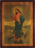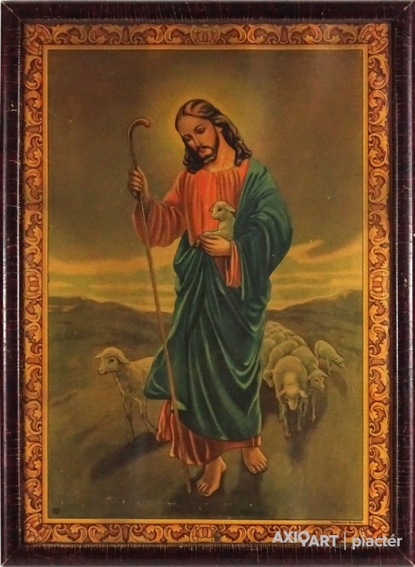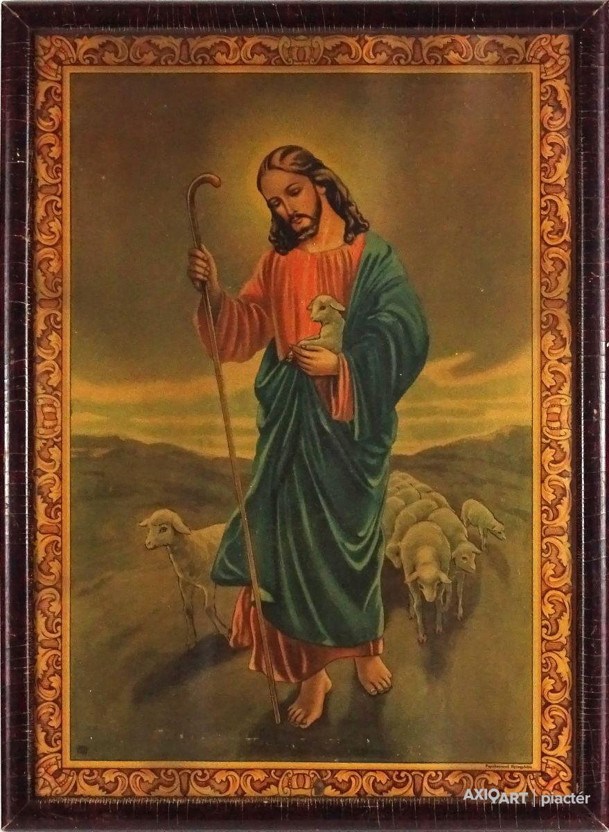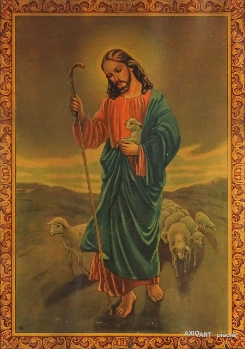 Jézust és nyáját ábrázoló régi színes olajnyomat régi keretben, üveglap mögött. Akasztási lehetőséggel rendelkezik. Hátoldalán felirat ceruzával, lásd fotó.