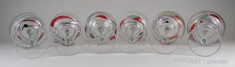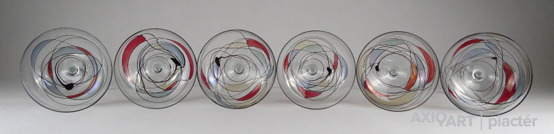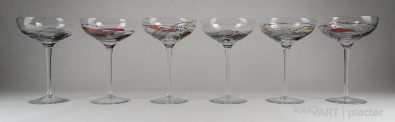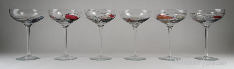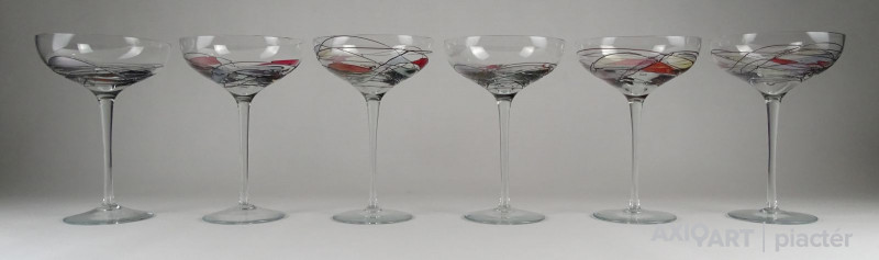 Hibátlan állapotú, nagy méretű talpas pezsgős vagy koktélos pohár készlet, elegáns forma. Hat darabos gyönyörű készlet, oldalán kézzel festett, csorgatott, Miro festményeire hajazó modern festett díszítéssel.