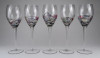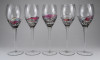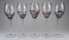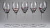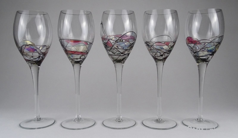 [1P141/X140] Hibátlan állapotú, nagy méretű talpas pezsgős pohár készlet, elegáns forma. Öt darabos gyönyörű készlet, oldalán kézzel festett, csorgatott, Miro festményeire hajazó modern festett díszítéssel. Magasság: 22 cm Szélesség: 7 cm Súly: 1.025 kg