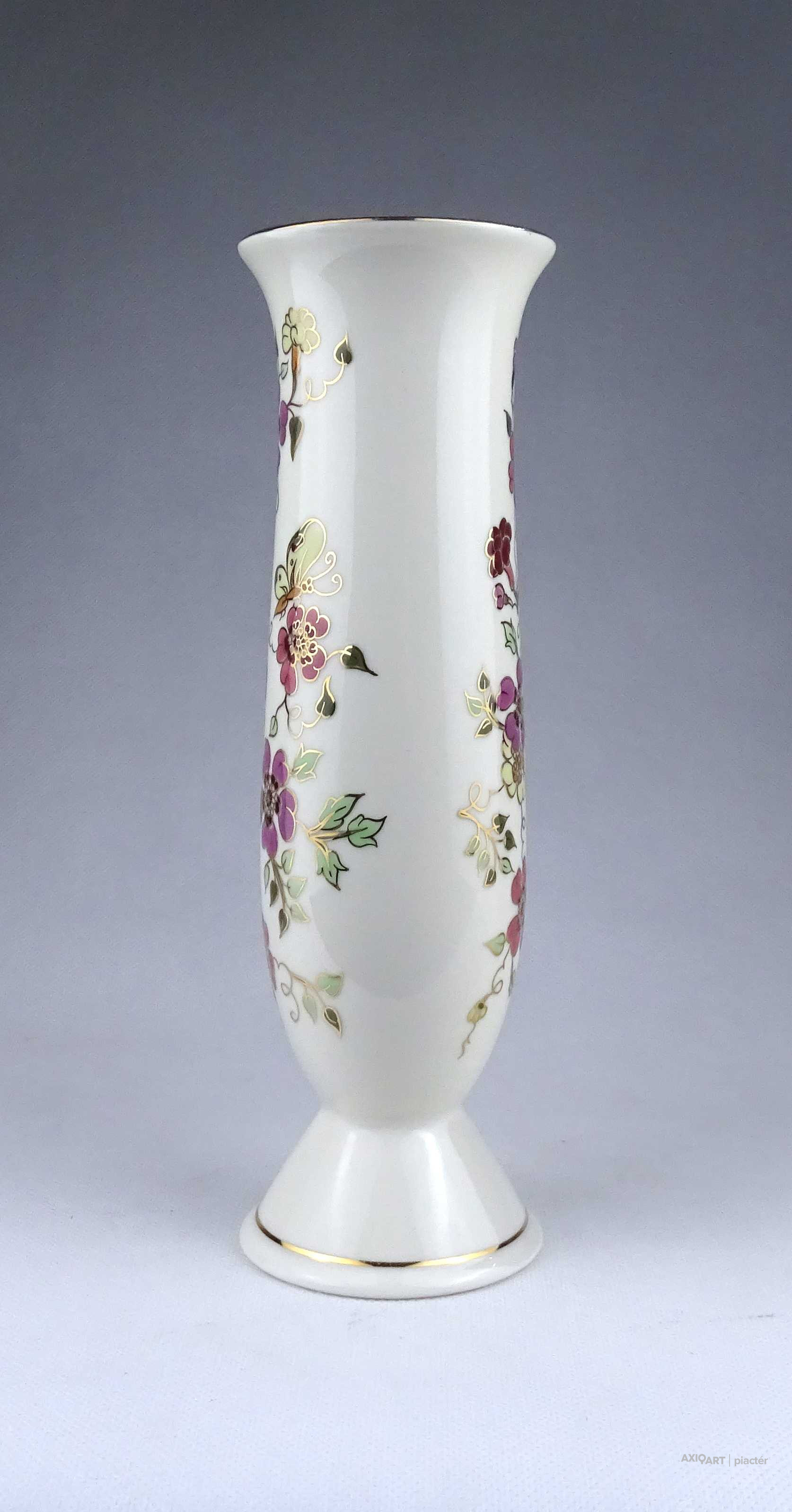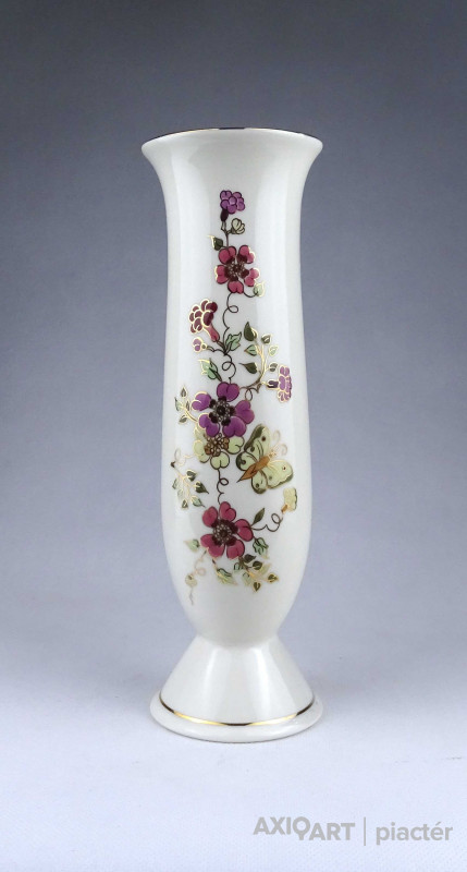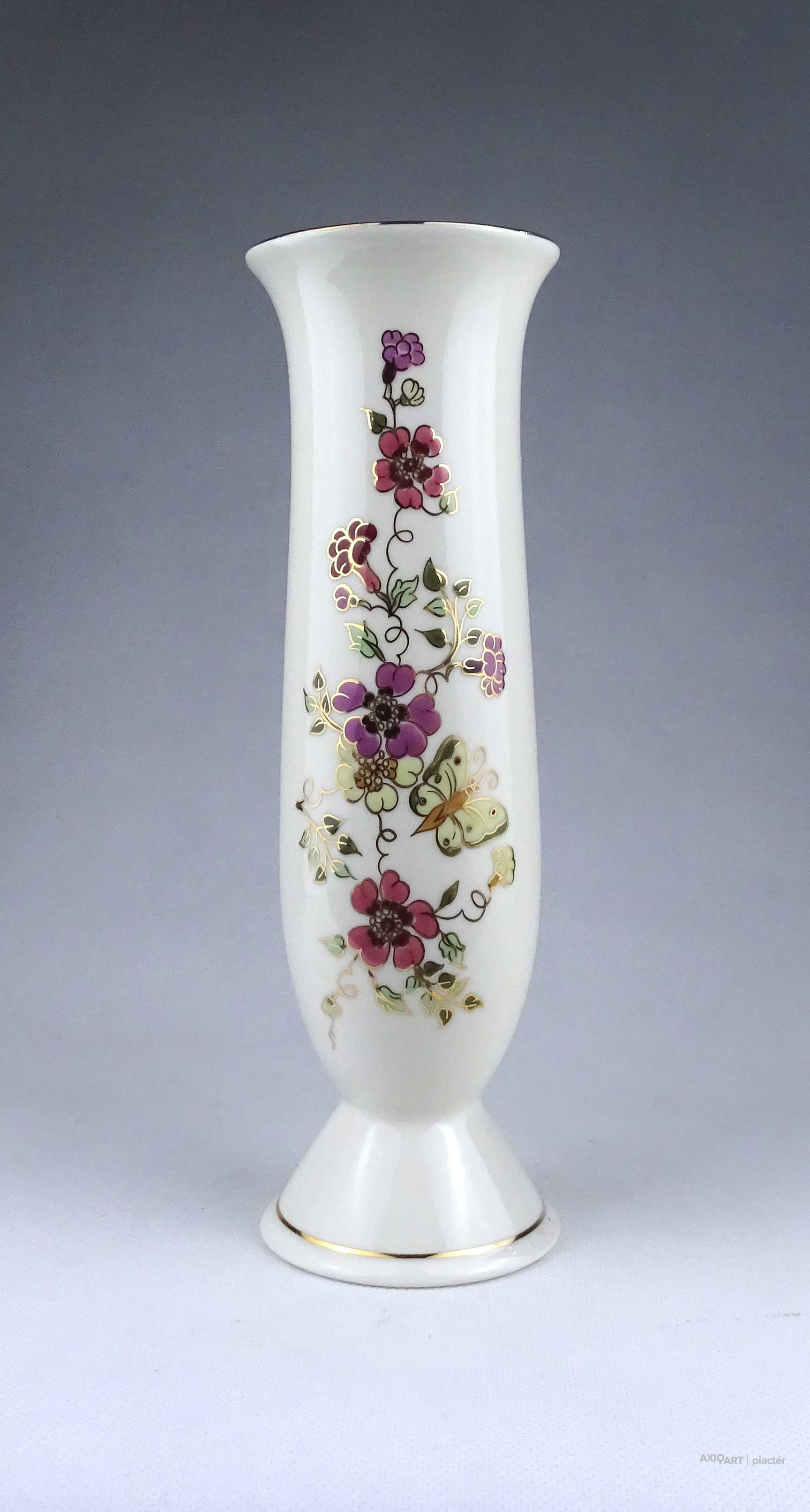 [1X618/Z034] Hibátlan állapotú, gazdagon aranyozott virágmintás, pillangós Zsolnay porcelán váza. Alján zöld színű felirat és Zsolnay márkajelzés: KÉSZÜLT A MOL RÉSZÉRE ZSOLNAY HUNGARY 1868 PÉCS HAND-PAINTED Arannyal formaszám: 871/40/026 Magasság: 16.3 cm Szélesség: 8.2 cm Súly: 0.255 kg Átmérője 12,5 cm. Magassága 6,5 cm. Súlya 257 g.