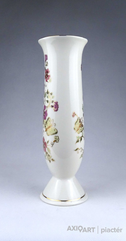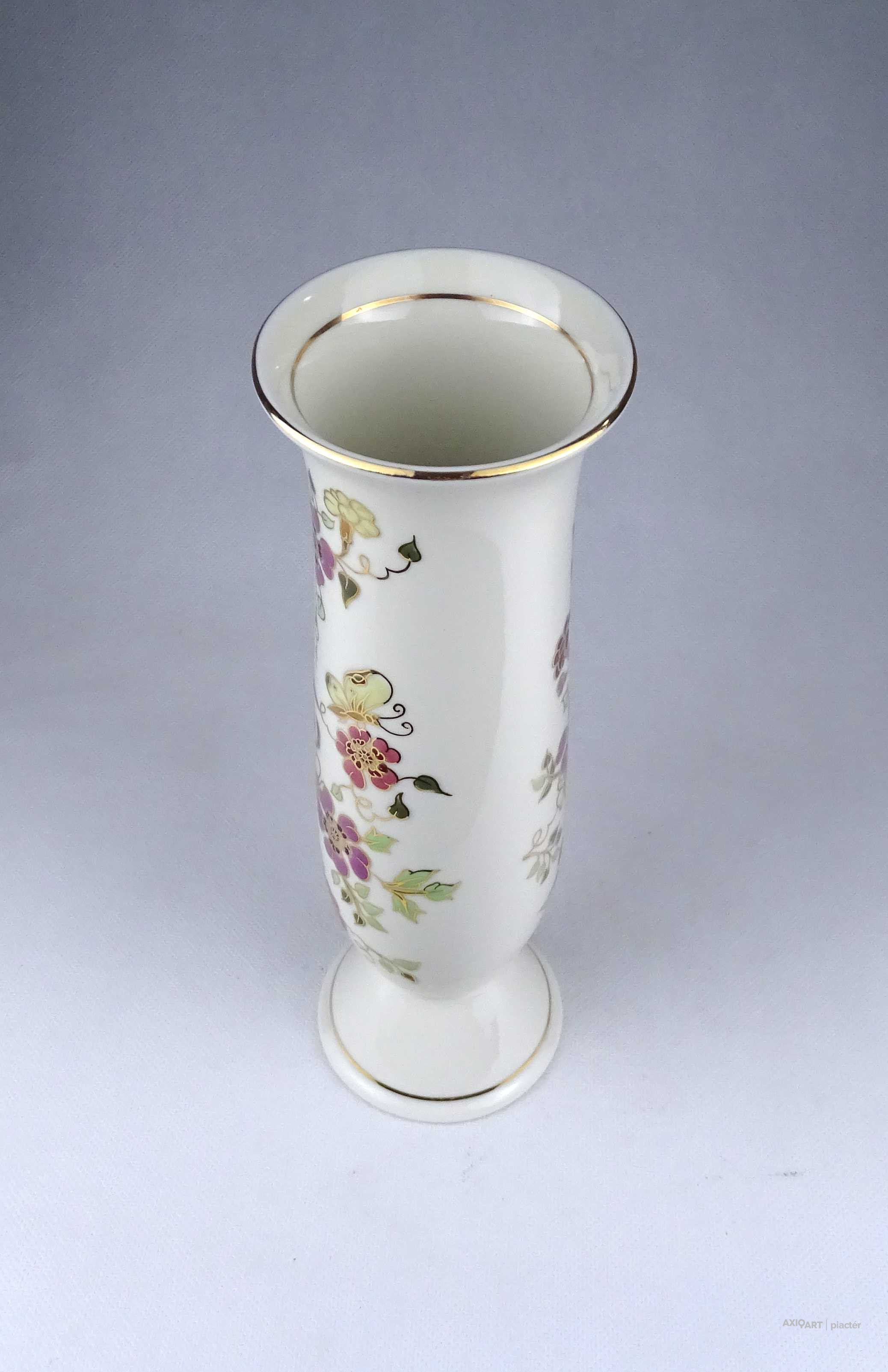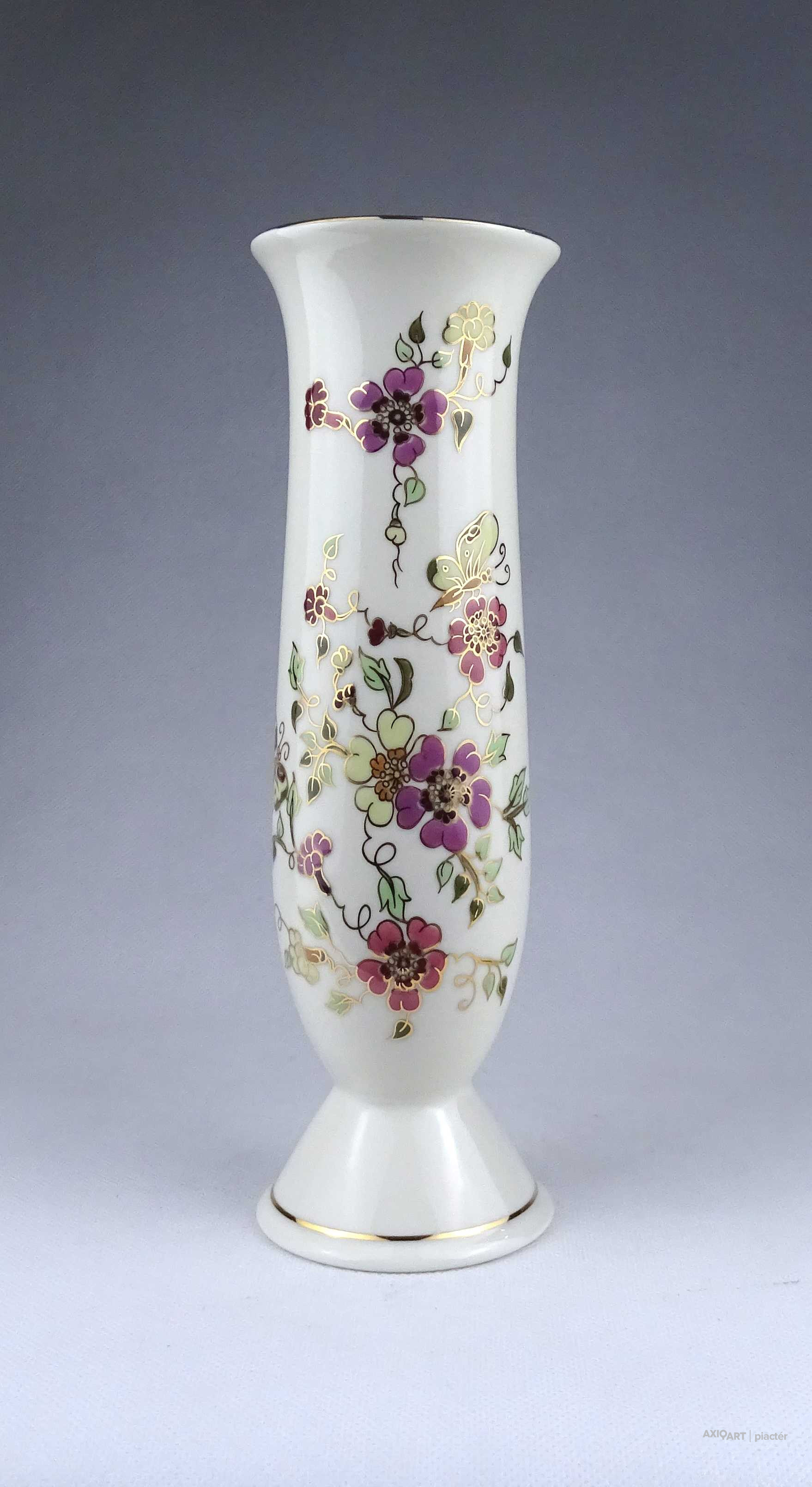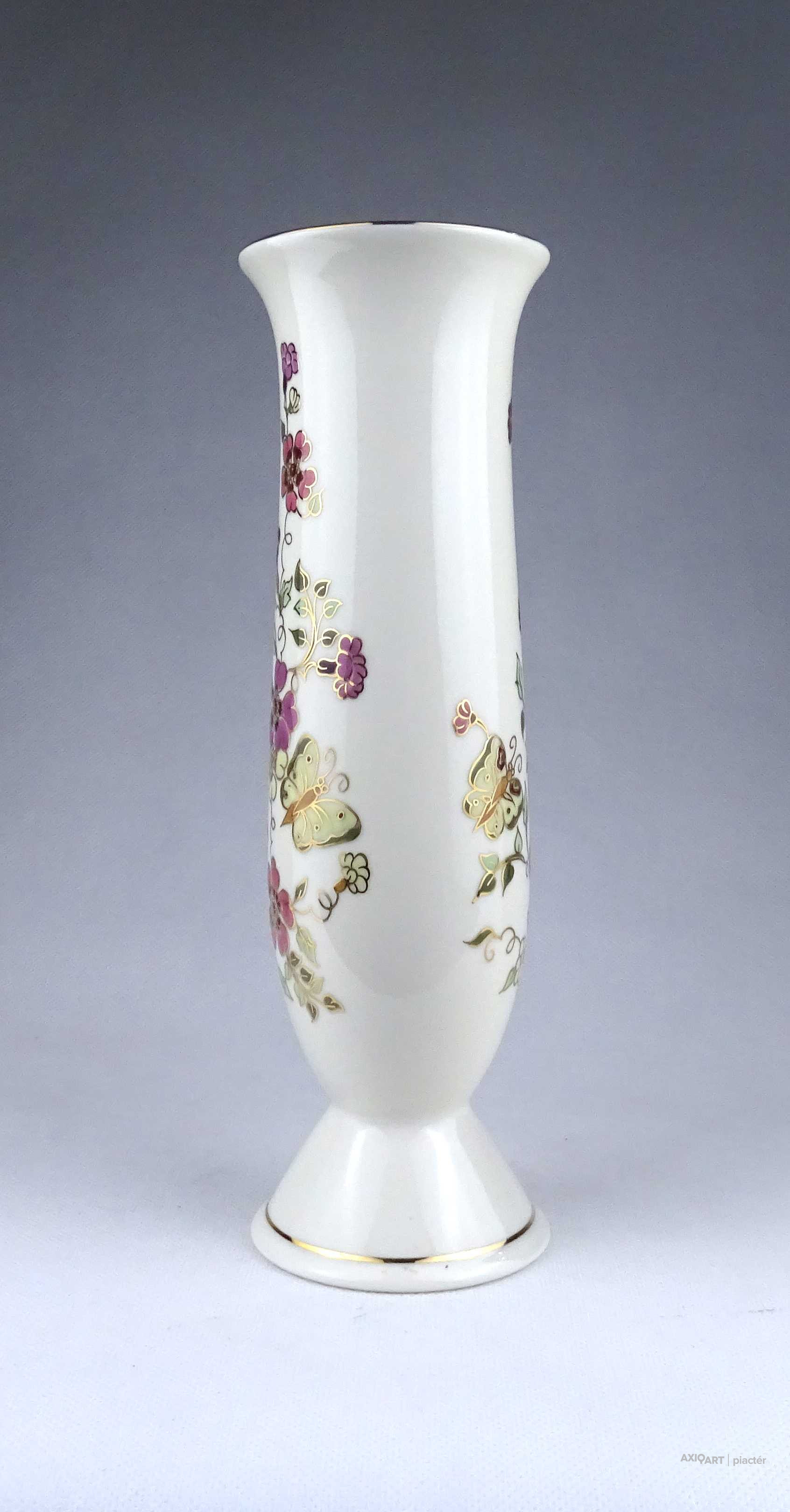 [1X618/Z034] Hibátlan állapotú, gazdagon aranyozott virágmintás, pillangós Zsolnay porcelán váza. Alján zöld színű felirat és Zsolnay márkajelzés: KÉSZÜLT A MOL RÉSZÉRE ZSOLNAY HUNGARY 1868 PÉCS HAND-PAINTED Arannyal formaszám: 871/40/026 Magasság: 16.3 cm Szélesség: 8.2 cm Súly: 0.255 kg Átmérője 12,5 cm. Magassága 6,5 cm. Súlya 257 g.