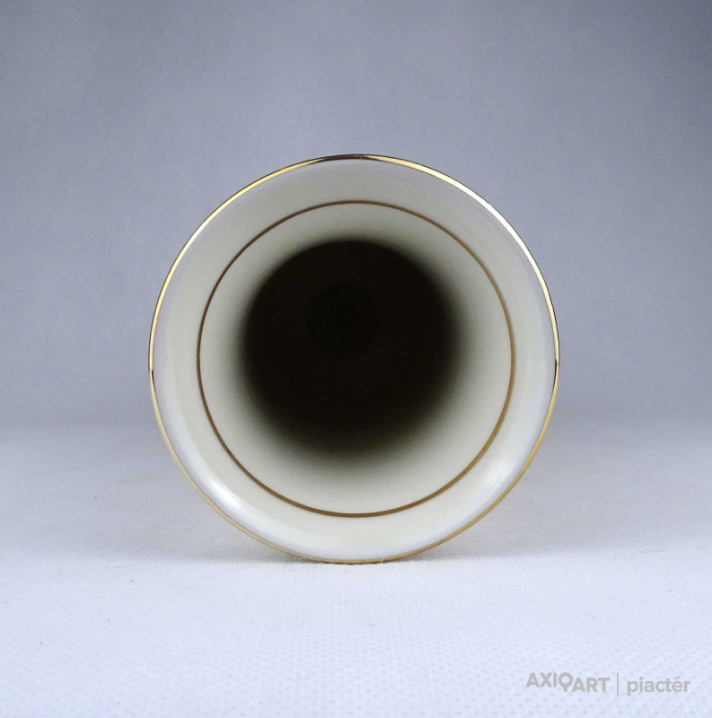 [1Z719/Z008] Régi, hibátlan állapotú vajszínű gazdagon aranyozott virágmintákkal díszített, karcsú Zsolnay porcelán váza, díszváza. Alján zöld színű Zsolnay öttornyú márkajelzés: ZSOLNAY HUNGARY 1853 PÉCS HAND-PAINTED Arannyal formaszám: 9170/II/139 28 Magasság: 19.8 cm Szélesség: 5.5 cm Súly: 0.22 kg Átmérője 7,5 cm. Magassága 12,5 cm. Súlya 245 g.