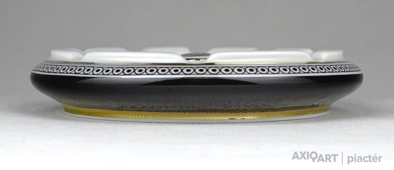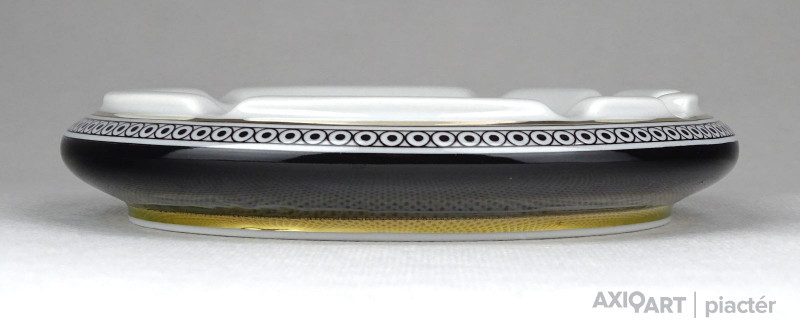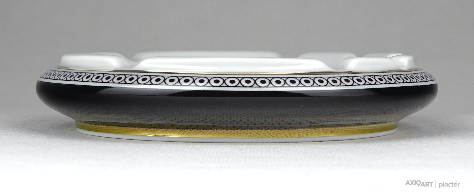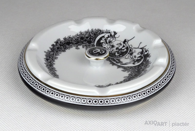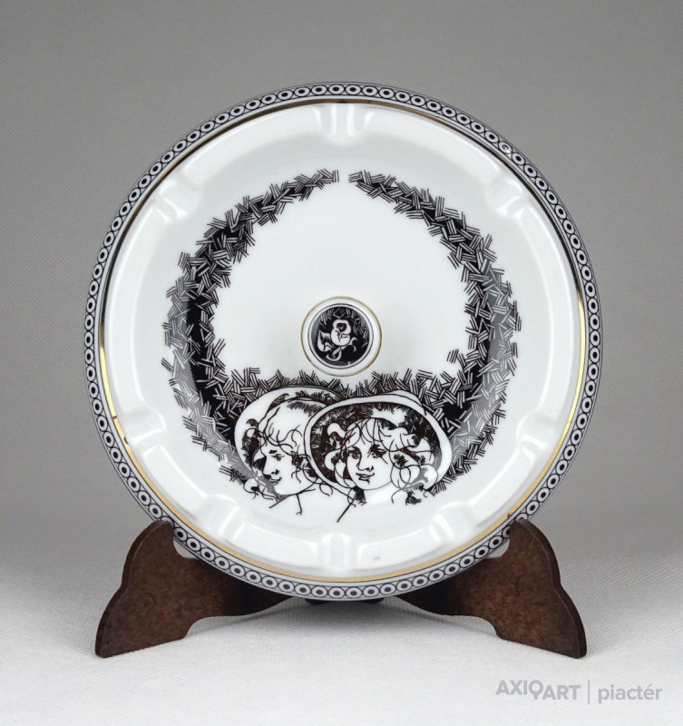 [1D229/UZ-N] Hibátlan állapotú, Hollóházi porcelán hamutál. Közepében két kalapos úrhölgy Jurcsák László tervei szerint. Alján kék színű márkajelzés: HOLLÓHÁZA HUNGARY 1831 Formaszám: 7001 Szélesség: 12.5 cm Súly: 0.2 kg