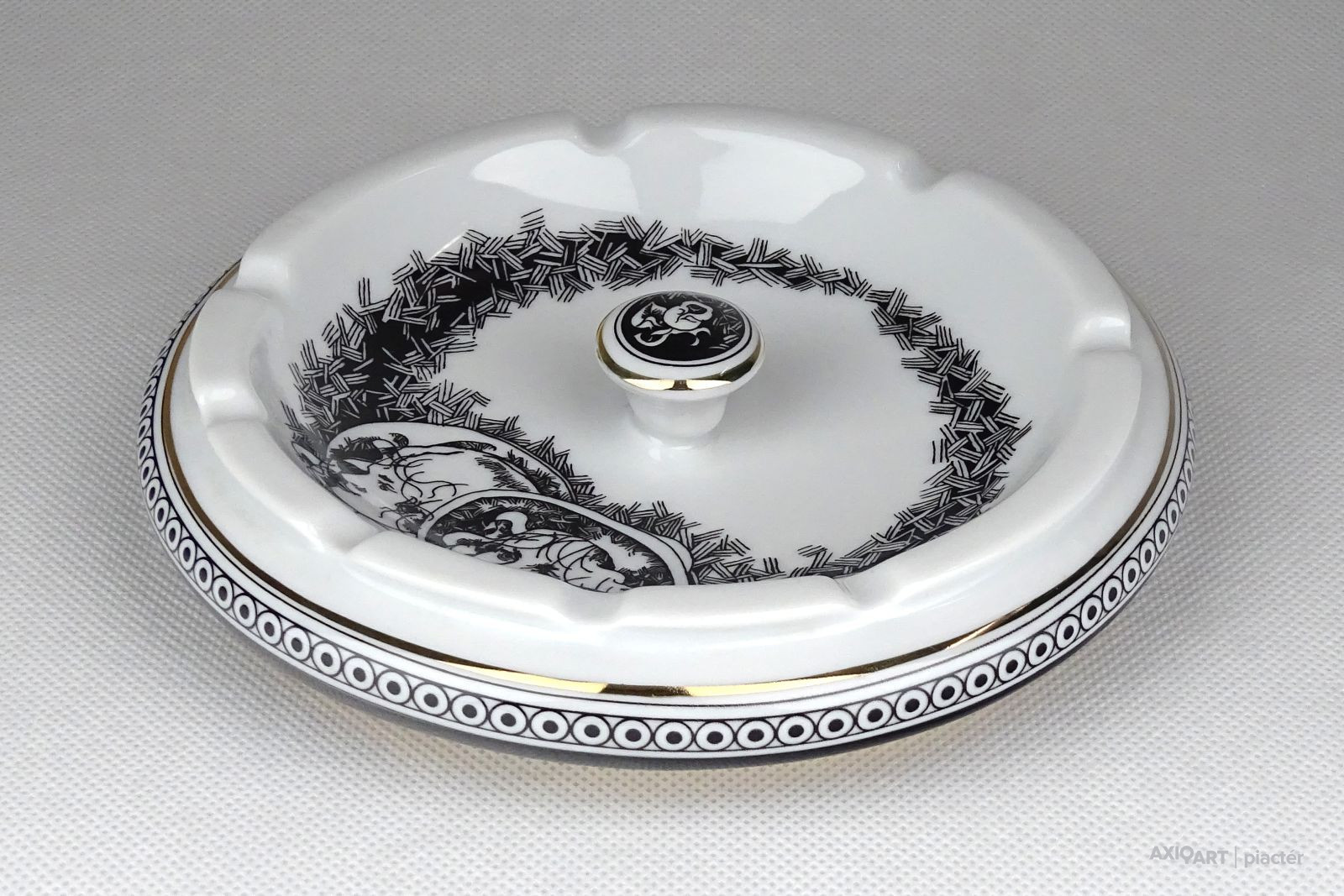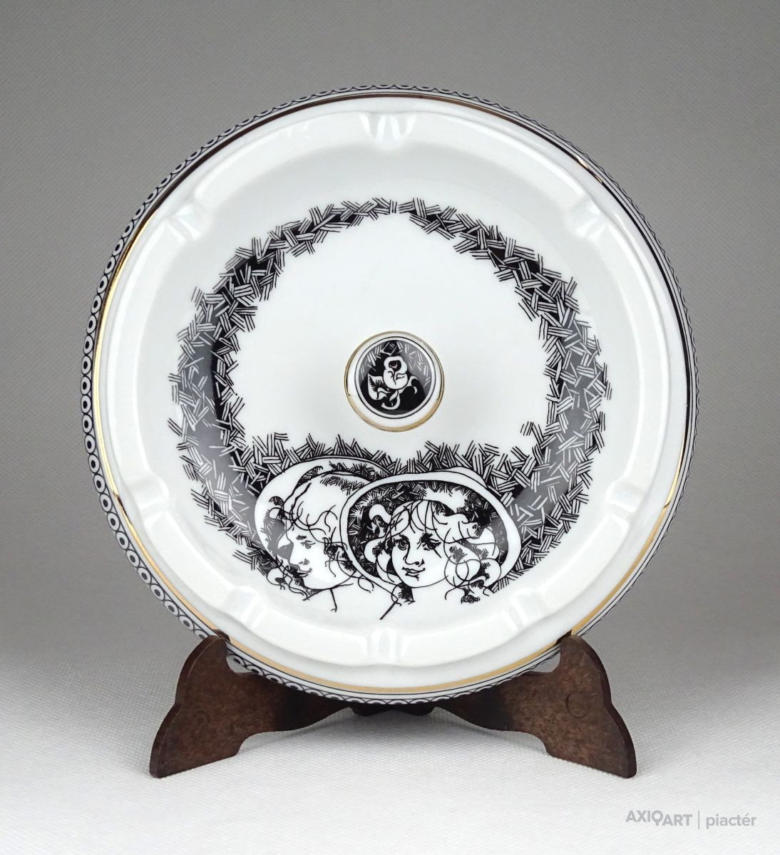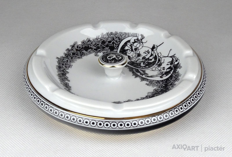[1D150/UZ-N] Hibátlan állapotú, Hollóházi porcelán hamutál. Közepében két kalapos úrhölgy Jurcsák László tervei szerint. Alján kék színű márkajelzés: HOLLÓHÁZA HUNGARY 1831 Formaszám: 7000 Szélesség: 14.5 cm Súly: 0.305 kg