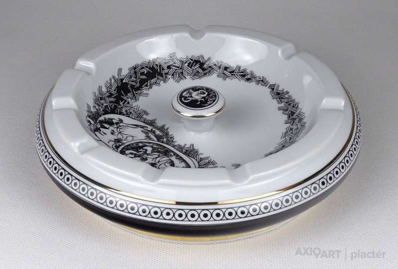 [1K580/UZ-N] Hibátlan állapotú, Hollóházi porcelán hamutál. Közepében két kalapos úrhölgy Jurcsák László tervei szerint. Alján kék színű márkajelzés: HOLLÓHÁZA HUNGARY 1831 Szélesség: 17 cm Súly: 0.84 kg