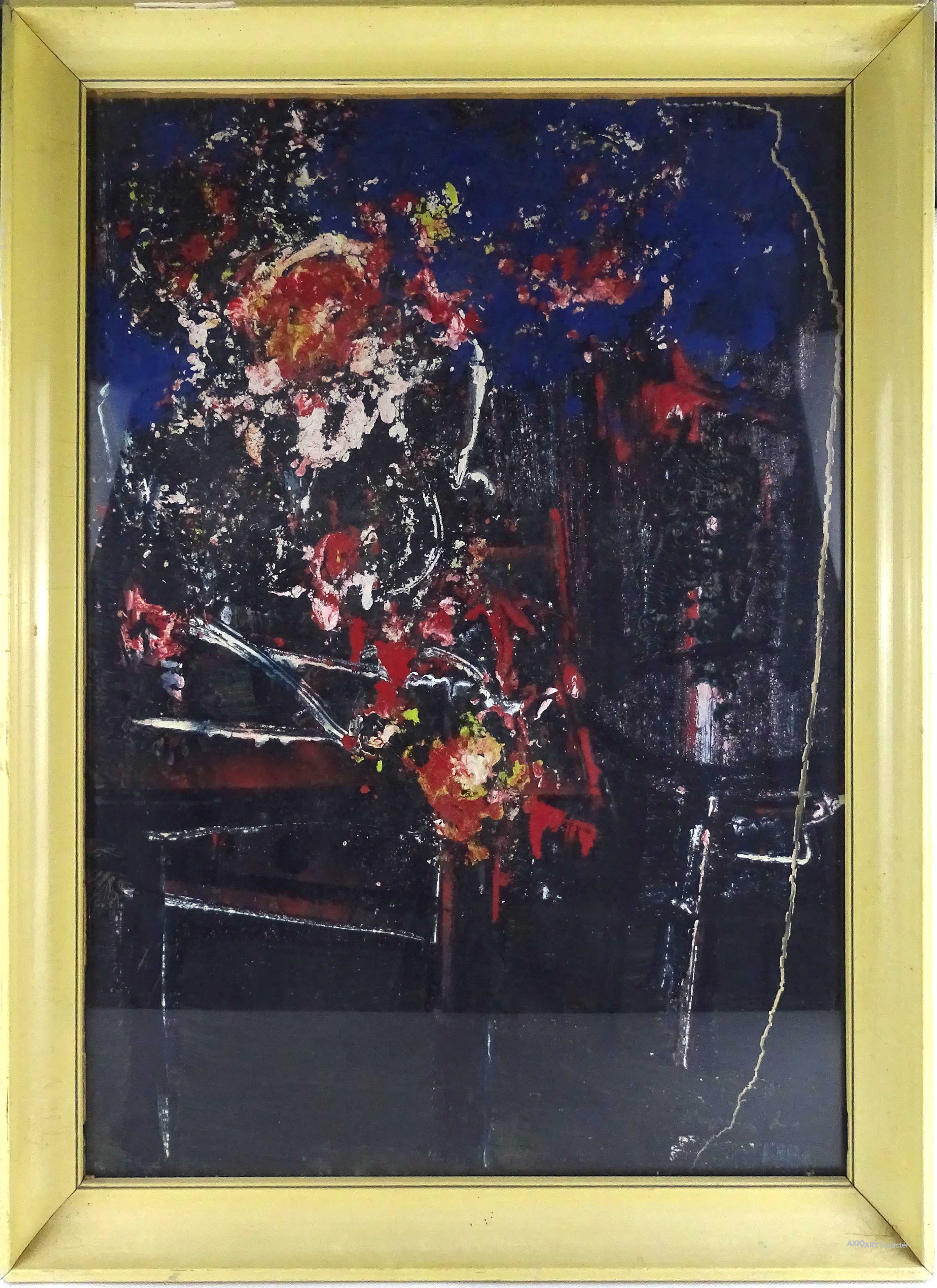 [1Z261/133] Tempera papír festmény kartonra kasírozva, üveglap mögött, világos színű képcsarnokos keretben. A festményen egy szakadás fut végig, lásd fotó. Grafitceruzás jelzés jobbra lent: KAPCSA J. Hátoldalán Képcsarnokos papírcímke: Művész neve: KAPCSA JÁNOS Művészeti alkotás címe: KRIZANTÉM Magasság: 76.5 cm Szélesség: 56 cm Súly: 4.44 kg Kapcsa János festőművész.   (Álmosd, 1940. június 9. – Debrecen, 2011. május 9.)    Élete   Kapcsa János 1940-ben született Álmosdon. A debreceni Medgyessy Ferenc Képzőművészeti Körben tanult, Félegyházi László és Bíró Lajos tanítványaként. 1963-tól szerepelt megyei és országos tárlatokon, köztük több alkalommal Debrecenben és más országos tárlatokon is. 1968-tól tagja a Képzőművészeti Alapnak is. 1970-ben a budapesti Fényes Adolf Teremben mutatta be alkotásait. Festményei figuratív és nonfiguratív megfogalmazásúak. Mindig eredeti élményekől indul ki, ugyanakkor felhasználja a klasszikus avantgárd tanulságait is. Festészete többnyire szociális témakörű. Érzelmi kötődéssel az Alföldhöz, az ott élő emberekhez és motívumokhoz. A világot kissé műemlékszerűen látja, talán ezért is tűnnek tragikusnak, ahogyan megfesti képein. Alkotásait a grafika és a festői elemek ötvözetéből alakítja ki. Szűkebb világának népi hagyományai is megjelennek műveiben. Debrecenben, 71 évesen, 2011 május 9-én hunyt el.   Forrás: wikipédia.hu
