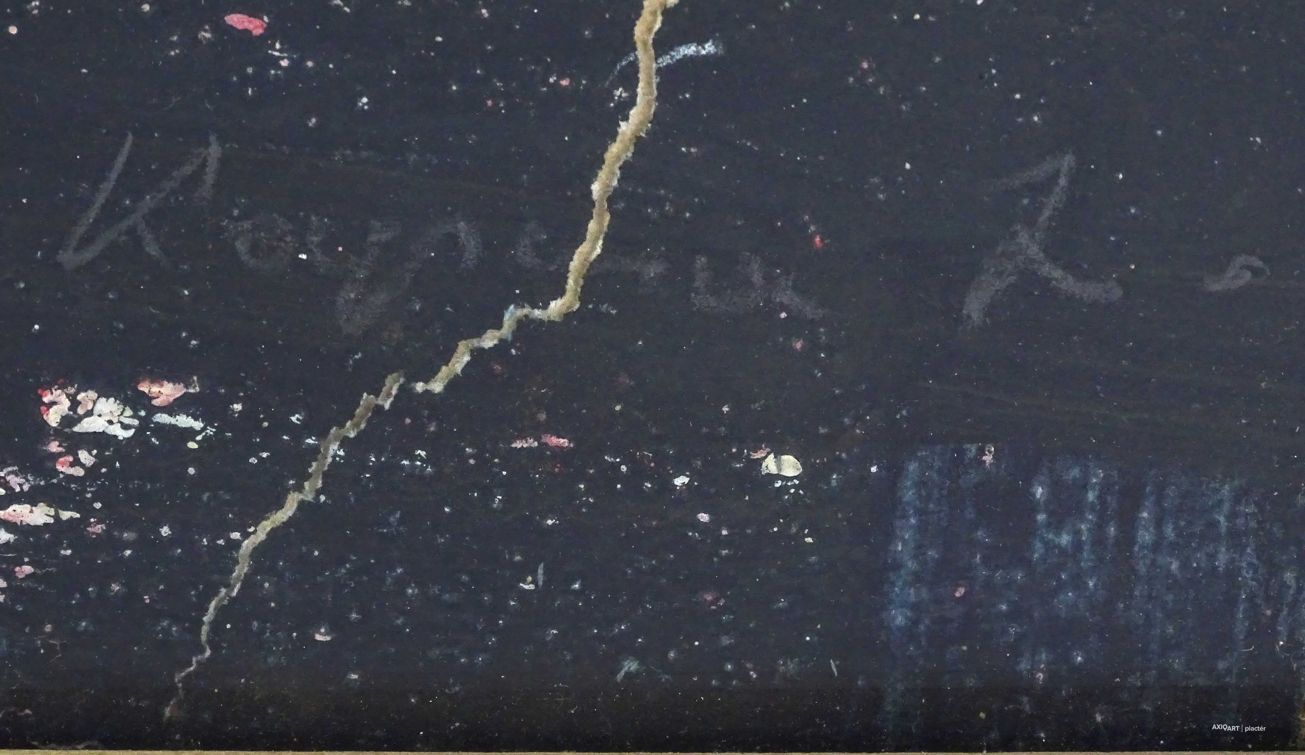 Tempera papír festmény kartonra kasírozva, üveglap mögött, világos színű képcsarnokos keretben. A festményen egy szakadás fut végig, lásd fotó.
