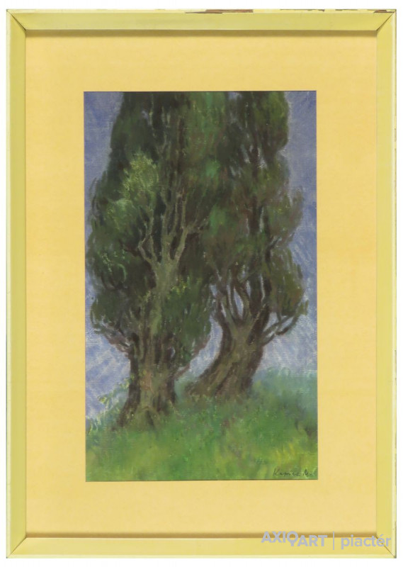 [FKB784/Bp204/118] A kép mérete: 46 x 27,5 cm keret nélkül. Készült: Pasztell, Papír A kép Kapicz Margit (Szob, 1921, Budapest, 1995) alkotása. Jelezve jobbra lent "Kapicz M." A festmény jó állapotban van. Keret: Sérült A festmény hátoldalán a Képcsarnok Vállalat raglapja található. Magyar festők és grafikusok életrajzi lexikona I-II. Festő. A fővárosi Képzőművészeti Főiskolán Rudnay Gyula, Elekfy Jenő és Barcsay Jenő tanítványa volt. 1947 óta szerepel hazai és külföldi tárlatokon. 1963-ban, 1967-ben, 1975-ben Budapesten, több vidéki tárlaton, 1965-ben pedig Olaszországban szerepelt alkotásaival. Az olaszország vallonbrosai festőversenyen ezüstérmet kapott. Jugoszláviában festett alkotásait, ott és Budapesten mutatta be. Prágában két ízben vett részt kollektív tárlatokon. Tájképeket, gyermekportrékat, figurális kompozíciókat fest. Tájképein, a nyugalmas és a csendes bőzsönyi falvak, az Ipoly, füzesek, a magányos fák lírai hangvételű, sajátos technikájú ábrázolója. Eleinte olajban festett, később áttért a gouach-ra. Műveit megtaláljuk a tápiószelei és a szobi múzeumokban. (ML, MÉ, KMML) Magyar festők és grafikusok életrajzi lexikona I-II. Műgyűjtők és kereskedők kézikönyve Festő. A bp.-i Képzőművészeti Főiskolán Rudnay Gyula, Elekfy Jenő és Barcsay Jenő tanítványa volt. 1947 óta szerepel hazai és külföldi tárlatokon. 1963-ban, 1967-ben, 1975-ben Budapesten, több vidéki tárlaton, 1965-ben pedig Olaszországban szerepelt alkotásaival. Az olaszországi vallonbrosai festőversenyen ezüstérmet kapott. Jugoszláviában festett műveit, ott és Budapesten mutatta be. Prágában két ízben vett részt kollektív kiállításokon. Tájképeket, gyermekportrékat, figurális kompozíciókat fest. Tájképein, a nyugalmas és a csendes bőzsönyi falvak, az Ipoly, fűzesek, a magányos fák lírai hangvételű, sajátos technikájú ábrázolója. (ML, MÉ) Magyar festők és grafikusok adattára Festészeti tanulmányait Berényi Róbert zebegényi szabadiskolájában kezdte, majd a Főiskolán Rudnay Gyula és Elekfy Jenő növendéke volt. Csoportos bemutatók mellett 1963-ban, 1967-ben, 1975-ben Budapesten, 1969-ben és 1971-ben Szobon jelentkezett önálló kiállítással. 1965-ben Olaszországban volt bemutatója, ugyanitt a vallonbrosai festőversenyen ezüstérmet nyert. - A nyugalmas, csöndes bözsönyi falvak, az Ipoly, füzesek, magányos fák lírai hangvételű és sajátos technikájú ábrázolója. - Irod.: P.Sz.T.: Művész életrajz. Bp. 1985 Művészeti lexikon I-IV. Festő. A Képzőművészeti Főiskolán 1942-45 között Rudnay Gyula, majd 1946-48 között Berény Róbert tanítványa volt. 1947 óta szerepel kiállításokon. Jugoszláviai tanulmányútján festett képeit bemutatta Jugoszláviában és Bp.-en is (1947). Több csoportos kiállításon vett részt, két alkalommal Prágában is. 1965-ben olaszo.-i tanulmányútján San Giovanni Valdarnóban rendezett önálló kiállítást. Tájképeket, gyermekportrékat, figurális kompozíciókat fest. Művész életrajzok kortárs magyar képzőművészek Festészeti tanulmányait Berényi Róbert zebegényi szabadiskolájában kezdte, majd Rudnay Gyula és Elekfy Jenő növendéke volt a főiskolán. Csoportos bemutatók mellett 1963-ban, 1967-ben, 1975-ben és 1980-ban Budapesten, 1968-ban, 1970-ben és 1979-ben Szobon jelentkezett önálló kollekciókkal. 1965-ben bemutatkozott Olaszországban, ugyanitt a vallonbrosai festőversenyen ezüstérmet nyert. - A nyugalmas-csendes börzsönyi falvak, s az itteni változatos természeti környezet lírai hangvételű ábrázolója.