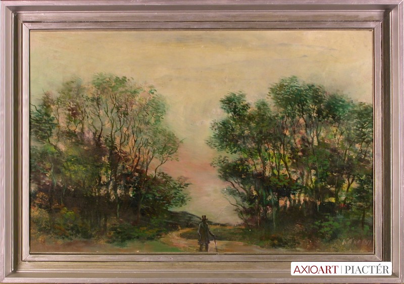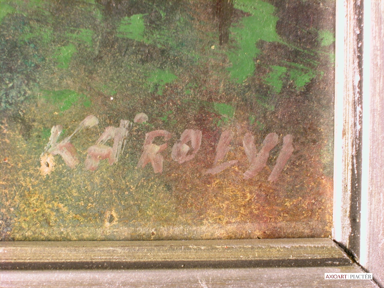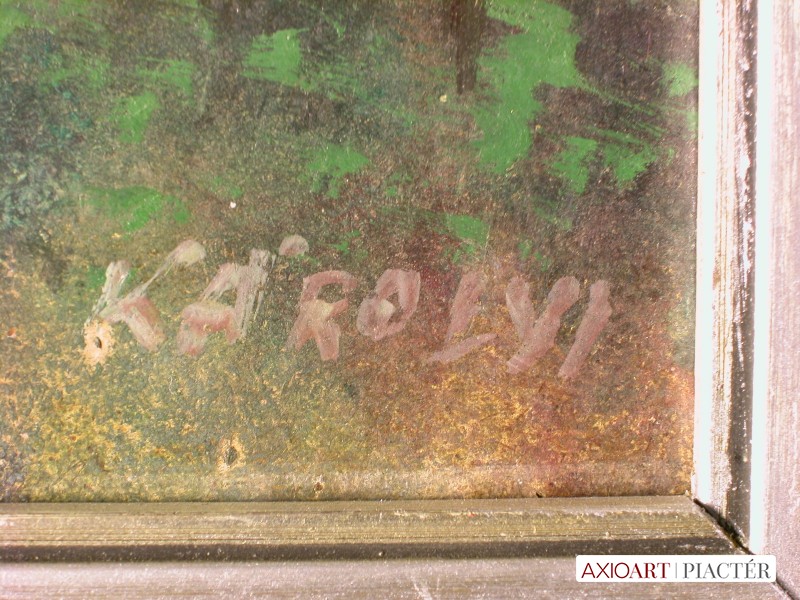 [FK0084/Bp41/40] A kép mérete: 43 x 63 cm keret nélkül. Készült: Olaj, Farost A kép Károlyi Ernő (Pesterzsébet, 1923) alkotása. Jelezve Jobbra lent "Károlyi" A festmény jó állapotban van. Keret: Ép A festmény hátoldalán Zichy Mihály alkotóközösségi címke található. Magyar festők és grafikusok életrajzi lexikona I-II. Festő. A budapesti Iparrajziskolában kezdte tanulmányait, utána Kmetty János szabadiskoláját látogatta. 1946-51 között a Képzőművészet Főiskolán folytatott tanulmányokat. Berény Róbert, Pór Bertalan és Szőnyi István növendéke volt. Az 50-es évek első felében a legszigorúbb neoakadémizmus világában nevelkedett. Tanulmányúton járt több kelet-európai országban, Franciaországban és Itáliában. 1964-ben a Fényes Adolf Teremben, 1972-ben a Mednyánszky Teremben, 1988-ban Az Ernst Múzeumban, 1997-ben a Duna Galériában és a Szinyei Szalonban, több vidéki városban és Németországban mutatta be alkotásait. Korai alkotókorszakában posztimpresszionista tájakat, csendéleteket és életképeket festett, majd a '60-as években Picasso, Braque, Delauney művészetének tanulságait kamatoztatva festői elvonatkoztatások felé fordult. Utazásainak élményeit és emlékeit posztimpresszionista felfogású, olajjal festett város- és tájképsorozatokon örökítette meg. Emellett a '80-as évektől lírai absztrakt és absztrakt expresszionista szemléletű, érzékeny színvilággal komponált, geometrikus és amorf alakzatokat szintetizáló, erőteljes elvont festészetet teremtett. Kollázsokkal, intarziatervekkel is szerepelt kiállításokon. Munkái helyet kaptak a Magyar Nemzeti Galériában és több vidéki képtárban. (W. T. adatközlése nyomán, MÉ, V.L.: Műv. 1972/9, W.T.: Műv. 1988/9) Magyar festők és grafikusok életrajzi lexikona I-II. Műgyűjtők és kereskedők kézikönyve Festő. A bp.-i Iparrajziskolában kezdte tanulmányait, utánna Kmetty János szabadiskoláját látogatta. 1946-51 k. tanulmányokat folytatotta bp.-i Képzőművészeti Főiskolán. Berényi Róbert, Pór Bertalan és Szőnyi István növendéke volt. Az 50-es évek első felében a legszigorúbb neoakadémizmus világában nevelkedett. Tanulmányúton járt több kelet-európai országban, Franciaországban és Itáliában. 1964-ben a Fényes Adolf Teremben, 1972-ben a Mednyánszky Teremben és vidéki városokban mutatta be műveit. Mértanias szemléletű, dekoratív hangütésű festő, elvonatkoztatásaiban azonban nem megy el a teljes absztrakcióig. Alkotásai olykor szimbólikus értelműek. Többnyire táj- és városképeket alkotott. Kollázsokkal, intarziatervekkel is szerepelt kiállításokon (MÉ, V.L.: Műv.-1972-8, W.T.: Műv.-1988/9) Magyar festők és grafikusok adattára 1951-ben fejezte be tanulmányait a Képzőművészeti Főiskolán. Tanulmányutakat tett Olasz- és Franciaországban, Csehszlovákiában, Romániában, Jugoszláviában. 1964-ben a Fényes Adolf Teremben, 1967-ben Szegeden, 1972-ben a Mednyánszky Teremben, 1973-ban Miskolcon, 1974-ben a Csepel Galériában és Nyíregyházán állította ki festményeit és kollázsait. - Mértanias szemléletű, dekoratív hangütésű festő, elvonatkoztatásaiban azonban nem megy el a teljes abasztrakcióig. Színgazdag, érzékletes felületi hatásokkal dolgozó képei olykor szimbolikus értelműek. - Irod.: P. Sz. T.: Művész életrajzok. Bp. 1985. Művész életrajzok kortárs magyar képzőművészek Festő. 1951-ben fejezte be tanulmányait a Képzőművészeti Főiskolán. Tanulmányúton járt számos nyugat-európai országban, Csehszlovákiában és az NDK-ban. 1964-ben a Fényes Adolf Teremben, 1967-ben Szegeden, 1972-ben a Mednyánszky Teremben, 1973-ban Miskolcon, 1974-ben a Csepel Galériában és Nyíregyházán, 1979-ben Nagykanizsán, 1981-ben az NSZK-ban, 1982-ben Salgótarjánban állította ki festményeit és kollázsait. - Geometrizáló szemléletű, dekoratív hangütésű festő, némely munkájában eljut a teljes absztrakcióig. Színgazdag, érzékletes felületi hatásokkal dolgozó képei olykor szimbolikus értelműek. Murális feladatok is foglalkoztatják. Kortárs magyar művészeti lexikon I-III. Festő, grafikus. 1937-41: Főv. Iparrajzisk., bútortervezői tanulmányok; 1946-51: MKF, mestere: Kmetty János, Berény Róbert, Pór Bertalan, Barcsay Jenő, Szőnyi István. Budapesten él és dolgozik. Korai alkotószakaszában posztimpresszionista tájakat, csendéleteket és életképeket festett, majd a 60-as években Picasso, Braque és Delauney művészetének tanulságait kamatoztatva a festői elvonatkoztatás felé fordult. Az európai országokban, elsősorban a mediterrán tájakon 1962-től napjainkig tett utazásainak élményeit és emlékeit posztimpresszionista felfogású, olajjal festett táj- és városképsorozatokon örökítette meg, amelyekből számos kiállítást rendezett. Emellett a 80-as évektől lírai absztrakt és absztrakt expresszionista szemléletű, érzékeny színvilággal komponált, geometrikus és amorf alakzatokat szintetizáló, erőteljes elvont festészetet teremtett. Festészeti munkái mellett jelentősek kollázsai is. Ek: 1962: Május 1. mozi, Bp.; 1964: Románia és Csehszlovákia tájai, Fényes A. T. (kat.); 1967: Olasz tájak, Gulácsy T., Szeged; 1972: Mednyánszky T. (kat.) ; 1973: Libresso, Miskolc; 1974: Csepel G.; Benczúr Gyula T., Nyíregyháza; 1979: Egry J. T., Nagykanizsa; 1981: Werner Jaeger Halle, Nettetal (NSZK); 1984: Képcsarnok, Salgótarján; 1985: Kollázsok, Pataky G., Dési Huber T., Veszprém; 1986: SZOT Rózsadomb Üdülő, Bp.; 1987: Görög tájak, Derkovits T., Szhely; 1988: Mediterrán tájak, Csepel G. (kat.); Ernst M. (kat.); 1989: Műhely G., Szentendre; 1990: Börzsöny M., Szob; 1991: Aklmisck G., Gronau-Epe; 1992: Vigadó G. (kat.); 1993: Művésztelepi G. (kat.), Szentendre; 1997: Műcsarnok, Győr; 1999: Duna G