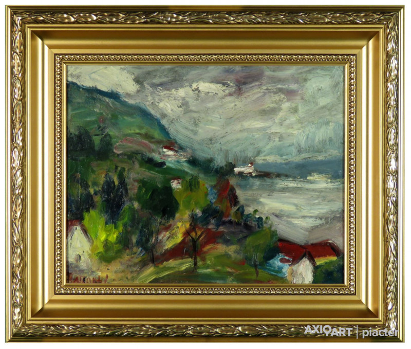[FK2668/Bp301/4] A kép mérete: 50,5 x 80,5 cm keret nélkül. Készült: Olaj, Vászon A kép Moldován István (Kolozsvár, 1911) alkotása. Jelezve Jobbra lent "Moldován István" A festmény jó állapotban van. Keret: Ép A festmény hátoldalán a Képcsarnokvállalat raglapja láltható. Magyar festők és grafikusok életrajzi lexikona I-II. Festő. Tanulmányait Kolozsvárott, a Szépművészeti Főiskolán kezdte 1930-ban. A következő esztendőben a nagybányai Szépművészeti Iskolában Thorma János és Krizsán János korrektúráján képezte magát. 1931-ben a budapesti Képzőművészeti Főiskola hallgatója lett. Réti István, később Szőnyi István volt a mestere. Már mint főiskolás sok díjat és kitüntetést nyert. 1948-ban megkapta a római ösztöndíjat, de lemondva róla, Erdélybe ment. 1948-1950 között Erdélyben élt, és népművészetben gazdag vidékein festett. 1943-ban Kolozsvárott, 1946-ban Gyöngyösön, 1955-ben, 1959-ben és 1962-ben a Kulturális Kapcsolatok Intézetében, illetve a Csók Galériában rendezett egyéni bemutatókat. Ezen kívül több Európai országban, az USA-ban, Kanadában és Indiában is bemutatta munkáit. Eleinte sajátos atmoszférájú, lírai tájképeket, eleven színvilágú képmásokat festett, később mondernebb, erőteljesebben szerkesztett művekkel jelentkezett. A Pécsi Tanárképző Főiskola számára mozaikot készített. Erdély szerelmese volt. A székely népművészet gazdag formavilágának hatása döntő jelentőségűvé vált sokoldalú művészetében. Műv. díjak: a Szinyei Társaság elismerő oklevele, a Főváros festészeti-díja, "Kolozsvár a képzőművészetben" II. díj, állami ösztöndíj, római ösztöndíj, a Képzőművészek Szövetsége Észak-Magyarországi festészeti díja, SZOT festészeti díj. Több murális művet (mozaik) alkotott. A Magyar Nemzeti Galéria több alkotását őrzi. (M. L.: Műv. 1967/6, RI-NM) Magyar festők és grafikusok életrajzi lexikona I-II. Műgyűjtők és kereskedők kézikönyve Festő. Tanulmányait a kolozsvári Szépművészeti Főiskolán kezdte 1930-ban. A nagybányai szabadiskolában is megfordult. Itt Thorma János és Krizsán János korrektúráján képezte magát. 1931-ben Budapesten a Képzőművészeti Főiskola hallgatója lett. Réti István, később Szőnyi István volt a mestere. Már mint főiskolás sok díjat nyert. 1948-ban megkapta a római ösztöndíjat, de lemondva róla, Erdélybe ment. 1948-1950 k. Erdélyben élt, és népművészetben gazdag vidékein festett. 1943-ban Kolozsváron, 1946-ban Gyöngyösön, 1955-ben, 1959-ben és 1962-ben a Kulturális Kapcsolatok Intézetében, illetve a Csók Galériában rendezett önálló kiállítást. Ezen kívül több Európai országban, az USA-ban, Kanadában és Indiában is bemutatta műveit. Eleinte sajátos atmoszférájú, lírai tájképeket, eleven színvilágú képmásokat festett, később mondernebb, erőteljesebben szerkesztett művekkel jelentkezett. A Pécsi Tanárképző Főiskola számára mozaikot készített. Erdély szerelmese volt. A székely népművészet gazdag formavilágának hatása döntő jelentőségűvé vált sokoldalú művészetében. 1942-ben megkapta a Szinyei Társaság elismerését, és a Főváros festészeti-díjat,1943-ban elnyerte a "Kolozsvár a képzőművészetben" c. díjat. 1947-ben állami ösztöndíjat,1948-ban a római ösztöndíjat, 1972-ben a Képzőművészek Szövetsége Észak-Magyarországi festészeti díját kapta meg. A MNG több művét őrzi. (M. L.: Műv.-1976/6) Magyar festők és grafikusok adattára Tanulmányait Kolozsvárott a Képzőművészeti Főiskolán, majd Nagybányán Thorma János és Krizsán János irányítása mellett kezdte, 1931-től Budapesten megszakításokkal a Képzőművészeti Főiskolán Réti István és Szőnyi István növendékeként fejezte be. 1949-ben és 1950-ben ösztöndíjjal dolgozott Erdélyben, majd hosszú tanulmányutakra indult Nyugat-Európába, az Egyesült Államokba, s a Szovjetunióba. Először Kolozsvárott lépett a nyilvánosság elé 1943-ban, majd 1946-ban Egerben és Gyöngyösön, 1947-ben Miskolcon, 1948-ban Hatvanban, 1955, 1961 és 1981-ben a Csók Galériában, 1959-ben a KKI-ben, 1960-ban Nagykanizsán, 1963-ban Kiskunfélegyházán, 1966-ban Debrecenben, 1969 és 1975-ben Békéscsabán, 1971-ben a Mednyánszky Teremben, 1973-ban Gyöngyösön és Debrecenben, 1977-ben Egerben, 1979-ben Veszprémben, 1983-ban Miskolcon, 1984-ben Csepelen, 1986-ban a Vigadó Galériában rendezett önálló kiállítást. Külföldi kiállításai: Moszkva, Varsó, India, Szófia, Párizs, Bukarest, Belgrád, New York, Montreál és Toronto. Eddig közel kétezer színes táblaképet festett, de szívesen foglalkozik mozaikkészítéssel is. 1964-ben a Pécsi Pedagógiai Főiskola, 1968-ban a Salgótarjáni Kórház, 1969-ben a názáreti templom és 1970-ben a Videoton Vállalat díszterme részére mozaikot készített. - Erdély szerelmese. A székely népművészet gazdag formavilágának hatása döntő jelentőségűvé vált festészetében. Olyan formanyelvet alakított ki magának, amely színvilágában és summázó formaalakításában sajátos erdélyi zamat érződik, ugyanakkor korszerűen modern is konstruktivista stílusa. Munkásságát 1942-ben a Szinyei Társaság elismerésével és a Fővárosi festészeti-díjjal, 1943-ben Római-ösztöndíjjal, 1947-ben Állam ösztöndíjjal (Románai), 1963-ben a SZOT festészeti-díjával, 1972-ben a Képzőművészek Szövetsége Észak-Magyarországi festészeti-díjával tüntették ki. - Irod.: Bíró Béla: Kolozsváry Moldován István. Erdélyi Helikon, 1943.; Felvinczi Takács Zoltán: Kolozsváry Moldován István. Kolozsvár, 1943.; Dutka Mária: Magyar Nemzet, 1961.; Maksay László: Moldován István. Művészet, 1965.; D. Fehér Zsuzsa. Moldován István, Bp. 1971.; Theisler G