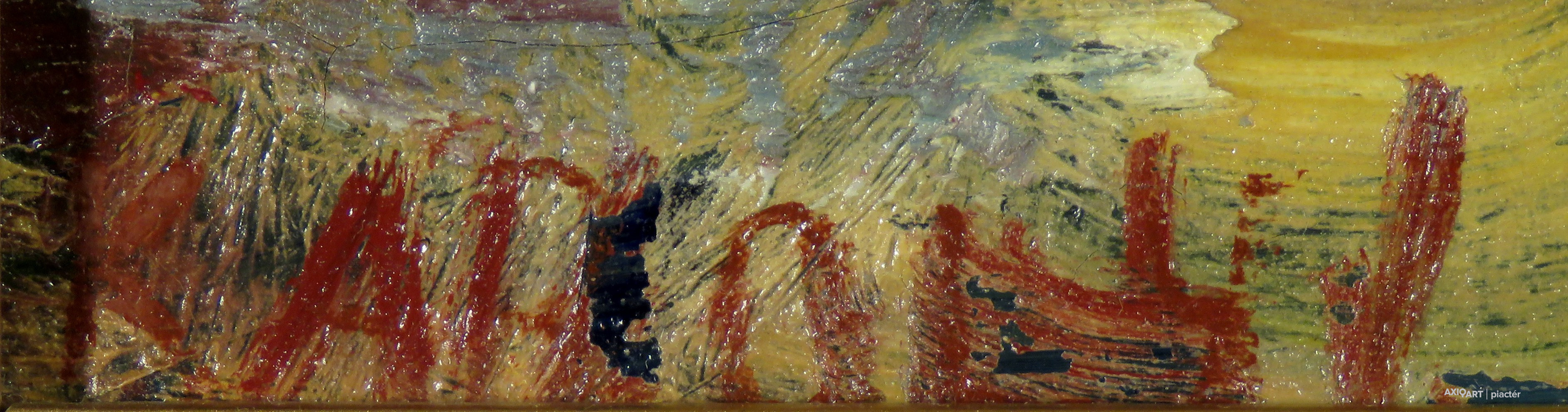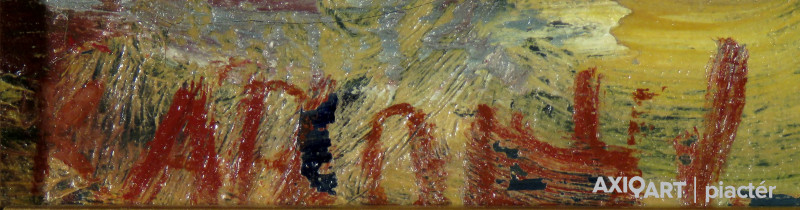 [FK0037/Z018] A kép mérete: 50 x 70 cm keret nélkül. Készült: Olaj, Vászon A kép Paizs László (Szentpéterúr, 1935) alkotása. Jelezve Jobbra lent "P. L." A festmény jó állapotban van. Keret: Ép A festmény hátoldalán a Képcsarnokvállalat címkéje található. Magyar festők és grafikusok életrajzi lexikona I-II. Festő. Tanulmányait a budapesti Iparművészeti Főiskolán végezte 1959-ben. Z. Gács György, Rákosy Zoltán és Szentiványi Lajos növendéke volt. A '60-as évek első felében hagyományosabb felfogású olajképeket festett, mozaikokat, freskókat, utóbb a pop-art körébe tartozó, a francia Arman munkáival rokon műveket alkotott. 1961 óta kiállító művész. Egyéni (Fényes Adolf Terem, Csók Galéria, Műcsarnok, Magyar Nemzeti Galéria, Halászbástya, Bástya Galéria, Vigadó Galéria, Budapest Galéria, Győr, Szombathely, Szeged, Zalaegerszeg, Duisburg, Aix-en-Provence, stb). és vegyes (Ernst Múzeum, Műcsarnok, Óbuda Galéria, Magyar Nemzeti Galéria, Csók Galéria, Vigadó Galéria, Székesfehérvár, Kaposvár, Pécs, Hódmezővásárhely, Firenze, Milano, Padova, Nápoly, Velence, Düsseldorf, Aachen, Genf, stb) tárlatokon vett részt. 1980-ban Munkácsy-díjjal jutalmazták, 1988-ban Érdemes Művész kitüntető elismerésben részesült. Munkáit őrzi a Magyar Nemzeti Galéria, a Fővárosi Képtár, a szombathelyi képtár, a pécsi Janus P. Múzeum, a székesfehérvári István Király Múzeum és a dunaszerdahelyi Kortárs Magyar Galéria. (H.B.: Műv, 1972/4, K.Gy.: Műv. 1977/2, K.G.: Műv. 1978/10, M.L.: Műv, 1983/5, R.G.: Műv, 1987/9, Sz.Gy.: Új Műv. 1995/4, MK) Magyar festők és grafikusok életrajzi lexikona I-II. Műgyűjtők és kereskedők kézikönyve Festő. Tanulmányait a bp.-i Iparművészeti Főiskolán végezte. Mozaikokat ferskókat, utóbb a pop-art körébe tartozó, a francia Arman műveivel rokon műveket alkotott. Mozaikok: a Szegedi Megyei Tanács, a Pécsi Óvoda, a Gödöllői Agrártudományi Egyetem. Freskók: Budapest - Csatárka úti Gyermekotthon. 1971-ben a Fényes Adolf Teremben volt kiállítása, 1983-ban pedig a szegedi Móra Ferenc Múzeumban nagyszabású tárlatokon mutatta be munkáit. 1988-ban érdemes művész kitüntető elismerésben részesült. (MK) Magyar festők és grafikusok adattára Az Iparművészeti Főiskolán végzett 1959-ben. Mozaikokat (Szeged, Megyei Tanács; Pécs, Óvoda; Gödöllő, Agrártudományi Egyetem), freskókat (Budapest, Csatárka úti Gyermekotthon), újabban a pop art körébe tartozó, a francia Arman műveivel rokon műveket alkotott. 1971-ben a Fényes Adolf Teremben nyílt kiállítása. 1983 februárjában a szegedi Móra Ferenc Múzeumban megrendezett nagyszabású tárlaton mutatta be alkotásait. 1988-ban érdemes művész kitüntető elismerésben részesült. - MK Művészeti lexikon I-IV. (Szentpéterur, 1935. dec. 26.- ): festő. Az Iparművészeti Főiskolán 1959-ben végzett Rákosy Zoltán, Z. Gách György és Szentiványi Lajos növendékeként. Épületdiszítő mozaikokat, (Szeged, Megyei Tanács, 1961; Pécs, Óvoda, 1964), műanyagfreskókat (Bp., Csatárka úti Gyermekotthon, 1964) és gobelinterveket készít. Kortárs magyar művészeti lexikon I-III. Festő, szobrász, grafikus. 1959: MIF, mesterei: Z. Gács György, Rákosy Zoltán, Szentiványi Lajos. 1980: Munkácsy-díj; 1988: érdemes művész. Főiskolás éveinek második felében, majd azt követően számos murális munka kivitelezésében vett részt, Fónyi Géza, Konecsni György, Z. Gács György, Rákosi Zoltán és Domanovszky Endre mellett dolgozva. A 60-as évek első felének hagyományosabb fölfogású olajképeket festett. 1964-ben a Velencei B.-n megismerkedett az amerikai pavilonban a pop art Európában akkor még újnak számító törekvésével, és részben ez inspirálta, hogy 1967-ben textil, fém, bőr anyagú "varrottas" képeket küldjön az FKS éves tárlatára; a megnyitó előtt többek között az ő munkáit is eltávolították a falról. A 70-es években pop art-os objekteket (A trónörököspár politikai gyilkosság áldozata lett, 1970, plexiüveg, újság, szarvasbogarak), majd konstruktív, átlátszó plexiüveg plasztikákat készített belső fénytörő határfelületekkel. A 80-as években készültek az anyagában színezett, konstruktív, nagyméretű poliészter szobrai, majd színes poliészter táblaképeket alkotott, mesterségesen roncsolt felületekkel, mintha régészeti leletek vagy atomtámadás utáni festmény-szurrogátumok lennének. Ekkor kezdett organikus plaszikájú bronzszobrokat is mintázni. A 90-es években, a táblaképek és szobrok mellett nagyméretű, egyedi grafikákat készített, formavilágában némileg a roncsolt táblaképekből kiindulva, de szinte kizárólag az emberi alakból elvonatkoztatott torzókat megjelenítve. Ek: 1966: Művészklub, Győr; 1971: Fényes A. T.; 1972: Bercsényi 28-30 G.; 1973: BME B-épület; 1976: Csók G.; 1977: G. Hildebrandt, Duisburg (NSZK); 1979: Bástya G., Halászbástya; Helyőrségi Műv. H., Nagyatád; József A. Műv. Közp., Szeged; Göcsej M., Zalaegerszeg; 1982: Bezzegh G., Küsnacht (CH); 1983: Móra F. M., Szeged; 1987: Műcsarnok (kat.); MNG; 1988: Pandora G., Badacsonytomaj; 1989: Parktheatter, Iserlohn (NSZK); Qualitas G.; Hevesi S. Színház, Zalaegerszeg; 1990: Vasarely Fondation (Ferdinánd Judittal, Fóth Ernővel), Aix-en-Provence (FR); 1994: Vigadó G.; 1997: Pest Center G.; 1998: Budapest G. (kat.); 1999: Pest Center G. (kat); G. Arcis, Sárvár; MMA, Bp.; 2001: SZK, Szhely; Ernst M. (kat.) Vcsk: 1961, 1964, 1966: FKS, Ernst M.; 1962: 9. Magyar Képzőműv. kiállítás, Műcsarnok; 1967: Mai magyar festészet, Új-Delhi; 1969: Vas megyei művészek, Savaria M., Szhely; V. Orsz. Grafikai B., Miskolc; 1971: Új művek, Műcsarnok; 1972: Fiatal művészek Budapestről. Likovni Salon, Újvidék (YU); 1972, 1973: Balatonboglár