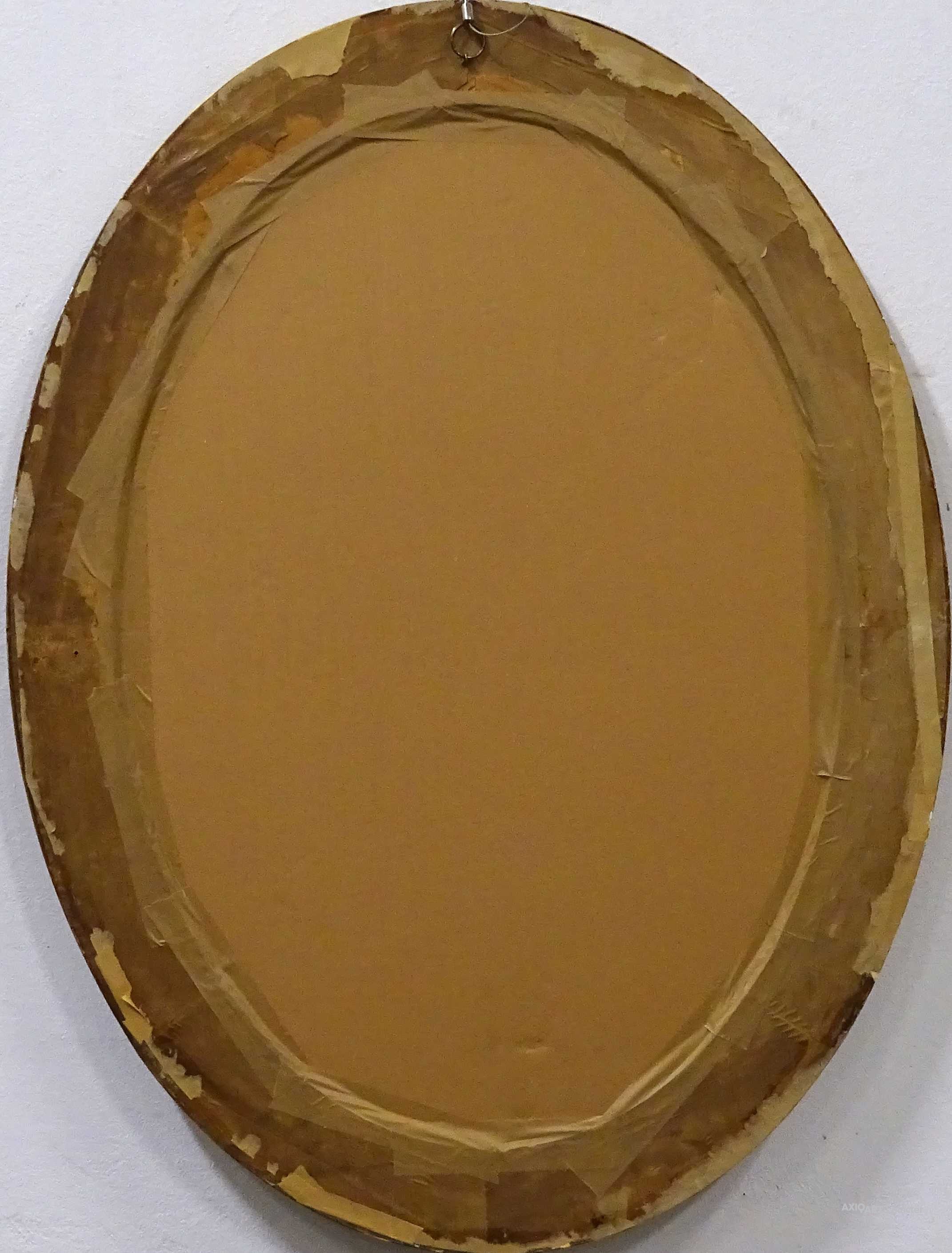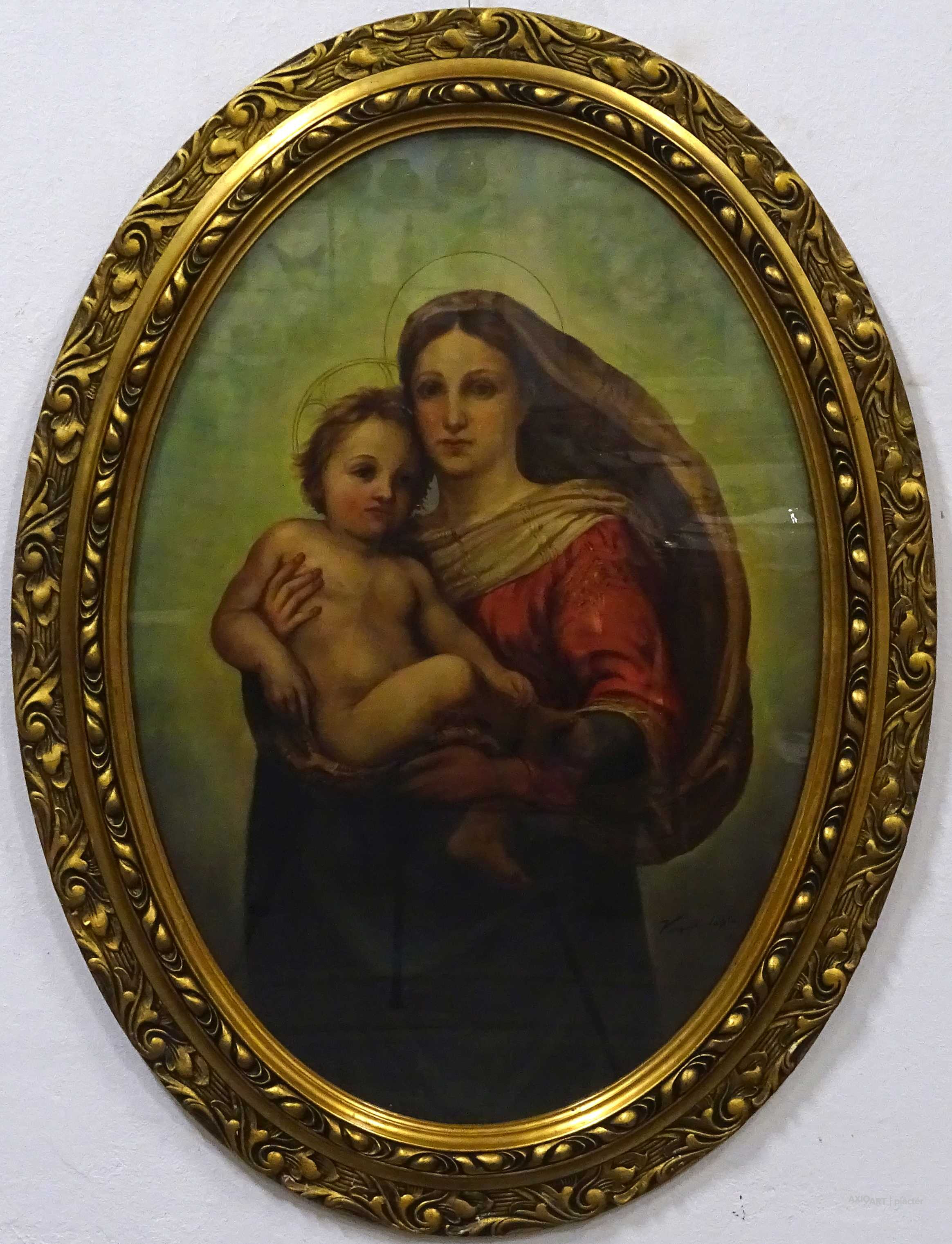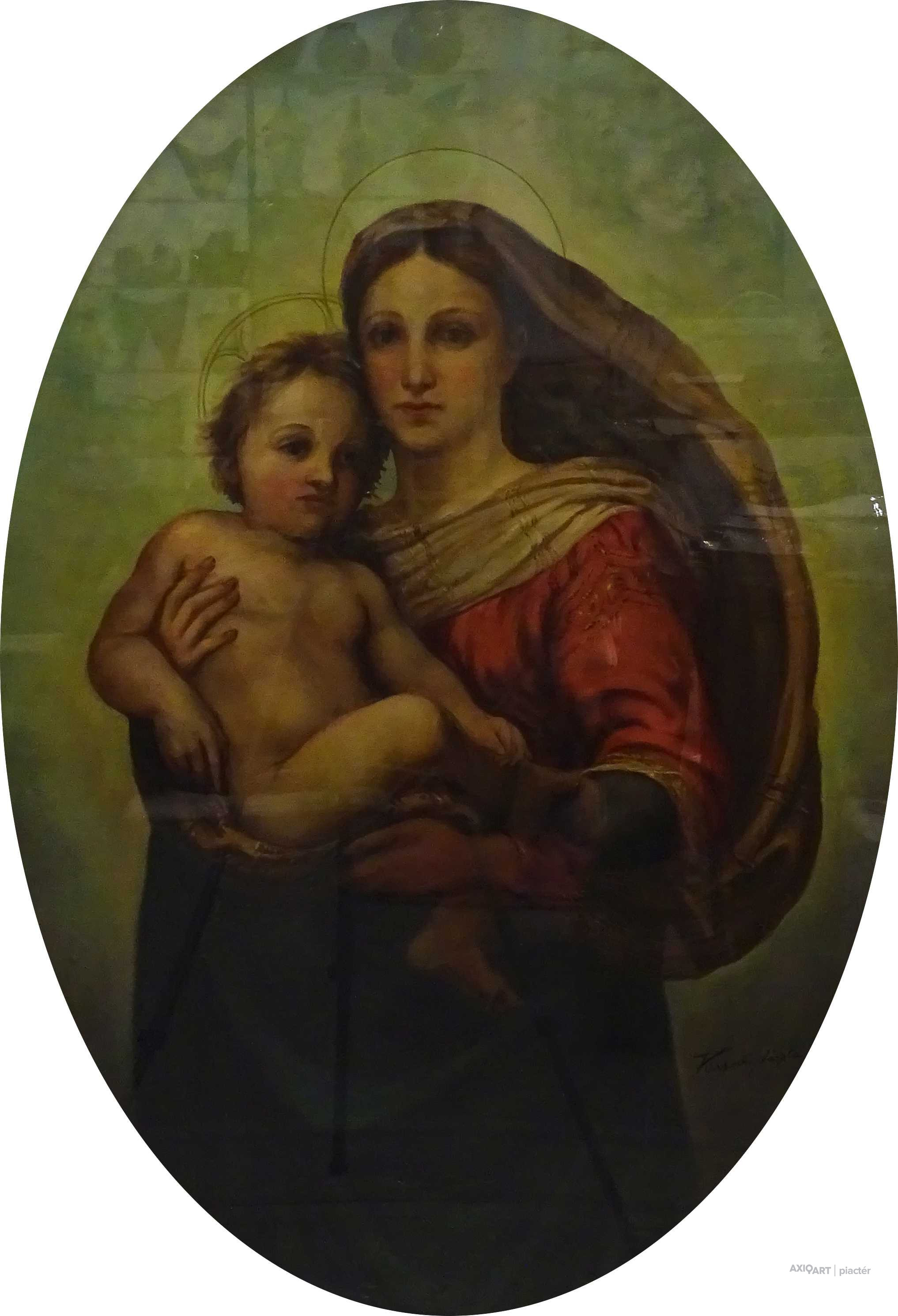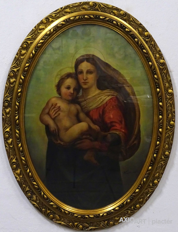Antik olaj farost festmény, hibátlan állapotú faragott, aranyozott ovális keretben, üveglap mögött. Raffaelo Santi Sixtusi Madonna című reneszánsz festményének kiemelkedően magas szintű festői másolata. Akasztási lehetőséggel rendelkezik. Azonnal falra akasztható állapotban van.
