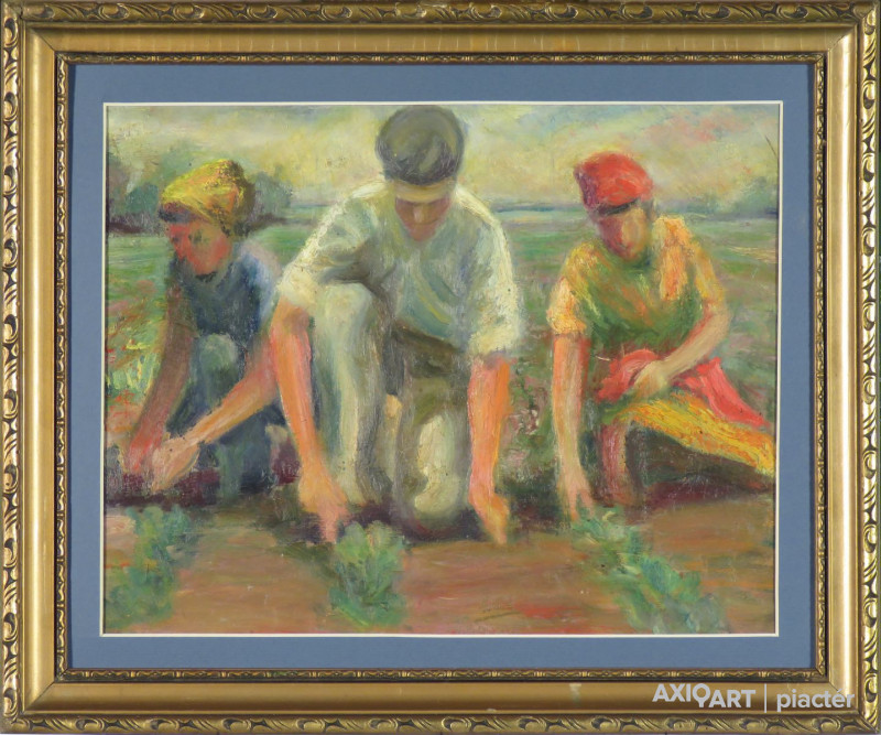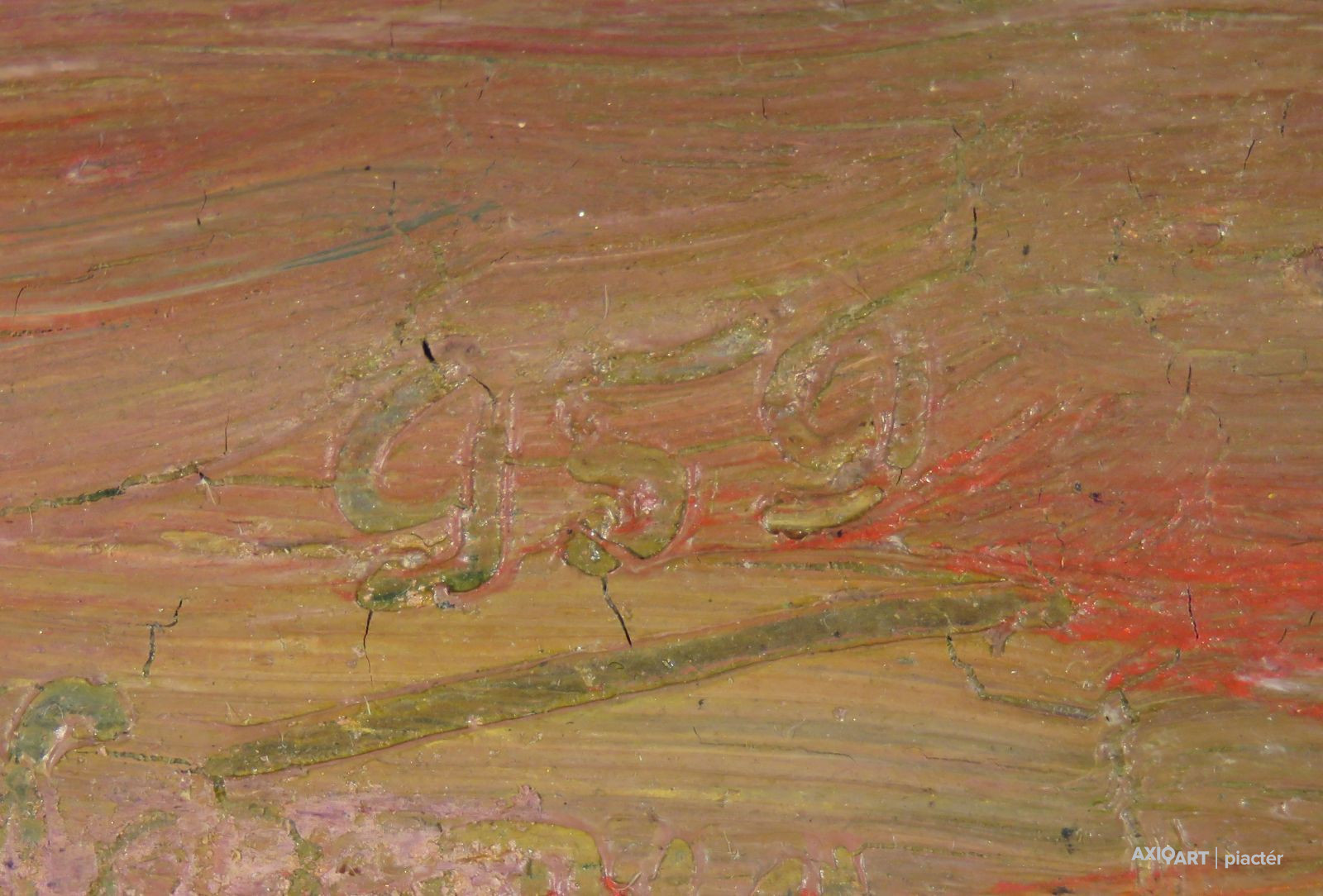 [FKC190/Bp108/16] A kép mérete: 25 x 31 cm keret nélkül. Készült: Olaj, Karton A kép Katona Kiss Ferenc (Szegvár, 1909) alkotása. Jelezve középen lent "959 Katona" A festmény jó állapotban van. Keret: Ép Magyar festők és grafikusok életrajzi lexikona I-II. Festő és grafikus. A budapesti Képzőművészeti Főiskolán Rudnay Gyula volt a mestere. Művészetére mégis Koszta József festőművész volt igen nagy hatással. 1940-1945 között ipartanuló iskolai rajztanár, 1951-1953 között a műszaki Tanárképző Főiskola adjunktusa, 1953-56 között a BME Ábrázológeometriai Tanszékének tanársegédje. 1956-ban visszavonult Szentesre, és csak a festészetnek élt. A város megbecsült művészeként a Szentes környéki táj és az alföldi ember ihletett ábrázolója. Képeit fejlett rajzkészség, színgazdagság jellemzi. Első önálló kiállítása 1958-ban Szentesen volt. A Délalföldi Tárlat rendszeres résztvevője. Sárospatakon grafikai munkáit mutatta be. Díjak: Szentes városáért kitüntetés, Szentes városa Pro Urbe-emlékérem, Koszta-emlékérem. Munkáit a szentesi Képzőművészeti Alapítvány őrzi. (Tasnádi András adatközlése nyomán, MFGA) Magyar festők és grafikusok adattára A Képzőművészeti Főiskolán 1939-ben szerezte meg a rajztanári és művészeti diplomáját, ahol Rudnay Gyula volt a mestere. 1940-1955 közötti években a budapesti Műszaki Egyetem ábrázoló tanszékének volt tanársegédje. 1966 óta csak festészettel foglalkozik, művészetére Koszta József volt igen nagy hatással. Első önálló tárlatát 1958-ban Szentesen rendezte meg. Azóta 1984 szeptemberéig 11 önálló tárlata volt. Sárospatakon grafikai munkáit mutatta be. A Délalföldi Tárlat rendszeres résztvevője. Munkája elismeréseként 1981-ben Szentes város Pro Urbe emlékérmet, 1984-ben pedig a Koszta-emlékérmet kapta. - ÖLK Magyar festők és grafikusok életrajzi lexikona I-II. Műgyűjtők és kereskedők kézikönyve Festő és grafikus. A bp.-i Képzőművészeti Főiskolán Rudnay Gyula volt a mestere. Művészetére mégis Koszta József festőművész volt igen nagy hatással. Első önálló kiállítása 1958-ban Szentesen volt. A Délalföldi Tárlat rendszeres résztvevője. Sárospatakon grafikai munkáit mutatta be. Szentes városa Pro Urbe-emlékérmet adományozott kiemelkedő munkásságáért, 1984-ben Koszta-emlékérmet kapott. (MFGA)