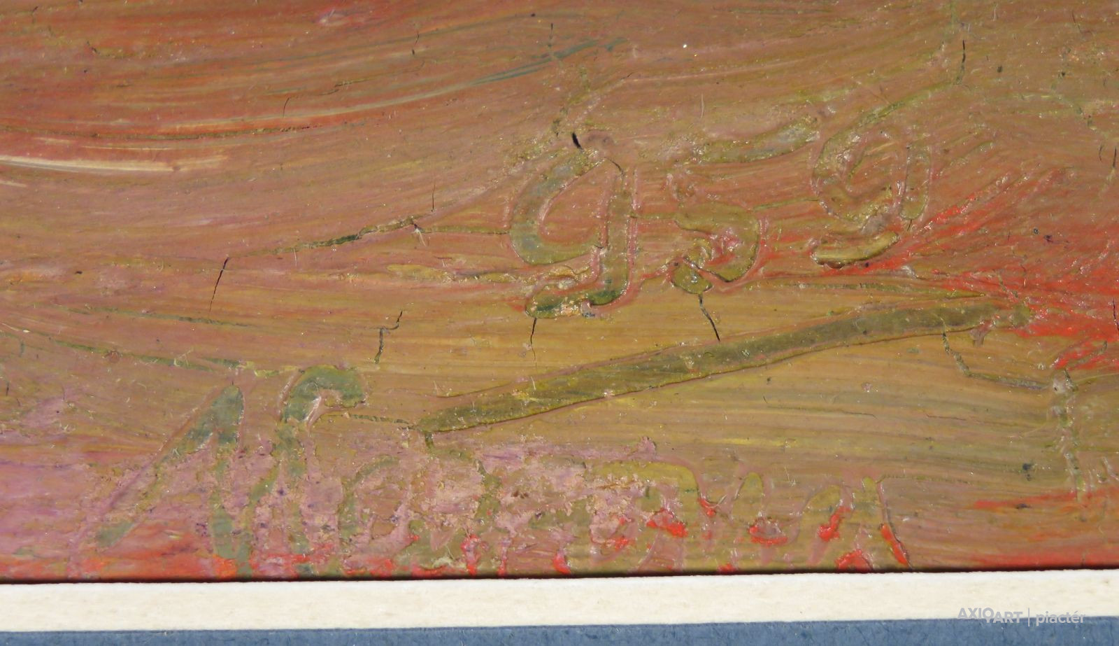 [FK2668/Bp301/4] A kép mérete: 50,5 x 80,5 cm keret nélkül. Készült: Olaj, Vászon A kép Moldován István (Kolozsvár, 1911) alkotása. Jelezve Jobbra lent "Moldován István" A festmény jó állapotban van. Keret: Ép A festmény hátoldalán a Képcsarnokvállalat raglapja láltható. Magyar festők és grafikusok életrajzi lexikona I-II. Festő. Tanulmányait Kolozsvárott, a Szépművészeti Főiskolán kezdte 1930-ban. A következő esztendőben a nagybányai Szépművészeti Iskolában Thorma János és Krizsán János korrektúráján képezte magát. 1931-ben a budapesti Képzőművészeti Főiskola hallgatója lett. Réti István, később Szőnyi István volt a mestere. Már mint főiskolás sok díjat és kitüntetést nyert. 1948-ban megkapta a római ösztöndíjat, de lemondva róla, Erdélybe ment. 1948-1950 között Erdélyben élt, és népművészetben gazdag vidékein festett. 1943-ban Kolozsvárott, 1946-ban Gyöngyösön, 1955-ben, 1959-ben és 1962-ben a Kulturális Kapcsolatok Intézetében, illetve a Csók Galériában rendezett egyéni bemutatókat. Ezen kívül több Európai országban, az USA-ban, Kanadában és Indiában is bemutatta munkáit. Eleinte sajátos atmoszférájú, lírai tájképeket, eleven színvilágú képmásokat festett, később mondernebb, erőteljesebben szerkesztett művekkel jelentkezett. A Pécsi Tanárképző Főiskola számára mozaikot készített. Erdély szerelmese volt. A székely népművészet gazdag formavilágának hatása döntő jelentőségűvé vált sokoldalú művészetében. Műv. díjak: a Szinyei Társaság elismerő oklevele, a Főváros festészeti-díja, "Kolozsvár a képzőművészetben" II. díj, állami ösztöndíj, római ösztöndíj, a Képzőművészek Szövetsége Észak-Magyarországi festészeti díja, SZOT festészeti díj. Több murális művet (mozaik) alkotott. A Magyar Nemzeti Galéria több alkotását őrzi. (M. L.: Műv. 1967/6, RI-NM) Magyar festők és grafikusok életrajzi lexikona I-II. Műgyűjtők és kereskedők kézikönyve Festő. Tanulmányait a kolozsvári Szépművészeti Főiskolán kezdte 1930-ban. A nagybányai szabadiskolában is megfordult. Itt Thorma János és Krizsán János korrektúráján képezte magát. 1931-ben Budapesten a Képzőművészeti Főiskola hallgatója lett. Réti István, később Szőnyi István volt a mestere. Már mint főiskolás sok díjat nyert. 1948-ban megkapta a római ösztöndíjat, de lemondva róla, Erdélybe ment. 1948-1950 k. Erdélyben élt, és népművészetben gazdag vidékein festett. 1943-ban Kolozsváron, 1946-ban Gyöngyösön, 1955-ben, 1959-ben és 1962-ben a Kulturális Kapcsolatok Intézetében, illetve a Csók Galériában rendezett önálló kiállítást. Ezen kívül több Európai országban, az USA-ban, Kanadában és Indiában is bemutatta műveit. Eleinte sajátos atmoszférájú, lírai tájképeket, eleven színvilágú képmásokat festett, később mondernebb, erőteljesebben szerkesztett művekkel jelentkezett. A Pécsi Tanárképző Főiskola számára mozaikot készített. Erdély szerelmese volt. A székely népművészet gazdag formavilágának hatása döntő jelentőségűvé vált sokoldalú művészetében. 1942-ben megkapta a Szinyei Társaság elismerését, és a Főváros festészeti-díjat,1943-ban elnyerte a "Kolozsvár a képzőművészetben" c. díjat. 1947-ben állami ösztöndíjat,1948-ban a római ösztöndíjat, 1972-ben a Képzőművészek Szövetsége Észak-Magyarországi festészeti díját kapta meg. A MNG több művét őrzi. (M. L.: Műv.-1976/6) Magyar festők és grafikusok adattára Tanulmányait Kolozsvárott a Képzőművészeti Főiskolán, majd Nagybányán Thorma János és Krizsán János irányítása mellett kezdte, 1931-től Budapesten megszakításokkal a Képzőművészeti Főiskolán Réti István és Szőnyi István növendékeként fejezte be. 1949-ben és 1950-ben ösztöndíjjal dolgozott Erdélyben, majd hosszú tanulmányutakra indult Nyugat-Európába, az Egyesült Államokba, s a Szovjetunióba. Először Kolozsvárott lépett a nyilvánosság elé 1943-ban, majd 1946-ban Egerben és Gyöngyösön, 1947-ben Miskolcon, 1948-ban Hatvanban, 1955, 1961 és 1981-ben a Csók Galériában, 1959-ben a KKI-ben, 1960-ban Nagykanizsán, 1963-ban Kiskunfélegyházán, 1966-ban Debrecenben, 1969 és 1975-ben Békéscsabán, 1971-ben a Mednyánszky Teremben, 1973-ban Gyöngyösön és Debrecenben, 1977-ben Egerben, 1979-ben Veszprémben, 1983-ban Miskolcon, 1984-ben Csepelen, 1986-ban a Vigadó Galériában rendezett önálló kiállítást. Külföldi kiállításai: Moszkva, Varsó, India, Szófia, Párizs, Bukarest, Belgrád, New York, Montreál és Toronto. Eddig közel kétezer színes táblaképet festett, de szívesen foglalkozik mozaikkészítéssel is. 1964-ben a Pécsi Pedagógiai Főiskola, 1968-ban a Salgótarjáni Kórház, 1969-ben a názáreti templom és 1970-ben a Videoton Vállalat díszterme részére mozaikot készített. - Erdély szerelmese. A székely népművészet gazdag formavilágának hatása döntő jelentőségűvé vált festészetében. Olyan formanyelvet alakított ki magának, amely színvilágában és summázó formaalakításában sajátos erdélyi zamat érződik, ugyanakkor korszerűen modern is konstruktivista stílusa. Munkásságát 1942-ben a Szinyei Társaság elismerésével és a Fővárosi festészeti-díjjal, 1943-ben Római-ösztöndíjjal, 1947-ben Állam ösztöndíjjal (Románai), 1963-ben a SZOT festészeti-díjával, 1972-ben a Képzőművészek Szövetsége Észak-Magyarországi festészeti-díjával tüntették ki. - Irod.: Bíró Béla: Kolozsváry Moldován István. Erdélyi Helikon, 1943.; Felvinczi Takács Zoltán: Kolozsváry Moldován István. Kolozsvár, 1943.; Dutka Mária: Magyar Nemzet, 1961.; Maksay László: Moldován István. Művészet, 1965.; D. Fehér Zsuzsa. Moldován István, Bp. 1971.; Theisler G