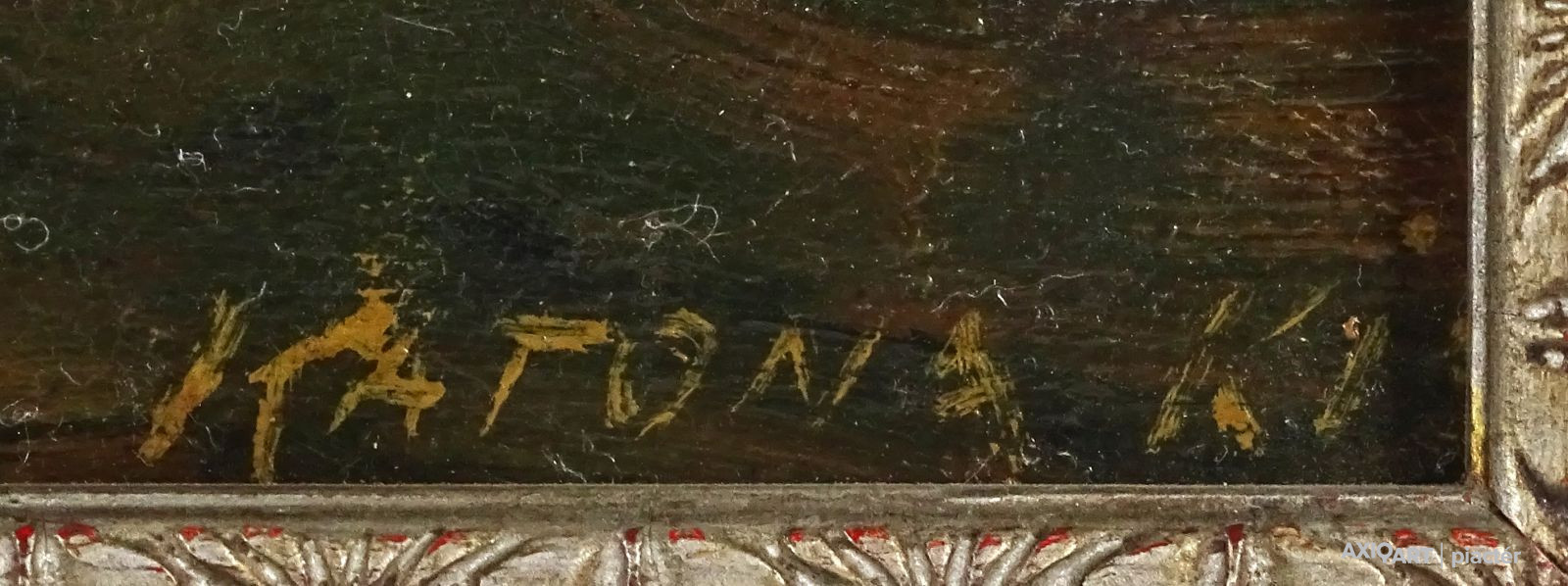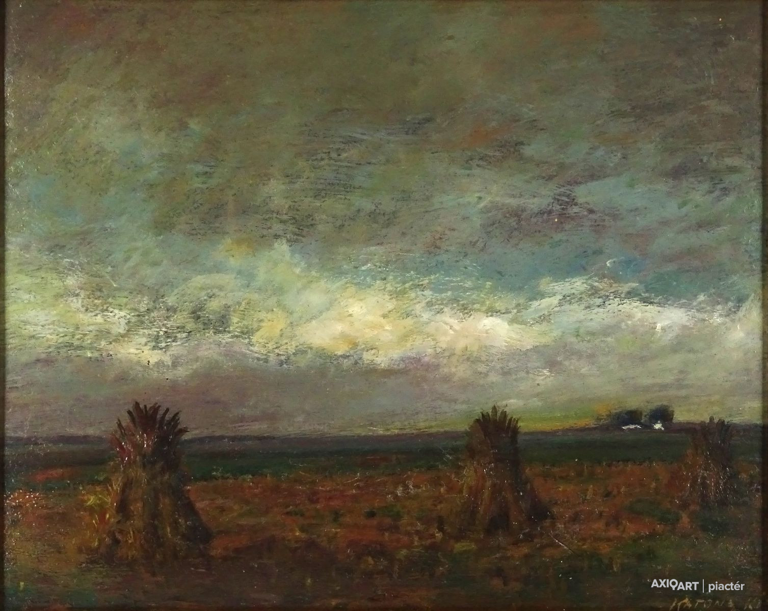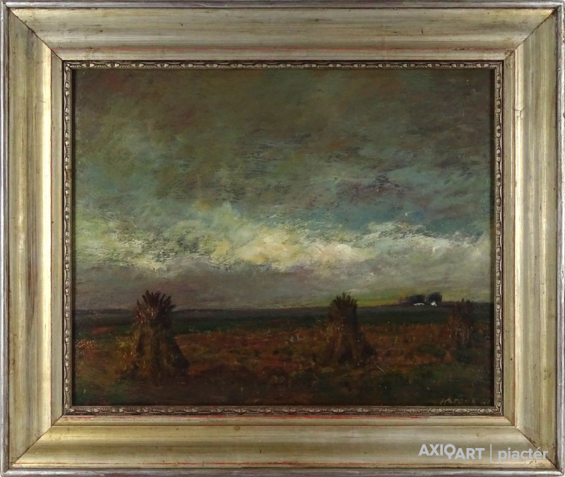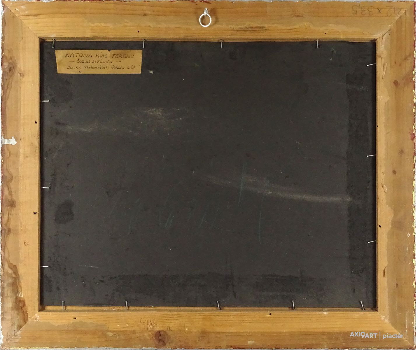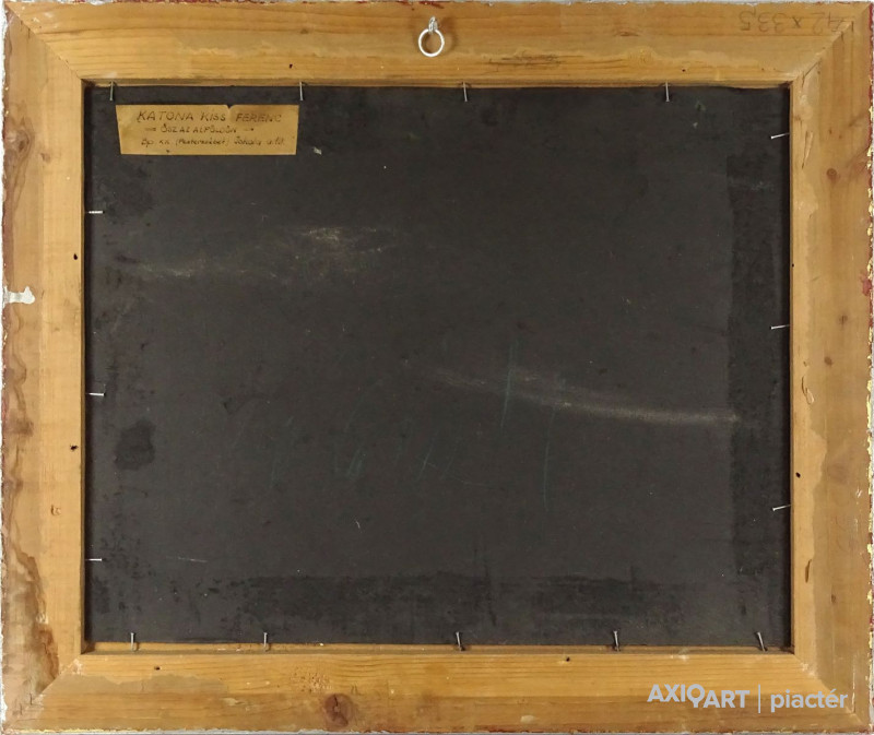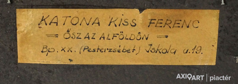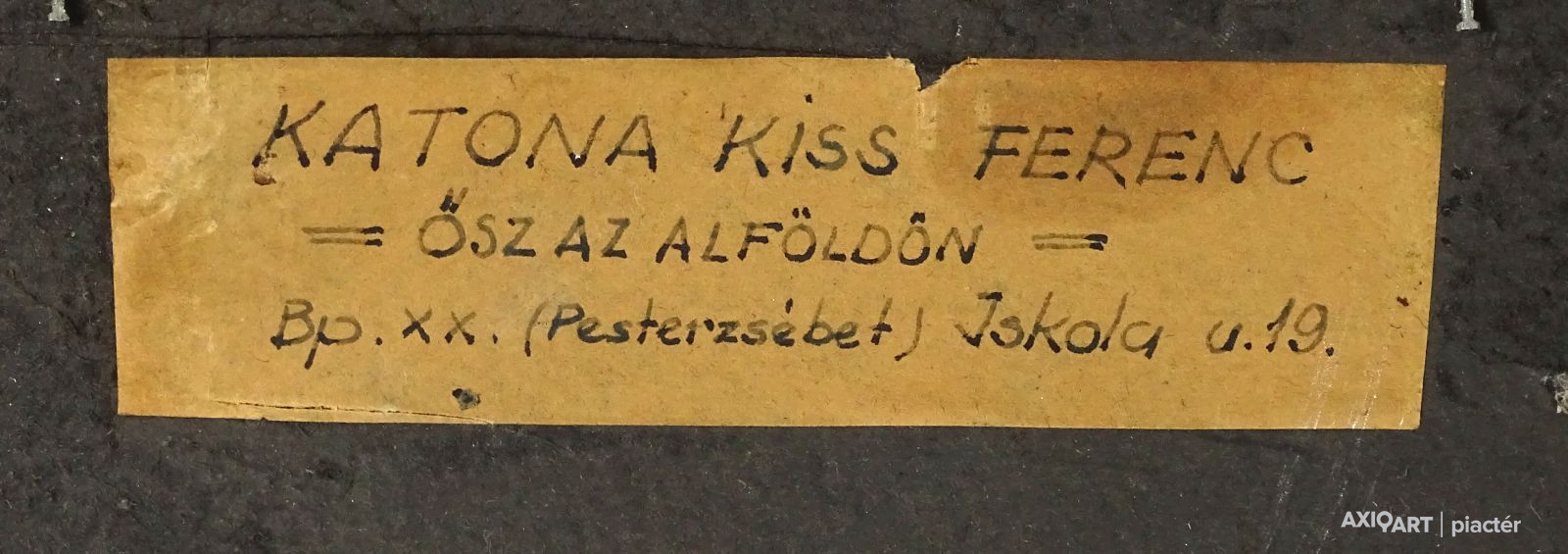 [1R605/137] Olaj karton festmény, ezüst színű keretben. akasztási lehetőséggel rendelkezik. Jelezve jobbra lent: KATONA KISS Hátoldalán címke, rajta felirat: KATONA KISS FERENC ŐSZ AZ ALFÖLDÖN Magasság: 44 cm Szélesség: 52 cm Súly: 1.465 kg Katona Kiss Ferenc festő, művésztanár Szegvár, 1909-10-17 Elhalálozott: Szentes, 1995. június 8. 1934-39: Magyar Képzőművészeti Főiskola, mestere Rudnay Gyula volt. 1979: Szentes városáért kitüntetés; 1981: Szentes város Pro Urbe emlékérme; 1984: Koszta József emlékérem. 1940-45 között iparitanuló iskolai rajztanár, 1951-53-ig a műszaki Tanárképző Főiskola adjunktusa, 1953-tól 56-ig a Budapesti Műszaki Egyetem Ábrázológeometriai Tanszékének tanársegédje. 1956-ban betegsége miatt visszavonult Szentesre és csak a festészetnek él. A város megbecsült művészeként a Szentes környéki táj és az alföldi ember ihletett ábrázolója volt, képeit fejlett rajzkészség, színgazdagság jellemzi. Koszta József volt nagy hatással. Első önálló tárlatát Tárlat rendszeres szereplője volt. Művészetének gyakori témája családja, szülei, felesége, rokonsága, szűkebb ismeretségi Villamosítás,  Panelezők, melyeken az alföldi realista irányzat hatása érezhető. A természetábrázolás, tájképek, virágok, vizek is Feleségével, Túri Júliával – házasságuk gyermektelen lévén – úgy határoztak, hogy megtakarított javaikat egy alföldi Katona Kiss Ferenc és neje Túri Júlia Képzőművészeti Alapítvány fiatal, realista Katona Kiss Ferenc munkássága Halála után alkotásai Szentes Szülőhelyét még életében megajándékozta alkotásaival, melyek a Falumúzeumban láthatók. Irodalom KOROM A.: Szülinapi beszélgetés ~cel, Szentesi Élet, 1993. október 16. Egyéni kiállítások Egyéni kiállítások 1958-tól 15 önálló tárlat Szentesen. Válogatott csoportos kiállítások Válogatott csoportos kiállítások  Szeged. Művek közgyűjteményekben Művek közgyűjteményekben ~ Képzőművészeti Alapítvány, Szentes.  Forrás: artportal.hu