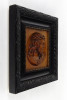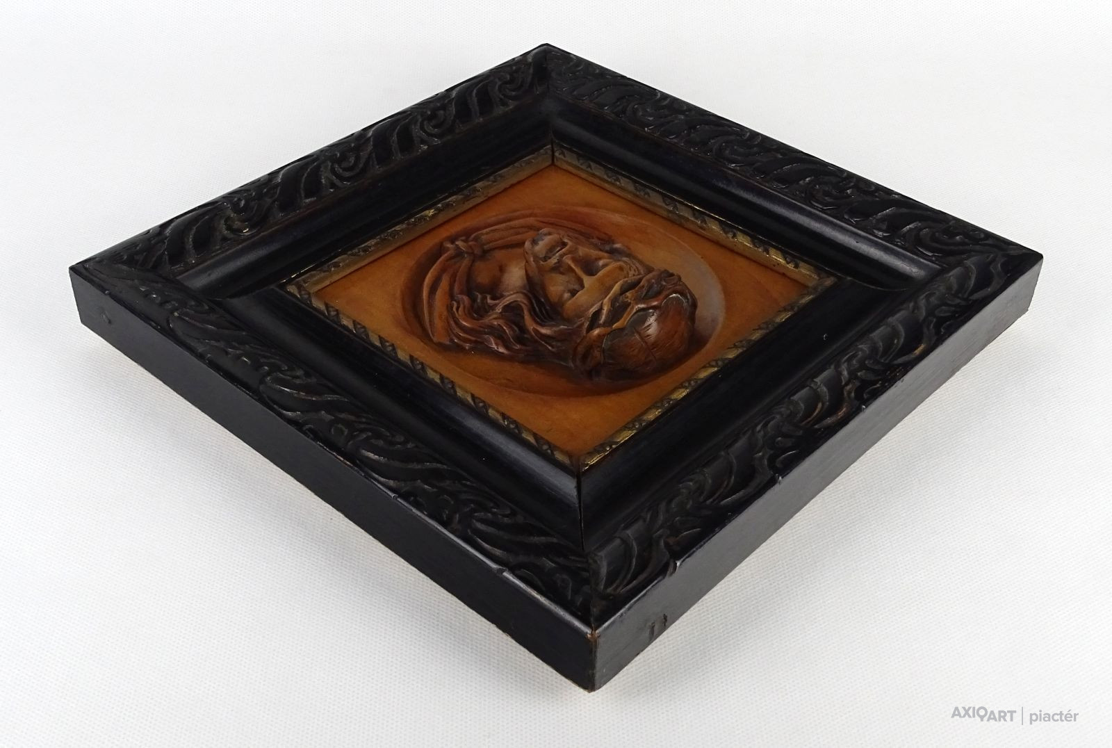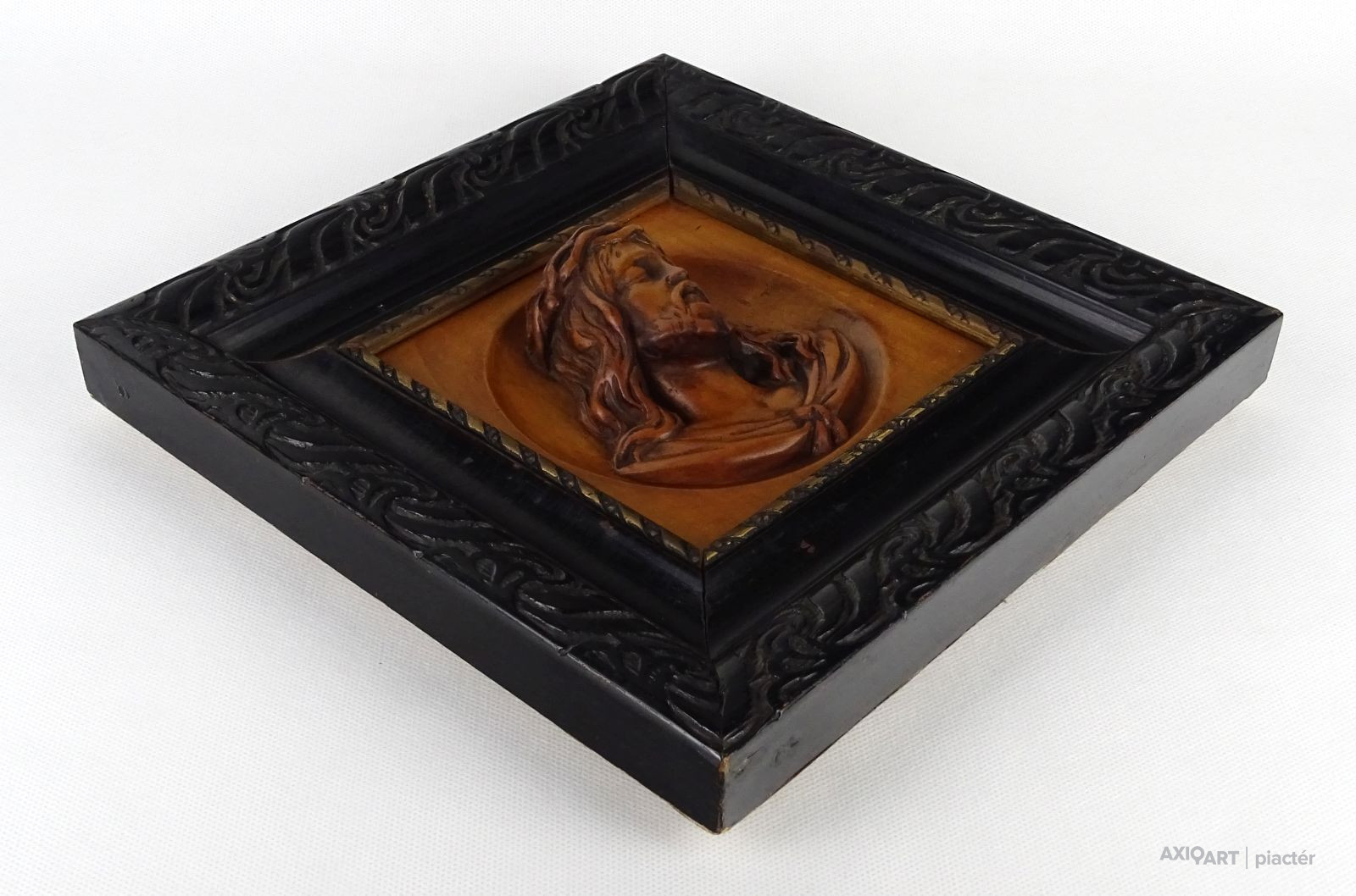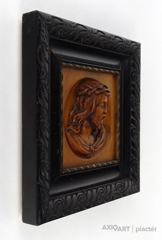 [1M399/101] Régi, szép állapotú Jézus fafaragás, falidísz fekete faragott keretben. Falra akasztási lehetőséggel rendelkezik. Magasság: 25.5 cm Szélesség: 25.5 cm Súly: 0.635 kg