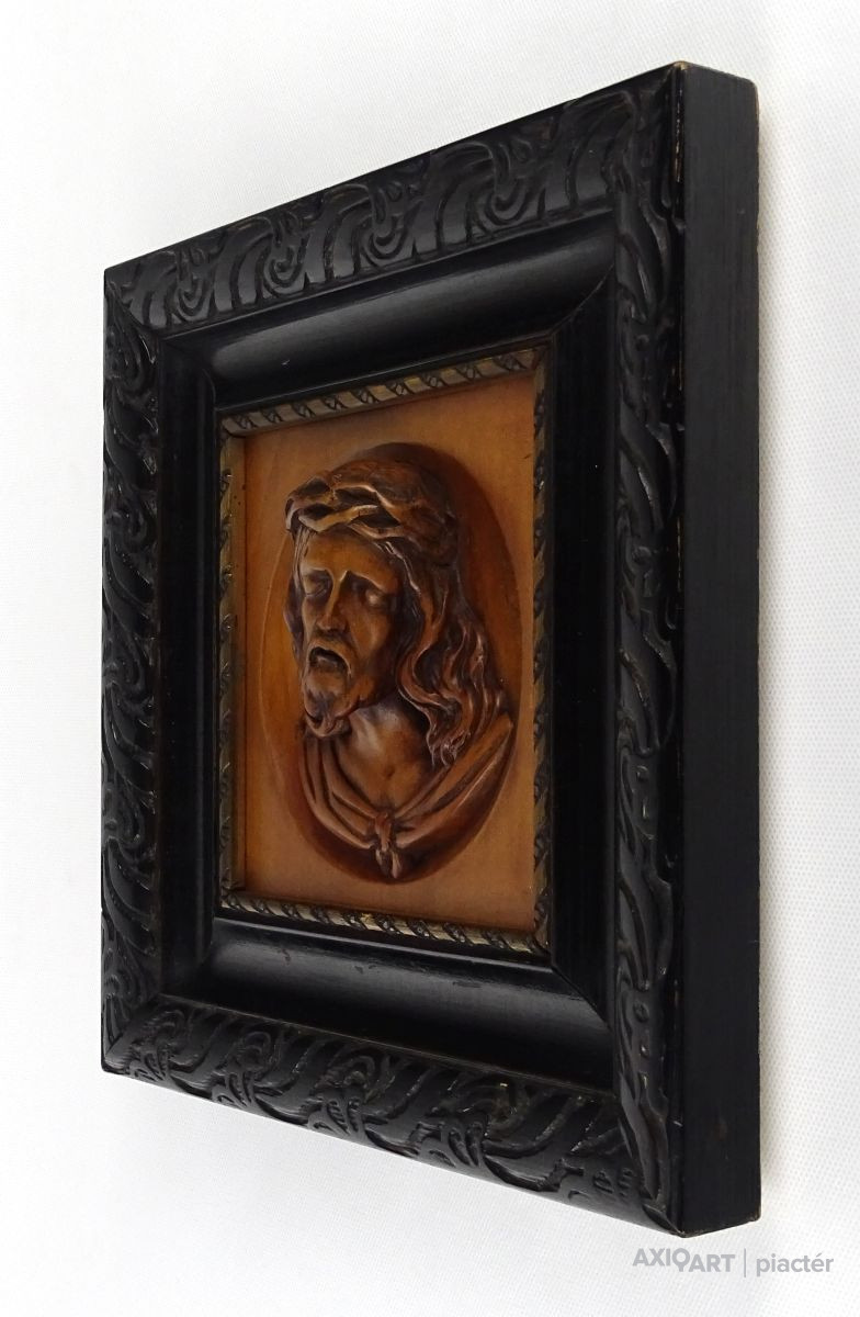 Régi, szép állapotú Jézus fafaragás, falidísz fekete faragott keretben. Falra akasztási lehetőséggel rendelkezik.