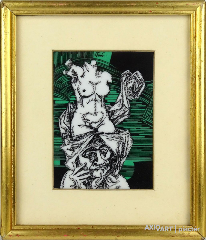 [1Y034/Z018] Olaj vászon festmény, üveglap mögött, szép állapotú képcsarnokos keretben. Akasztási lehetőséggel rendelkezik. Jelezve jobbra lent: Balog A. Hátoldalán a kereten Képcsarnok Vállalat címke töredék látható, rajta felirat: A művészeti alkotás címe: LEÁNY Magasság: 86 cm Szélesség: 66 cm Súly: 5.37 kg Balogh András (képei szignóján az 1960-as évektől Balog) (Budapest, 1919. március 14. — Budapest, 1992. március 18.) festőművész, kerttervező, művészeti szakíró, c. egyetemi tanár. Életpályája és munkássága Apai ágon a géresi Baloghok Szatmár megyéből a dél-erdélyi Alsó-Fehér megyébe származtak, anyai fölmenői a Székelyföldön: Csíkban, ill. Háromszéken éltek. Szülei az 1900-as évek elején költöztek Budapestre. A Képzőművészeti Főiskolán 1937-ben kezdte meg tanulmányait Burghardt Rezső tanítványaként. 1950-töl 1980-ig a Kertészeti Főiskolán (később Kertészeti Egyetem) tanított a kerttervezési tanszéken művészettörténetet, szabadkézi rajzot, ábrázoló geometriát és kertesztétikát. Az Iparművészeti Főiskolán óraadóként kertesztétikát adott elő. 1971-ben részt vett a firenzei Palazzo Strozziban rendezett biennálén, ahol aranyéremmel tüntették ki. Rendszeres önálló és csoportos kiállítások sora következett ezután nemcsak Magyarországon, hanem Olaszország és Németország számtalan városában, kiállított Finnországban, Kanadában is. Egyéni kiállításai gyakran katalógusokkal jelentek meg.[1][2][3] Nyaranként Tihanyban vagy Zsennyén alkotott. Festészetét poétikus realizmus jellemzi, dekoratív elrendezésű kompozíciói és lágy színvilága bensőséges hangulatot, szépséget, harmóniát árasztanak. (Lány egyszarvúval; Alvó, Emberpár és táj, stb.) Nagyon sok tájképet és portrét festett, történelmi személyiségekről is, 1978 és 1989 közt megfestette Mindszenty József bíboros portréját. Képei a Magyar Nemzeti Galériában, vidéki múzeumainkban, olasz, német, finn, észak-amerikai, kanadai, ausztráliai gyűjteményekben vannak.