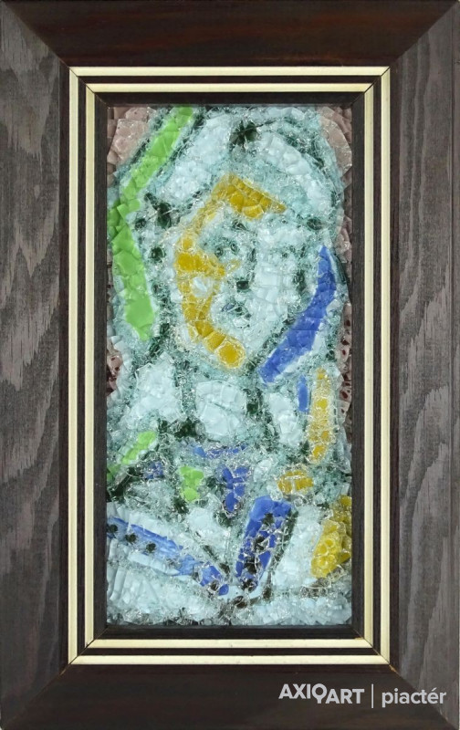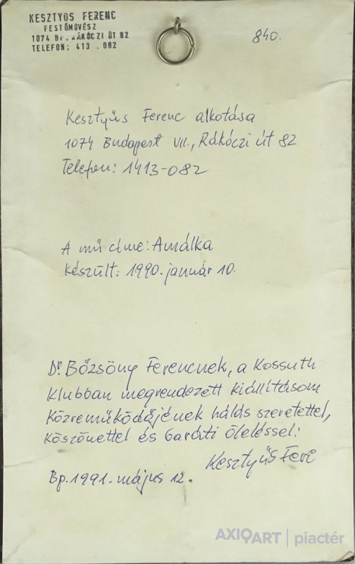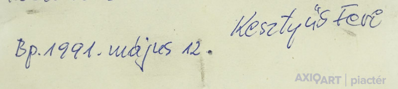 [1A226/101] Keretezett tűzzománc alkotás. Hátoldalán feliratok: KESZTYŰS FERENC ALKOTÁSA A MŰ CÍME: AMÁLKA KÉSZÜLT: 1990 JANUÁR 10 DR. BŐZSÖNY FERENCNEK, A KOSSUTH KLUBBAN MEGRENDEZETT KIÁLLÍTÁSOM KÖZREMŰKÖDŐJÉNEK HÁLÁS SZERETETTEL, KÖSZÖNETTEL ÉS BARÁTI ÖLELÉSSEL: KESZTYŰS FERI 1991 MÁJUS 12 Magasság: 27 cm Szélesség: 17 cm Súly: 0.715 kg Kesztyűs Ferenc festő, grafikus, karikaturista Sarkad, 1932-10-17 hirdetés Szerző: Gyulai Gergely Képzőművészeti tanulmányait a Dózsa György úti MÉMOSZ művészkörében kezdte. Ezt követően a Dési István szabadiskolában folytatott tanulmányokat. 1951-1953: Magyar Képzőművészeti Főiskola (rajztanári szak), mesterei: Papp Gyula, Szőnyi István, Barcsay Jenő, Domanovszky Endre, Pór Bertalan. 1953: pécsi Tanárképző Főiskola. 1958: diplomát szerzett a Szegedi Jogtudományi Egyetemen. 1983-ban Honvédelmi Érdemérem; 1985, 1987, 1993: Ancona-i Nemzetközi Grafikai és Humor Biennálé ezüstérme. 1985: Nemzetközi bronzérem, Grafikai Biennálé, Havanna. A Művészetbarátok Egyesületének alapító- és elnökségi tagja, valamint az egyesület irodalmi és képzőművészeti titkára volt a 80-as évek végéig. Ezt követően a Móricz Zsigmond Írók és Képzőművészek Országos Körének lett főtitkára, majd elnöke. A Független Magyar Szalon alapítója, főtitkára, és 1999 elejéig elnöke volt. Jelenleg tagja a BAGATELL ART csoportnak. Már 1950-től az Épületfestő Vállalat festőművész részlegének tagjaként a Parlamentben dolgozott freskófestőként és aranyozóként. Működött az Országházban, az Operaházban, az Operettszínházban, a Moulin Rouge-ban, valamint az Örökimádó és a 100 éves templomban mint díszítőfestő, aranyozó és freskófestő. A 60-as évek első felétől bemutató rajztanárként dolgozott az Irányi utcai általános iskolában. Ugyanettől az időszaktól kezdve grafikusként is működik. Karikatúráit, rajzait rendszeresen közölte a Ludas Matyi, a Népszabadság és több más magyar és számtalan külföldi lap és folyóirat. A 70-es évek óta folytatott kísérleteinek eredménye a tűzzománc-kerámia festmény megalkotása. A kerámia alapon használt különleges zománcfestékei rendkívüli színvilágot és újszerű, plasztikus felületi hatásokat eredményeztek (“sejtesítés”). Változatos tematikájú tűzzománc-kerámiái közt figurális jeleneteket, portrékat és csendéleteket egyaránt találunk. Kisebb méretű táblaképeken kívül, a tűzzománc-kerámia monumentális kül- és beltéri murális kompoziciók elkészítését is lehetővé teszi. Festészetére az impresszionizmus és az expresszionizmus gyakorolta a legfontosabb hatást. Egyéni kiállítások Egyéni kiállítások 1984 • Móricz Zsigmond Művelődési Ház [Koszta Rozáliával és Tóth Ernővel] • Művelődési Ház, Békéscsaba 1987 • Báthori Múzeum, Nyírbátor 1989 • Cente d’ Art Floreal, Ikebana Galerie, Párizs • Metro Klub, Budapest • Bartók Béla Művelődési Központ, Sarkad 1991 • Pataky Galéria, Budapest 1995 • Parlament Galéria, Budapest • Stefánia Galéria, Budapest 1998 • Dionüszion Galéria • Közösségi Ház, Balatonfüred 1999 • Technika Háza, Székesfehérvár. Válogatott csoportos kiállítások Válogatott csoportos kiállítások Grafikai és Humor Biennálé, Ancona • Nyíregyházi Országos Karikatúra kiállítások • A Független Magyar Szalon Országos és Nemzetközi Kiállításai 1999 • Árvízkárosultakért, Műcsarnok, Budapest 1999 • UNESCO-kiállítás, MTESZ Székház, Budapest. Művek közgyűjteményekben Művek közgyűjteményekben Sarkadi Múzeum Forrás: artportal.hu