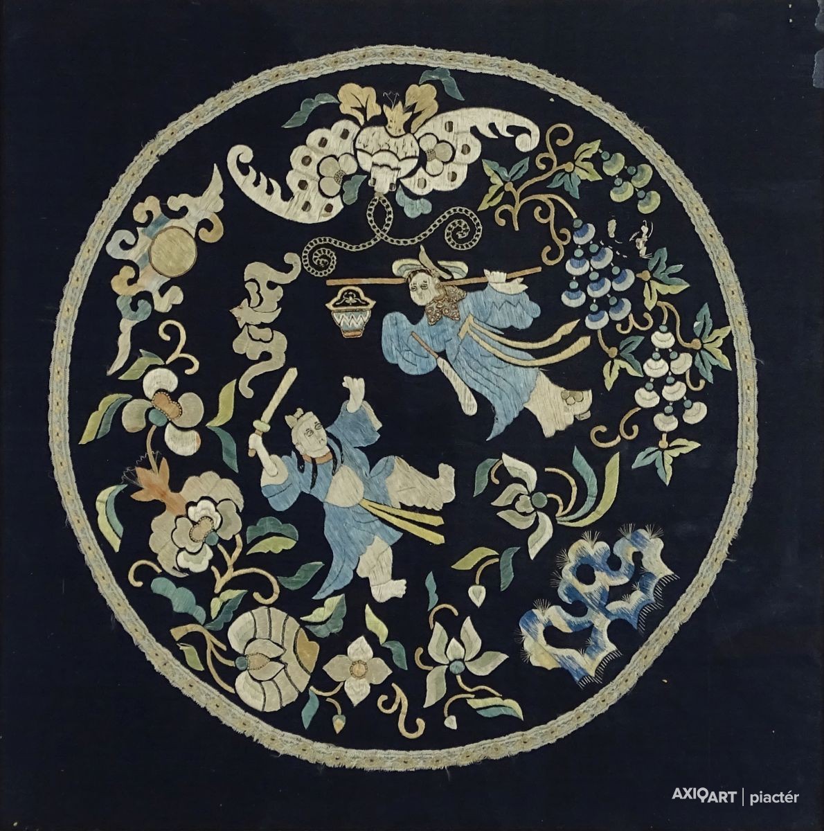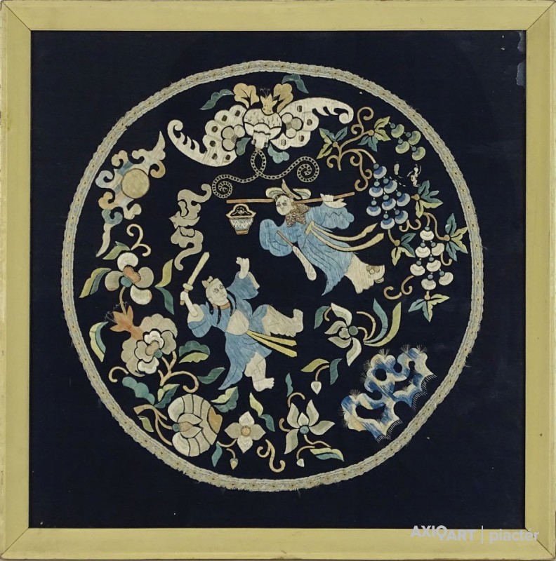 [0U450/087] Vajszínű keretben, üveglap mögött, színes, részletgazdag hímzés. Királykék selyem háttéren kör alakú kézimunka, két alakos keleti díszítés. Férfi karddal, nő lámpással. Magasság: 36 cm Szélesség: 36 cm Súly: 0.95 kg