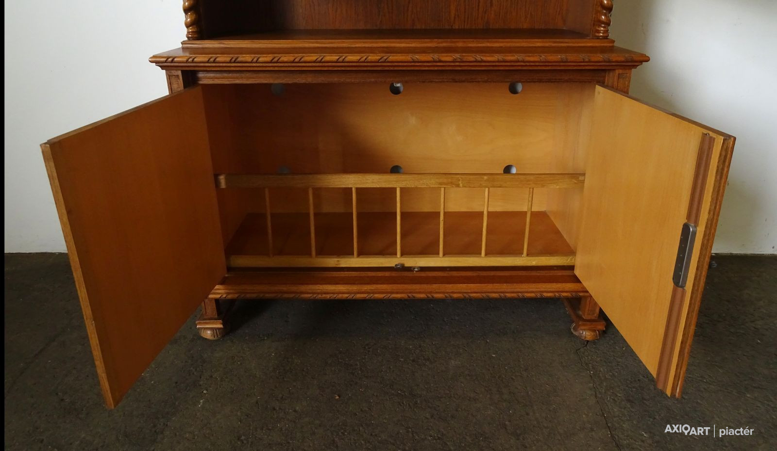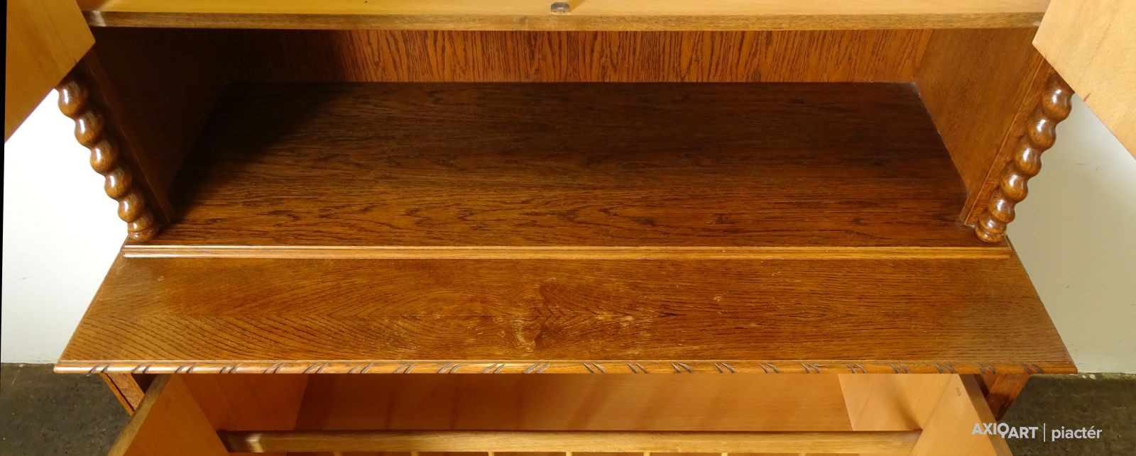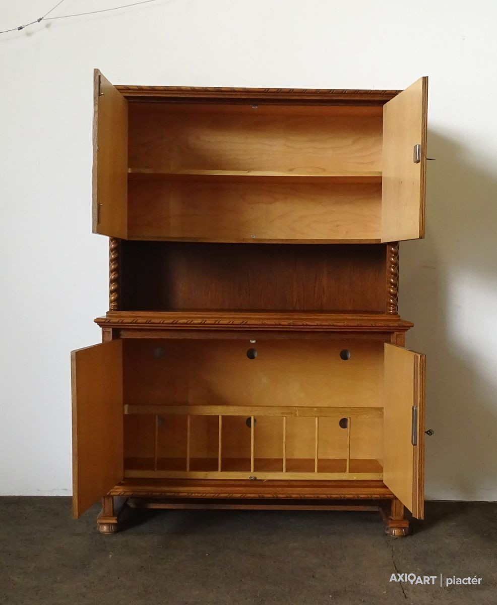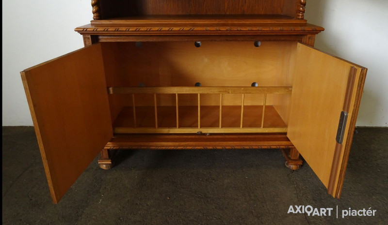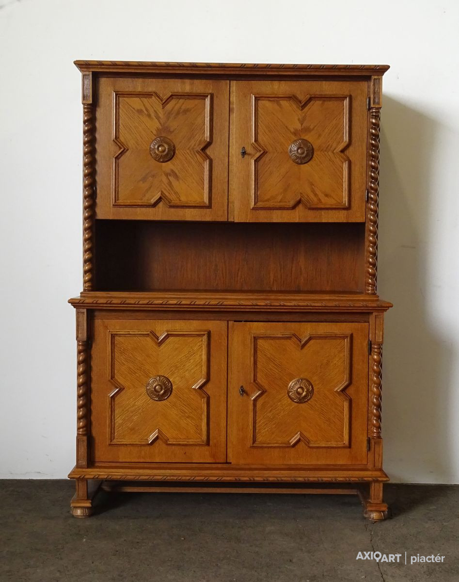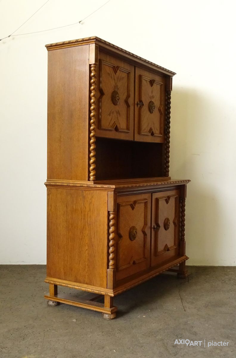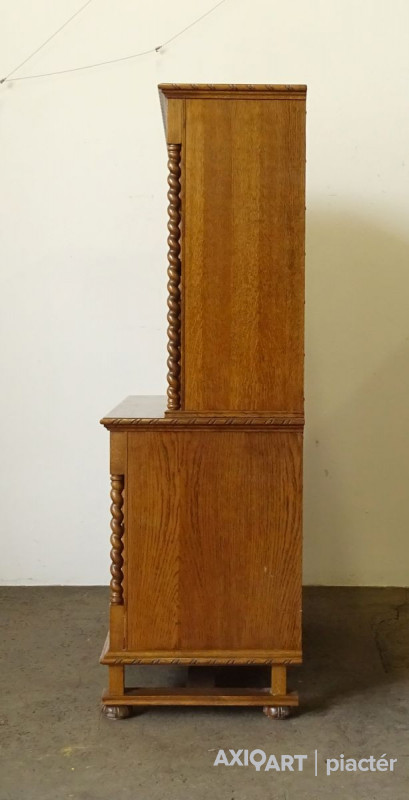 Minőségi, erős masszív koloniál bútor. Felső része polcos, alsó részében ágyneműtartó található. Szép állapotú szekrény, csavart oszlopos díszítésekkel. Két darabban szállítható. Ajtajai működő zárakkal rendelkezik, két darab kulcs tartozik hozzá.