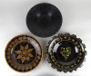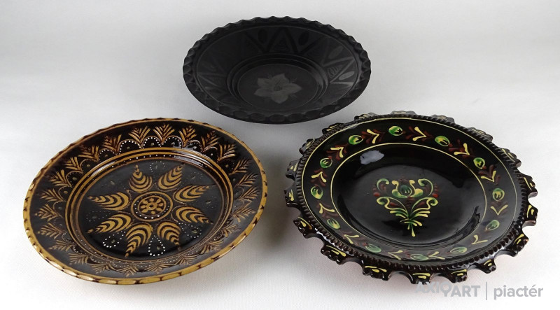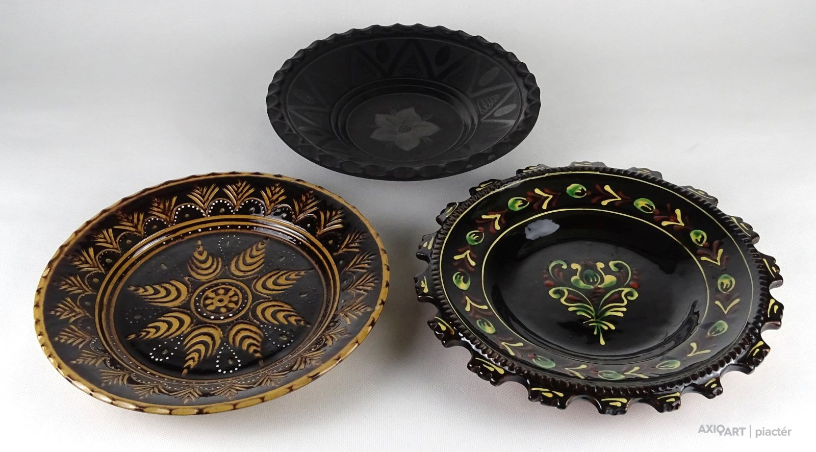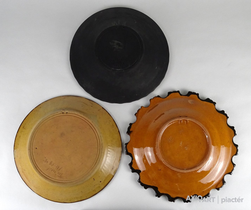 [1M880/X184] Szép állapotú, három darab mázas kerámia, fali dísztányér falra akasztási lehetőséggel. - 1 darab Teimel István óbányai 1975 fali tál (25.5 cm) - 1 darab fekete cserép karcagi agyagipar fali tányér (24.5 cm) - 1 darab jelzett AISZ. cakkos szélű ónmázas kerámia fali tál (26.5 cm) Súly: 2.085 kg