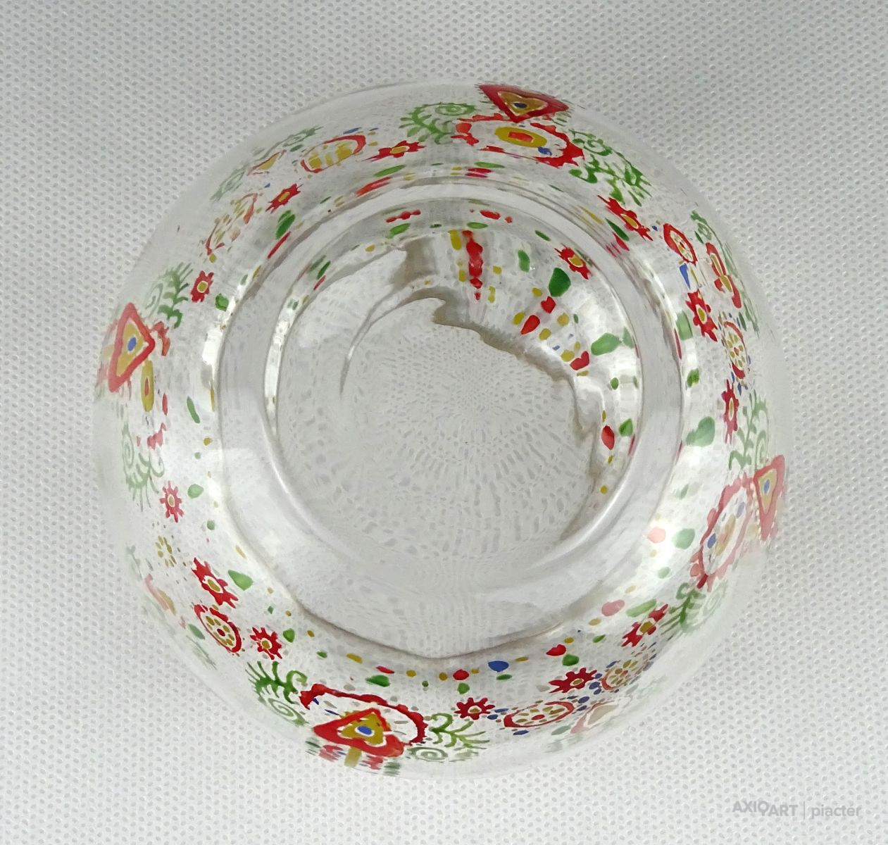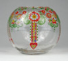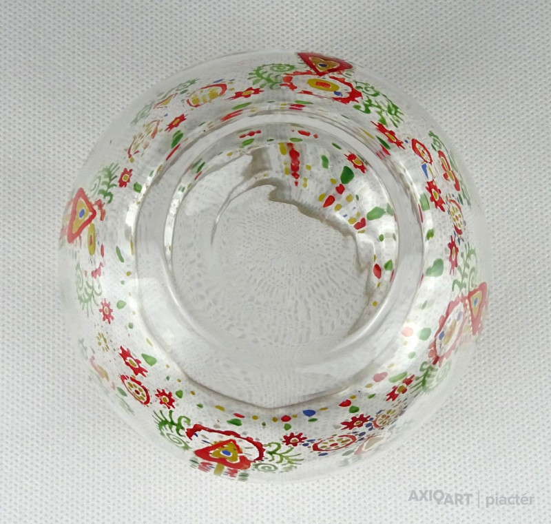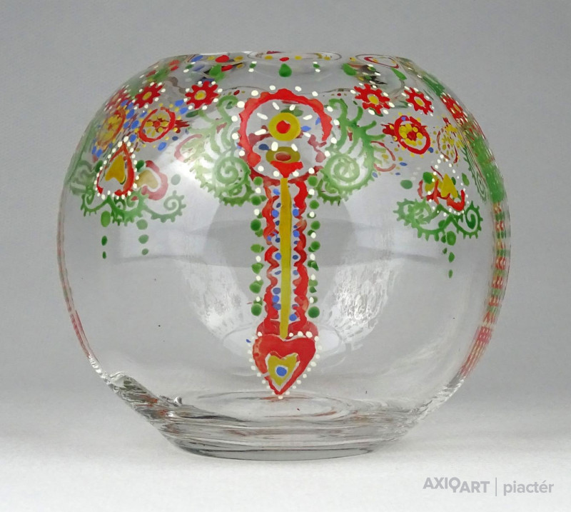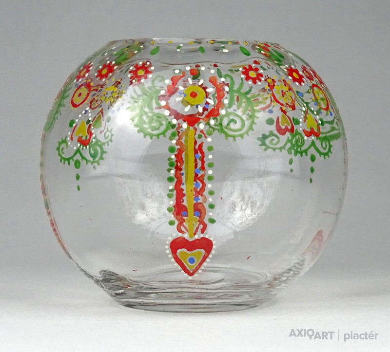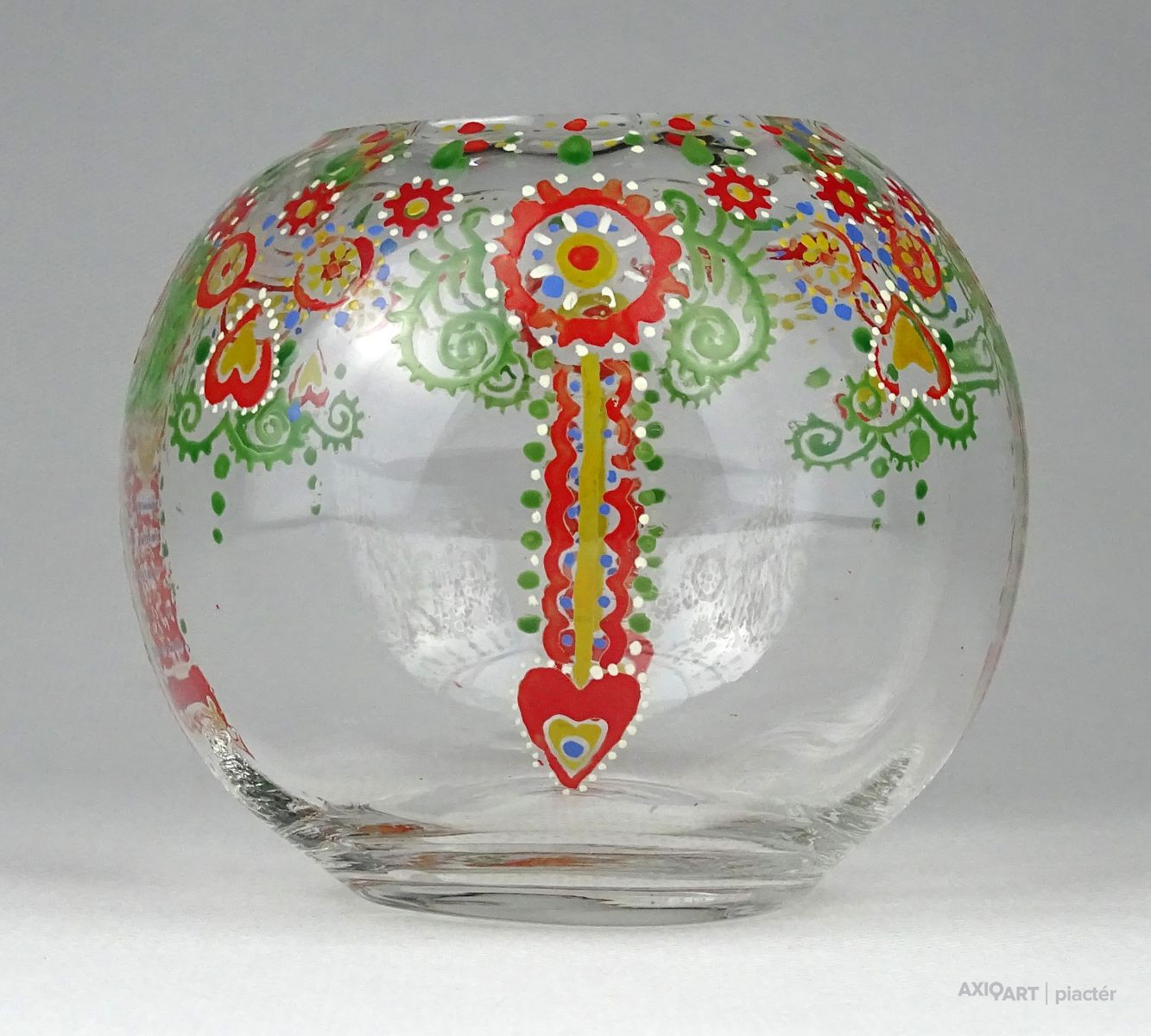 [1I979/X117] Régi szép állapotú, gazdag kézi festésű népi motívummal díszített fújt üveg váza, díszváza, gömbváza. A váza peremén belülről apró lepattanás található, lásd fotó. Magasság: 9 cm Szélesség: 9.5 cm Súly: 0.13 kg
