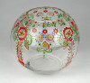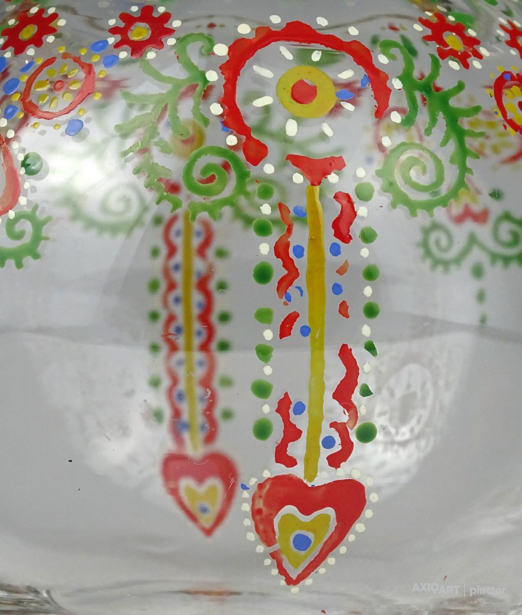 Régi szép állapotú, gazdag kézi festésű népi motívummal díszített fújt üveg váza, díszváza, gömbváza. A váza peremén belülről apró lepattanás található, lásd fotó.