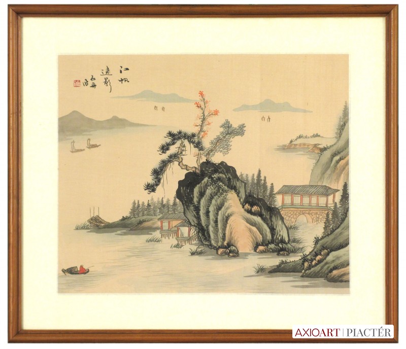 [FK3538/Bp401/21] A kép mérete: 30 x 36 cm keret nélkül. Készült: Akvarell, tus, Selyem A kép Kínai művész 20. század alkotása. Jelezve balra fent "kínai írásjelekkel és pecséttel" A festmény jó állapotban van. Keret: Ép