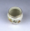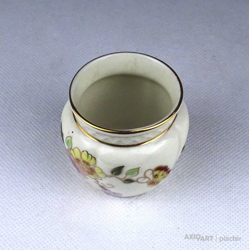 [1Z701/Z008] Hibátlan állapotú, gazdagon aranyozott, virág mintával díszített, kisméretű, vajszínű Zsolnay porcelán kis váza, ibolyaváza. Aranyozása kopásmentes, ajándékba adható. Alján zöld Zsolnay márkajelzés: ZSOLNAY HUNGARY 1868 PÉCS HAND-PAINTED Magasság: 6.6 cm Szélesség: 7 cm Súly: 0.1 kg Átmérője 6 cm. Magassága 6 cm. Súlya 80g.