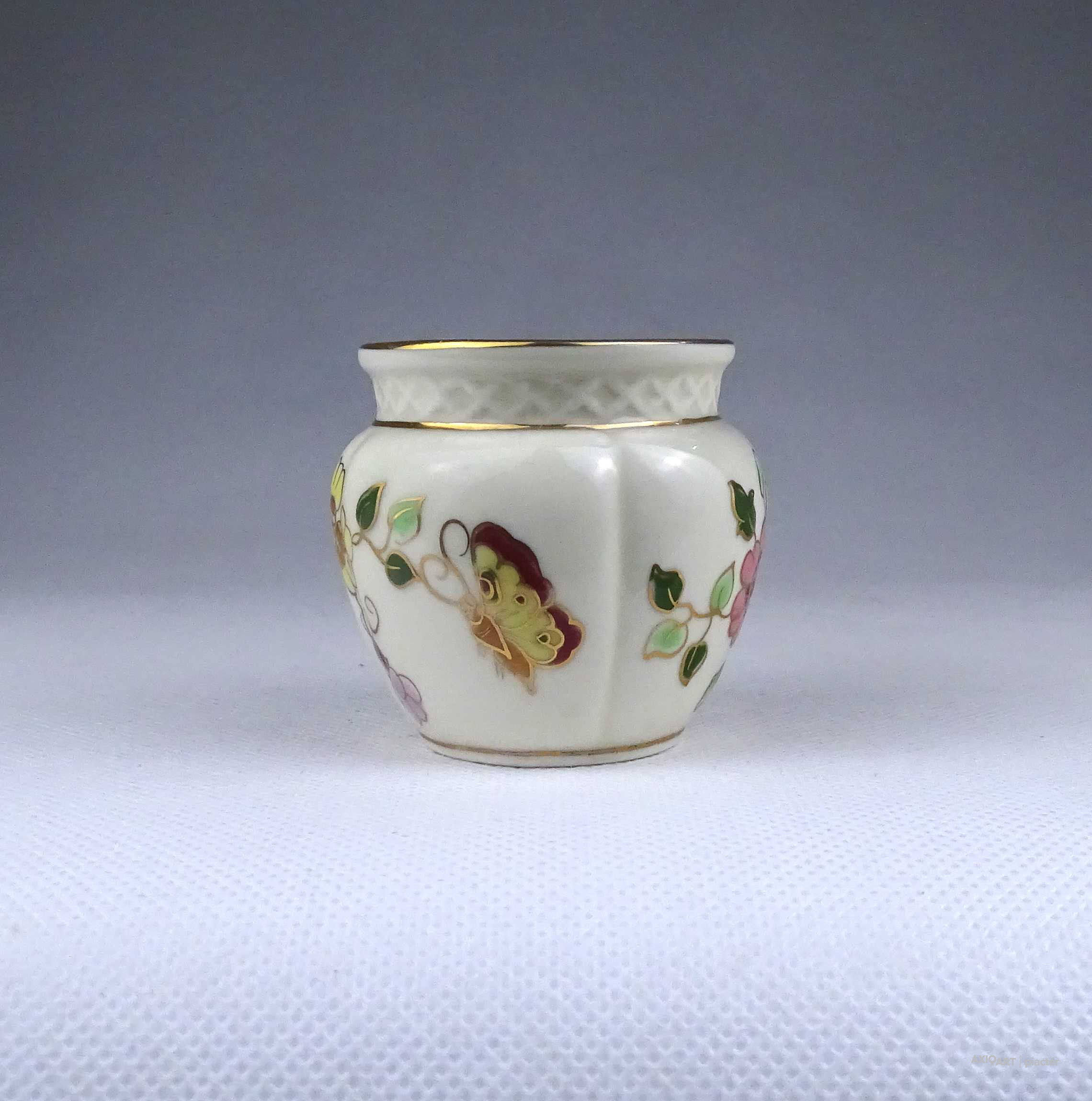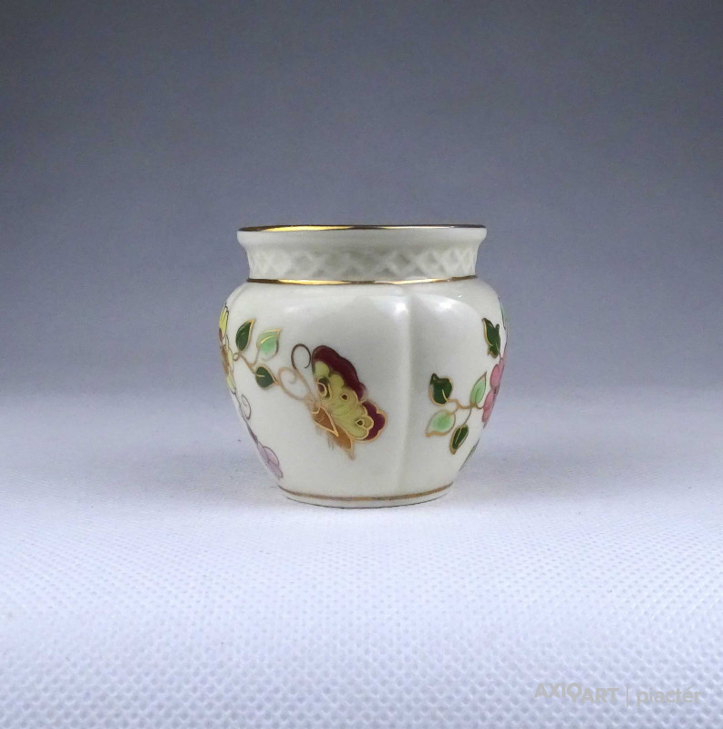 Régi, hibátlan állapotú, jelzett, vajszínű, aranyozással gazdagon díszített, pillangó mintás, gerezdes porcelán kisváza, kis kaspó.