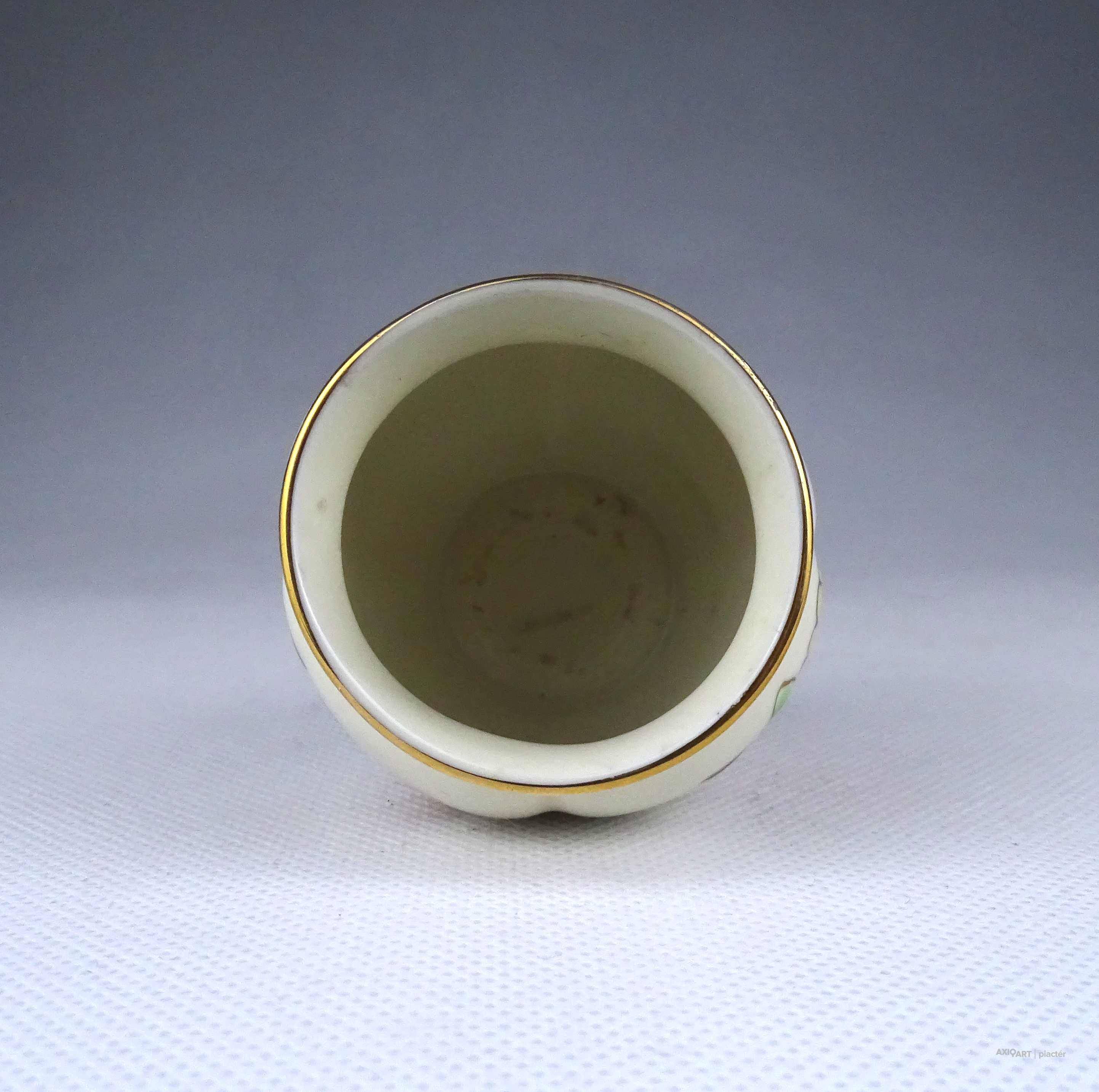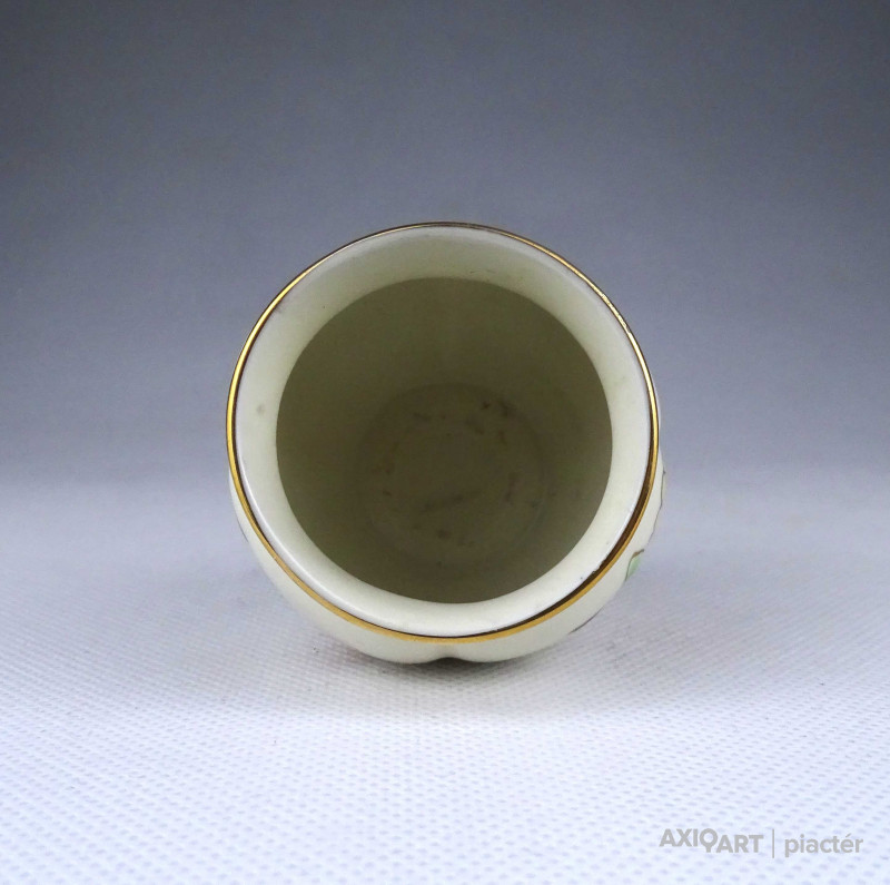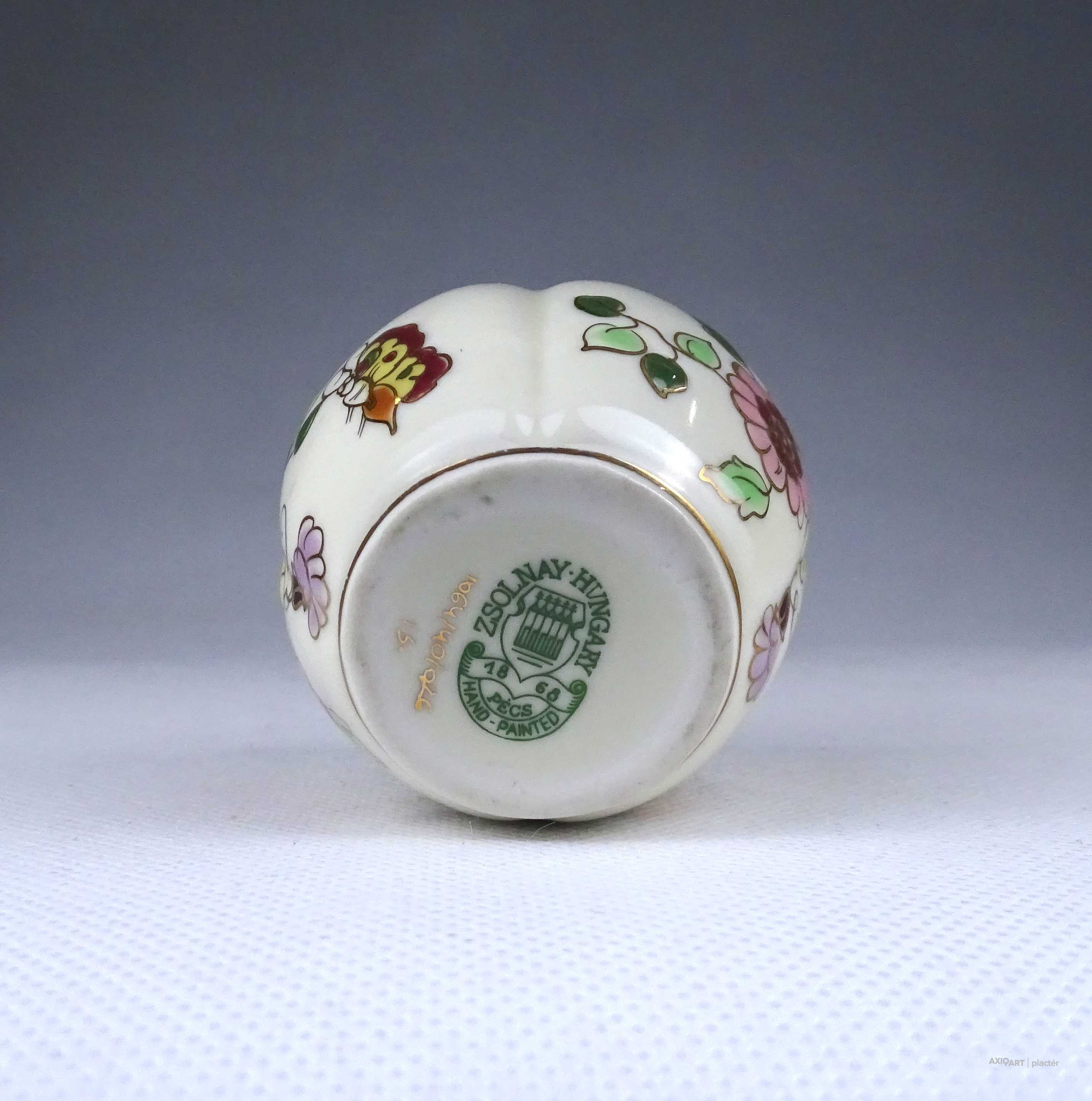 [1Z711/Z008] Régi, hibátlan állapotú, jelzett, vajszínű, aranyozással gazdagon díszített, pillangó mintás, gerezdes porcelán kisváza, kis kaspó. Alján zöld színű Zsolnay öttornyú márkajelzés: ZSOLNAY HUNGARY 1868 PÉCS HAND-PAINTED Arannyal formaszám: 1064/40/026 13 Magasság: 6 cm Szélesség: 6.3 cm Súly: 0.065 kg