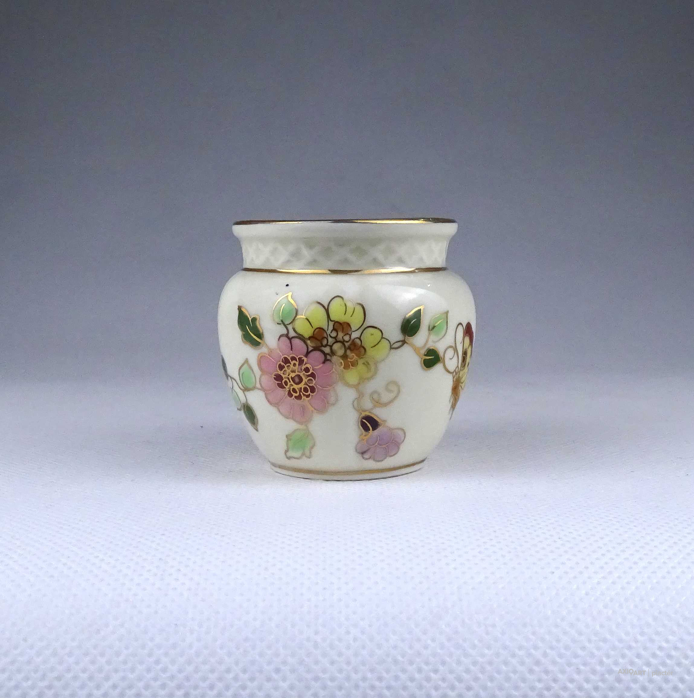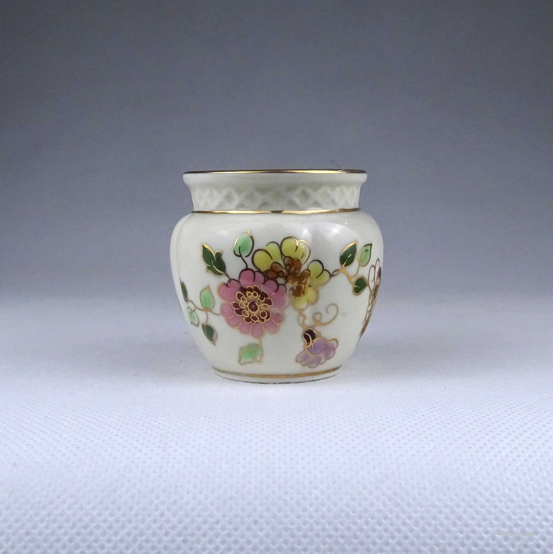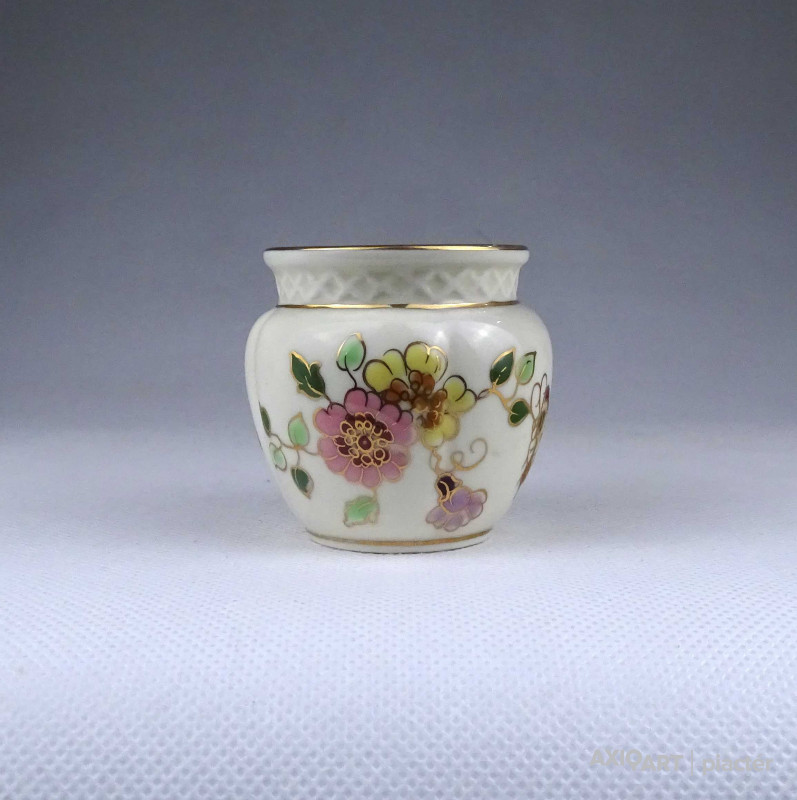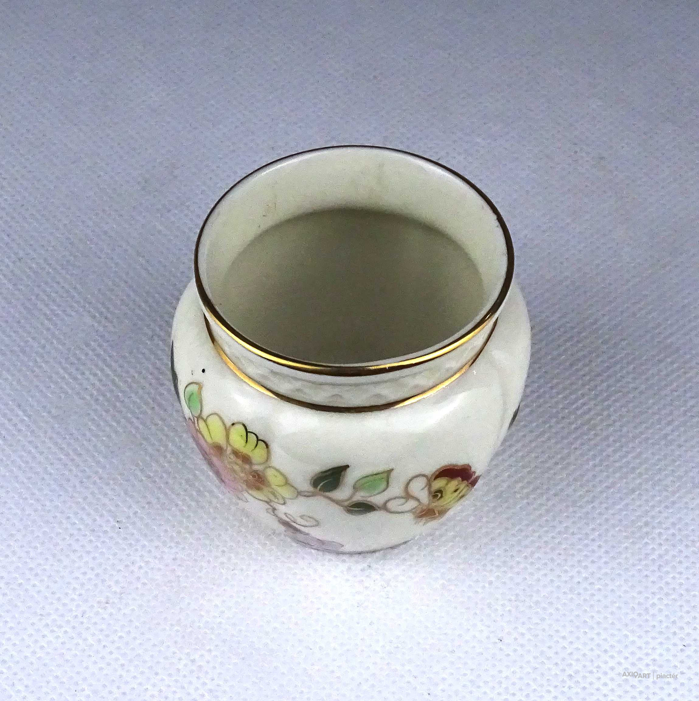 [1Z711/Z008] Régi, hibátlan állapotú, jelzett, vajszínű, aranyozással gazdagon díszített, pillangó mintás, gerezdes porcelán kisváza, kis kaspó. Alján zöld színű Zsolnay öttornyú márkajelzés: ZSOLNAY HUNGARY 1868 PÉCS HAND-PAINTED Arannyal formaszám: 1064/40/026 13 Magasság: 6 cm Szélesség: 6.3 cm Súly: 0.065 kg
