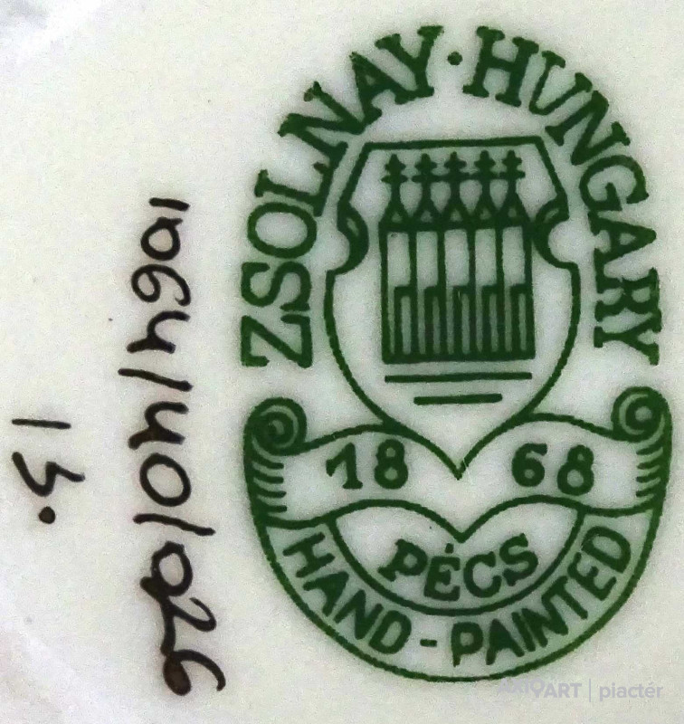 Alján zöld színű Zsolnay öttornyú márkajelzés: