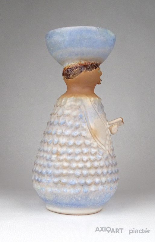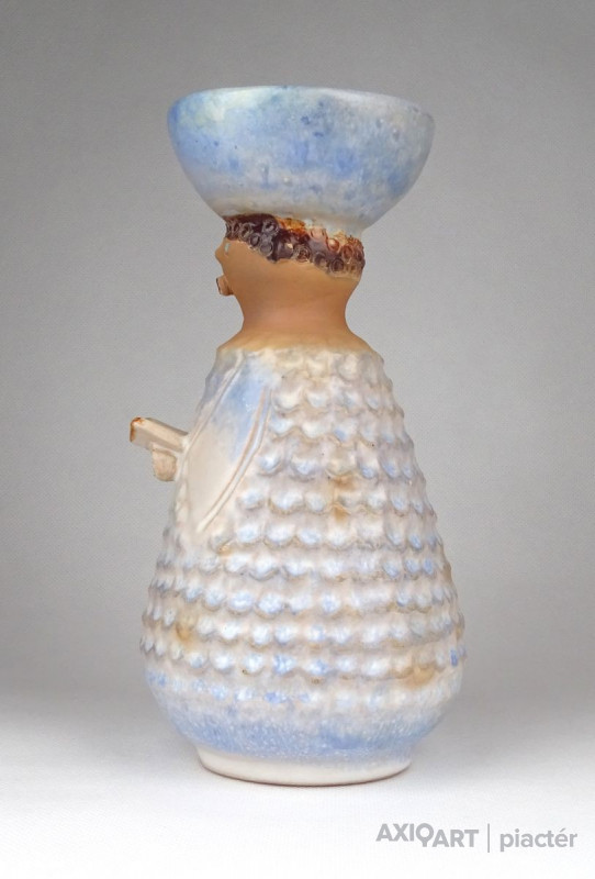 [0U704/BX-9] Hibátlan állapotú, jelzett, háromalakos kerámia figurális mécsestartó figura. Jelzés: KISS ROÓZ Magasság: 19 cm Szélesség: 6 cm Hosszúság: 16 cm Súly: 0.639 kg Kiss Roóz Ilona keramikus Születési hely: Szatmárnémeti [Satu Mare, RO] Születési dátum: 1920 Kiállítások az adatbázisban:  Kiss Roóz Ilona életműkiállítása Mesterei: Orbán Antal, Ohmann Béla. 1939-43: Iparművészeti Iskola, mesterei: Orbán Antal, Ohmann Béla. 1956, 1962: Munkácsy-díj; 1980: érdemes művész; 1984: SZOT-díj; 1994: MSZOSZ díja; 1995: Magyar Köztársasági Érdemrend Középkeresztje. A magyar kerámia Kovács Margit által teremtett naiv-népies irányzatának jeles művelője. Edényeit, kisplasztikáit, ill. murális alkotásait vidám színvilág és kedves humor jellemzi. 1948 és 1952 között tanított az Iparművészeti Főiskolán, azóta szabadfoglalkozású. Egyéni kiállítások 1966 • Csók Galéria, Budapest 1971 • Csók Galéria, Budapest 1980 • Budavári Ipaművészeti Bolt, Budapest 1984 • Petőfi Művelődési Ház, Tiszaluc 1989 • Kispréposti Palota, Eger (állandó kiállítás) 1992 • Bécs 1995 • Minigaléria, Miskolc 1996 • Petőfi Művelődési Ház, Tiszaluc 1997 • Derkovits Művelődési Központ, Tiszaújváros. Válogatott csoportos kiállítások 1947 • Karácsonyi kiállítás, Budapest • Fővárosi Művelődési Központ 1952 • Iparművészeti kiállítás, Ernst Múzeum, Budapest 1956 • Iparművészeti kiállítás, Iparművészeti Múzeum, Budapest 1958 • Magyar kerámia kiállítás, Vallauris 1959 • Magyar képzőművésznők kiállítása, Ernst Múzeum, Budapest 1959 • IV. Országos Iparművészeti Kiállítás, Műcsarnok, Budapest 1963 • Modern magyar kerámia, Royal Festival Hall, London 1965 • Országos Iparművészeti Kiállítás, Műcsarnok, Budapest 1968, 1970 • I., II. Országos Kerámia Biennálé, Pécs 1973 • Magyar kerámia, Ankara, Isztambul 1975 • Tárgy és alkotója, Iparművészeti Múzeum, Budapest 1982 • Magyar kézműves kerámia, Siklós 1995 • XX. századi magyar keramikusok, Iparművészeti Múzeum, Budapest • Az agyag mesterei, Vigadó Galéria, Budapest 1998 • Őszi Kerámia Kiállítás, Olaf Palme Ház, Budapest Művek közgyűjteményekben Köztéri művei kerámia dombormű (1958, Pereces, bölcsőde) kerámia napóra (1959, Székesfehérvár, Béke téri iskola) csempeburkolat (1961, Szeged, rendelőintézet) falikép (kerámia, 1962, Sopron, Gyermekszanatórium) kerámia falikép (1966, Békéscsaba, bölcsőde) Irodalom GÁL J.: ~ 77 éves. Beszélgetés a művésszel, Magyar Iparművészet, 1997/4. KESZTHELYI K.-LACZKÓ I.: A magyar kerámiaművészet I., Alkotók, adatok 1945-1998, Budapest, 1999. Vadas József + MAOE Forrás: artportal.hu