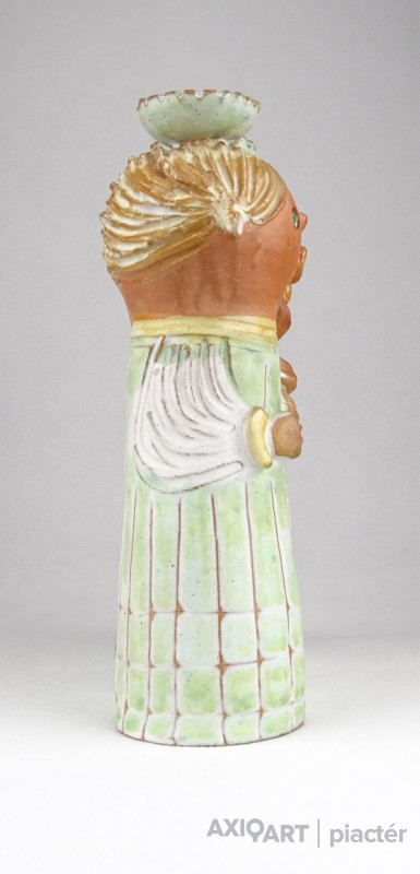 [0P105/X010] Szép állapotú, jelzett gyertyatartó kerámia figura. Jelzés: KRI 17 HUNGARY Magasság: 16.5 cm Szélesség: 11 cm Súly: 0.531 kg Kiss Roóz Ilona keramikus Születési hely: Szatmárnémeti [Satu Mare, RO] Születési dátum: 1920 Kiállítások az adatbázisban:  Kiss Roóz Ilona életműkiállítása Mesterei: Orbán Antal, Ohmann Béla. 1939-43: Iparművészeti Iskola, mesterei: Orbán Antal, Ohmann Béla. 1956, 1962: Munkácsy-díj; 1980: érdemes művész; 1984: SZOT-díj; 1994: MSZOSZ díja; 1995: Magyar Köztársasági Érdemrend Középkeresztje. A magyar kerámia Kovács Margit által teremtett naiv-népies irányzatának jeles művelője. Edényeit, kisplasztikáit, ill. murális alkotásait vidám színvilág és kedves humor jellemzi. 1948 és 1952 között tanított az Iparművészeti Főiskolán, azóta szabadfoglalkozású. Egyéni kiállítások 1966 • Csók Galéria, Budapest 1971 • Csók Galéria, Budapest 1980 • Budavári Ipaművészeti Bolt, Budapest 1984 • Petőfi Művelődési Ház, Tiszaluc 1989 • Kispréposti Palota, Eger (állandó kiállítás) 1992 • Bécs 1995 • Minigaléria, Miskolc 1996 • Petőfi Művelődési Ház, Tiszaluc 1997 • Derkovits Művelődési Központ, Tiszaújváros. Válogatott csoportos kiállítások 1947 • Karácsonyi kiállítás, Budapest • Fővárosi Művelődési Központ 1952 • Iparművészeti kiállítás, Ernst Múzeum, Budapest 1956 • Iparművészeti kiállítás, Iparművészeti Múzeum, Budapest 1958 • Magyar kerámia kiállítás, Vallauris 1959 • Magyar képzőművésznők kiállítása, Ernst Múzeum, Budapest 1959 • IV. Országos Iparművészeti Kiállítás, Műcsarnok, Budapest 1963 • Modern magyar kerámia, Royal Festival Hall, London 1965 • Országos Iparművészeti Kiállítás, Műcsarnok, Budapest 1968, 1970 • I., II. Országos Kerámia Biennálé, Pécs 1973 • Magyar kerámia, Ankara, Isztambul 1975 • Tárgy és alkotója, Iparművészeti Múzeum, Budapest 1982 • Magyar kézműves kerámia, Siklós 1995 • XX. századi magyar keramikusok, Iparművészeti Múzeum, Budapest • Az agyag mesterei, Vigadó Galéria, Budapest 1998 • Őszi Kerámia Kiállítás, Olaf Palme Ház, Budapest Művek közgyűjteményekben Köztéri művei kerámia dombormű (1958, Pereces, bölcsőde) kerámia napóra (1959, Székesfehérvár, Béke téri iskola) csempeburkolat (1961, Szeged, rendelőintézet) falikép (kerámia, 1962, Sopron, Gyermekszanatórium) kerámia falikép (1966, Békéscsaba, bölcsőde) Irodalom GÁL J.: ~ 77 éves. Beszélgetés a művésszel, Magyar Iparművészet, 1997/4. KESZTHELYI K.-LACZKÓ I.: A magyar kerámiaművészet I., Alkotók, adatok 1945-1998, Budapest, 1999. Vadas József + MAOE Forrás: artportal.hu